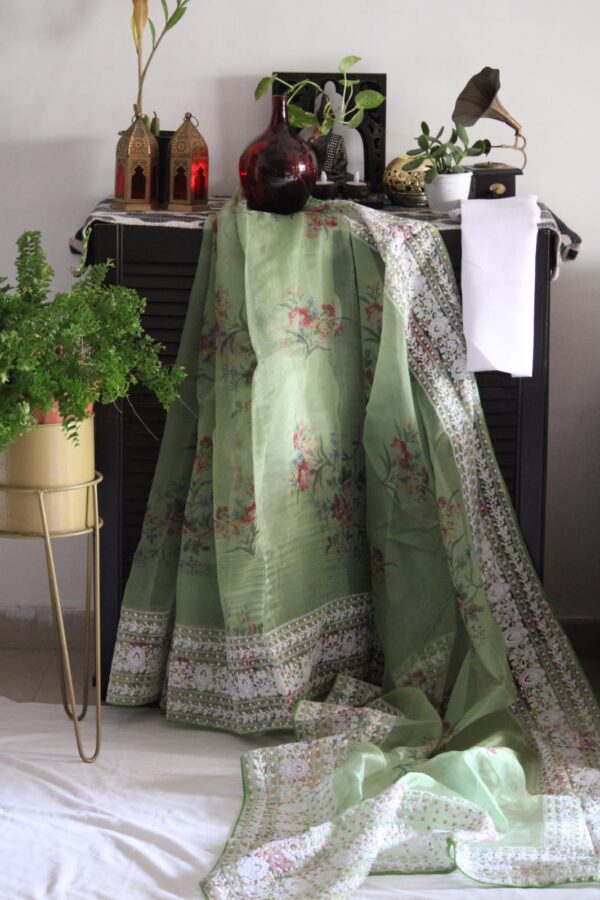 Pisctachio Khadi Organza Digital Print Floral Saree With Chikankari Viscose Thread Work