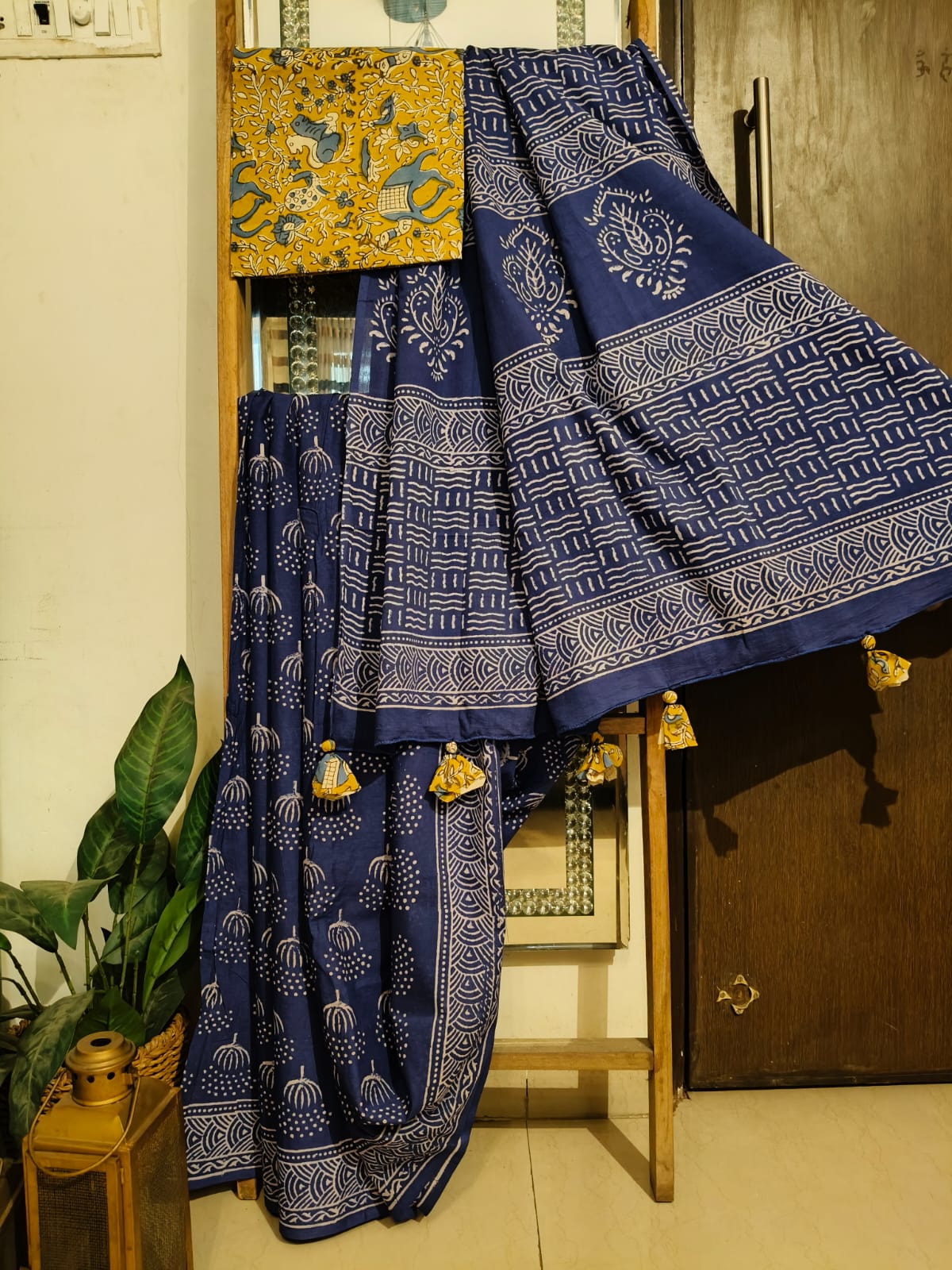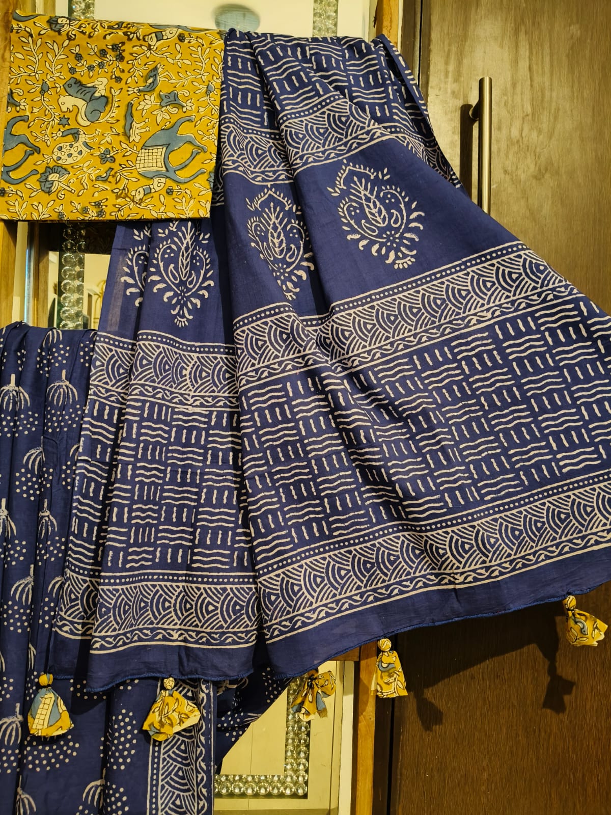 A Blue Bagru Handblock Printed Mul Cotton Saree paired with Blouse Fabric