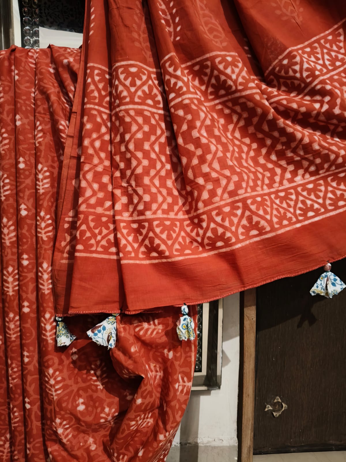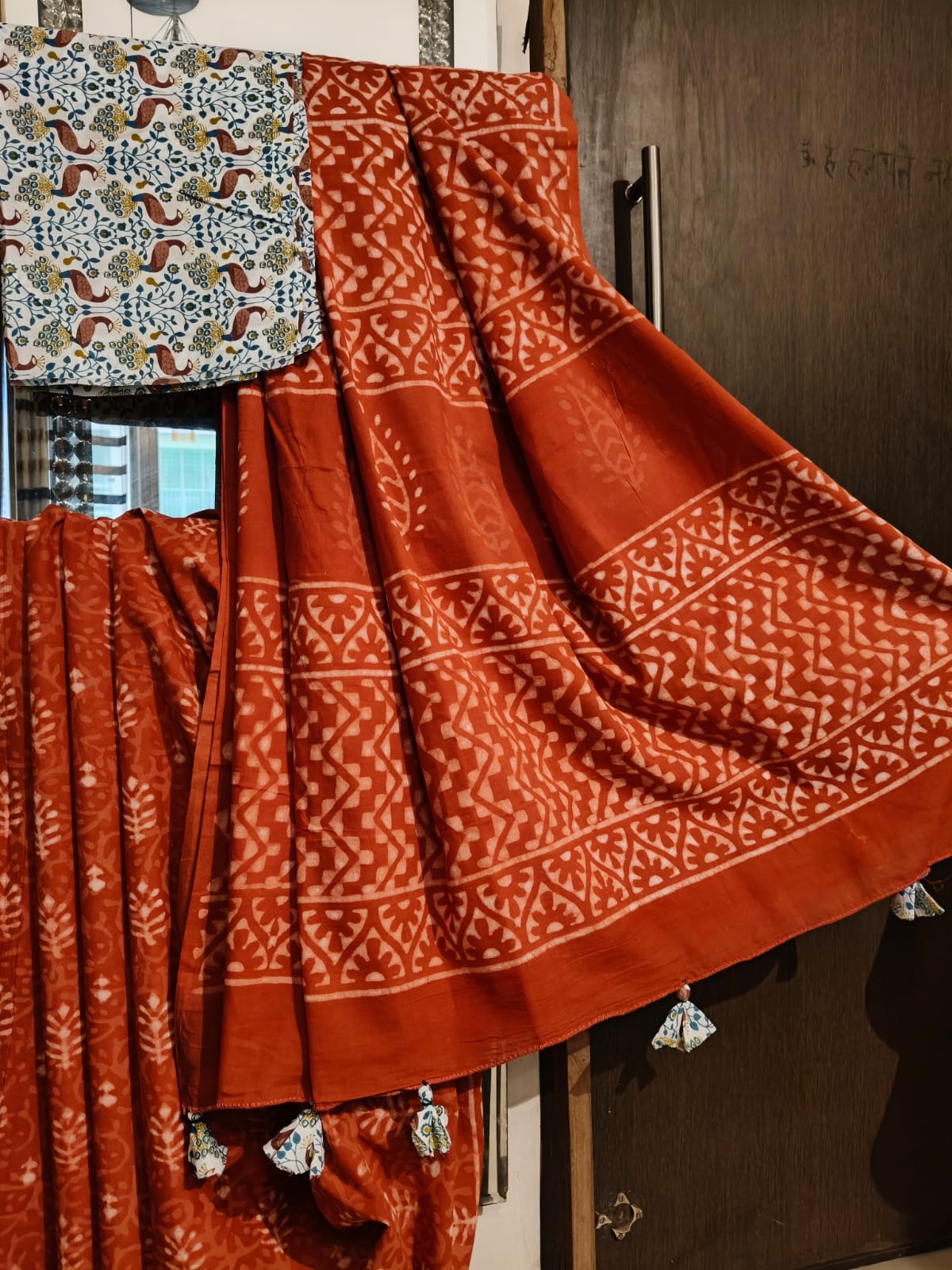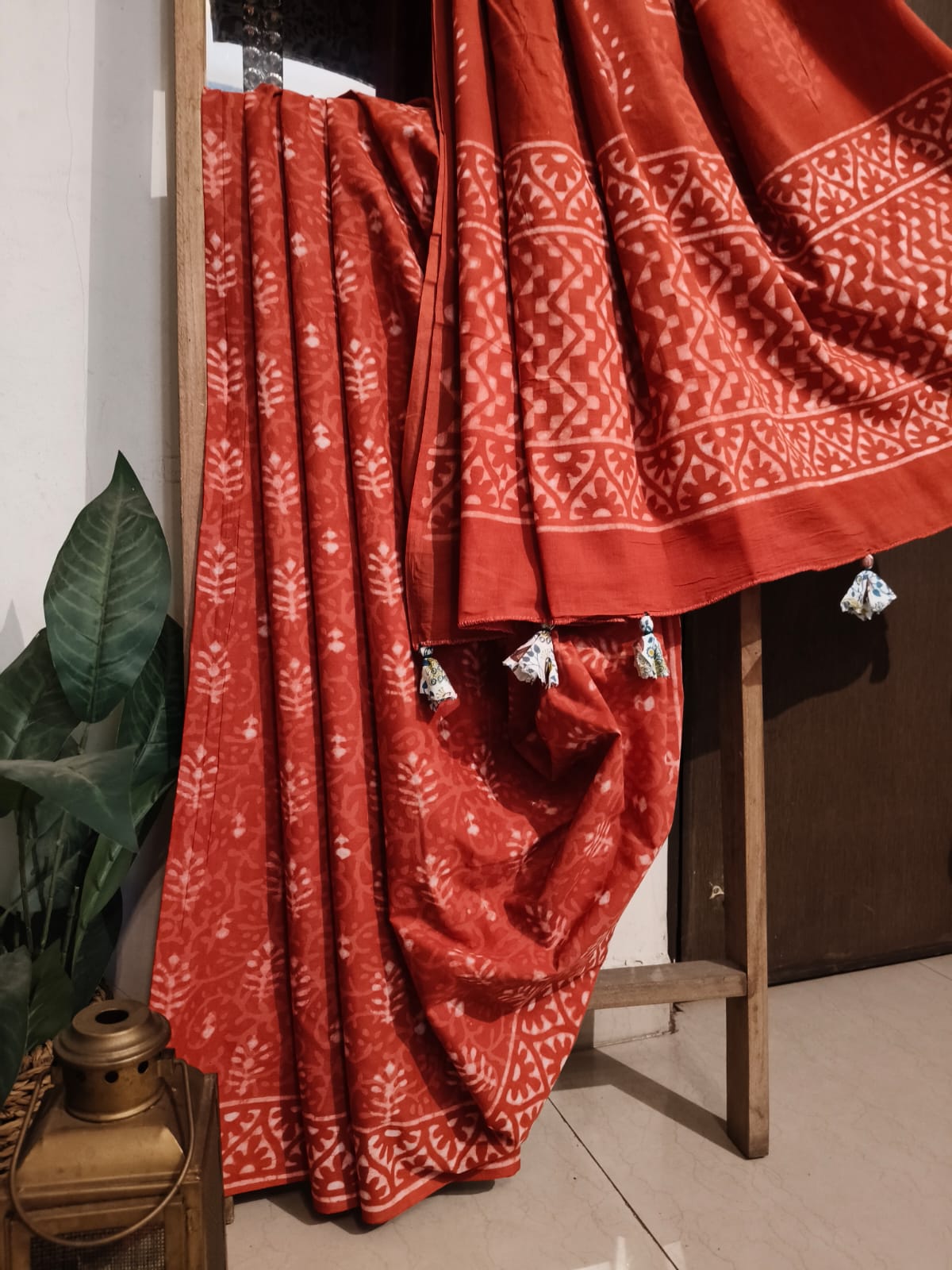 A Brick Red Bagru Handblock Printed Mul Cotton Saree paired with Blouse Fabric
