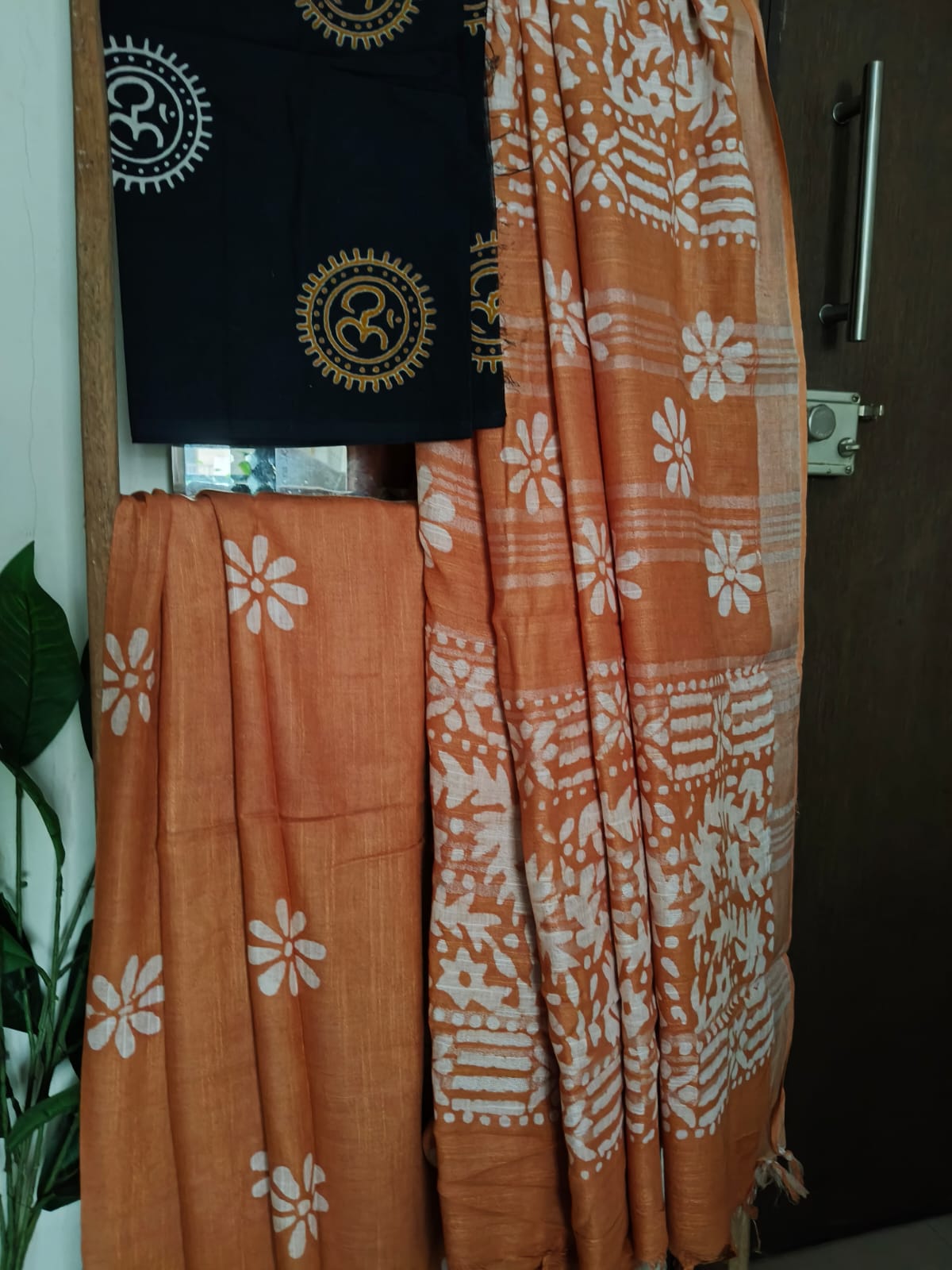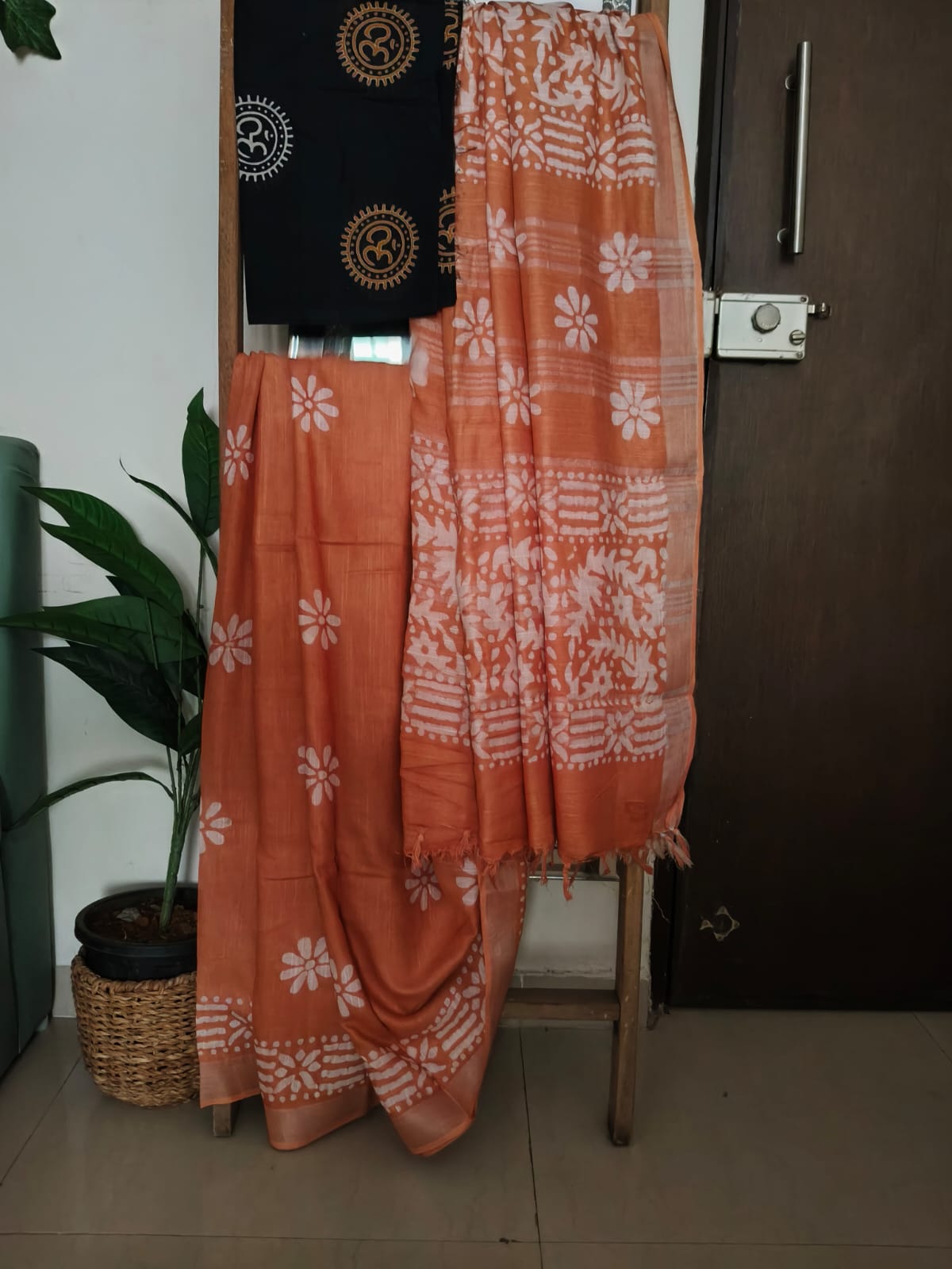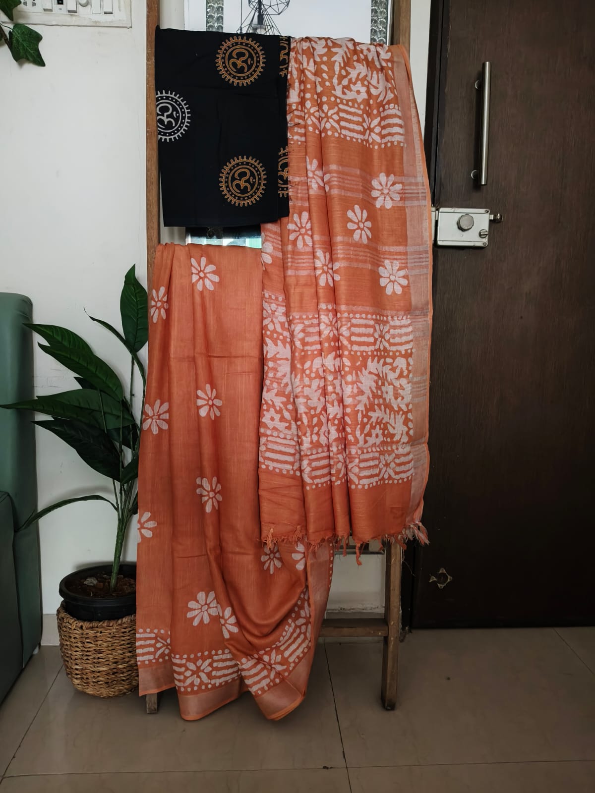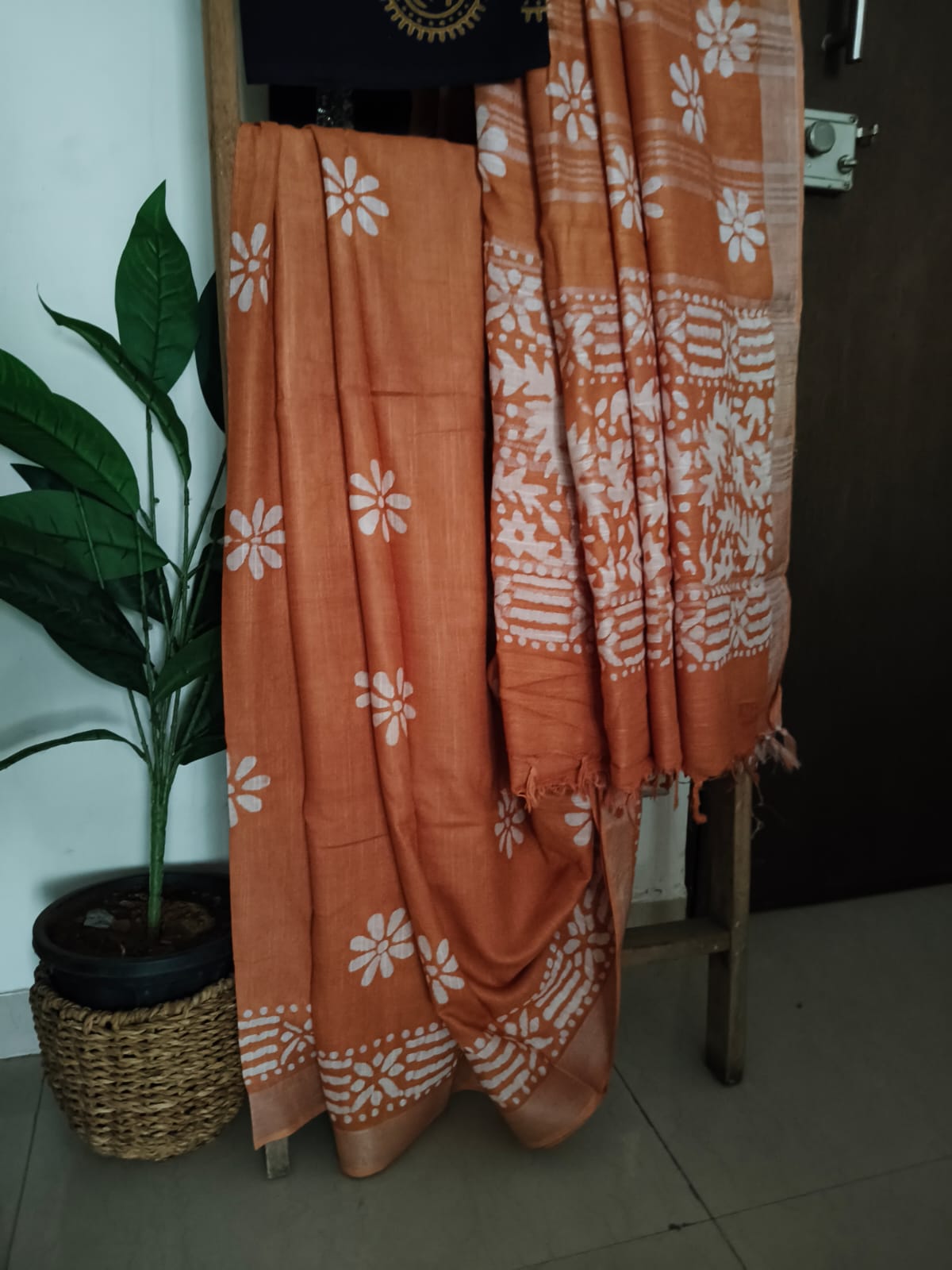 A Cinnamon Mocha Shade Batik print Linen Saree with Additional Blouse Fabric
