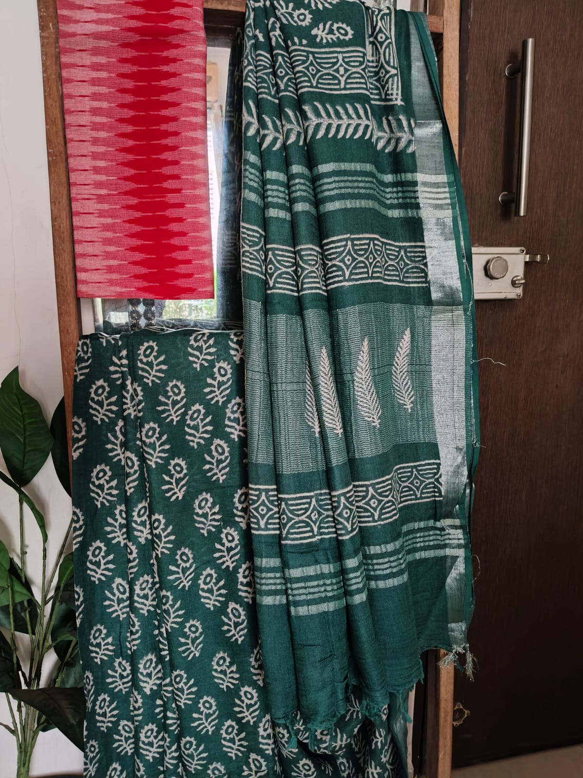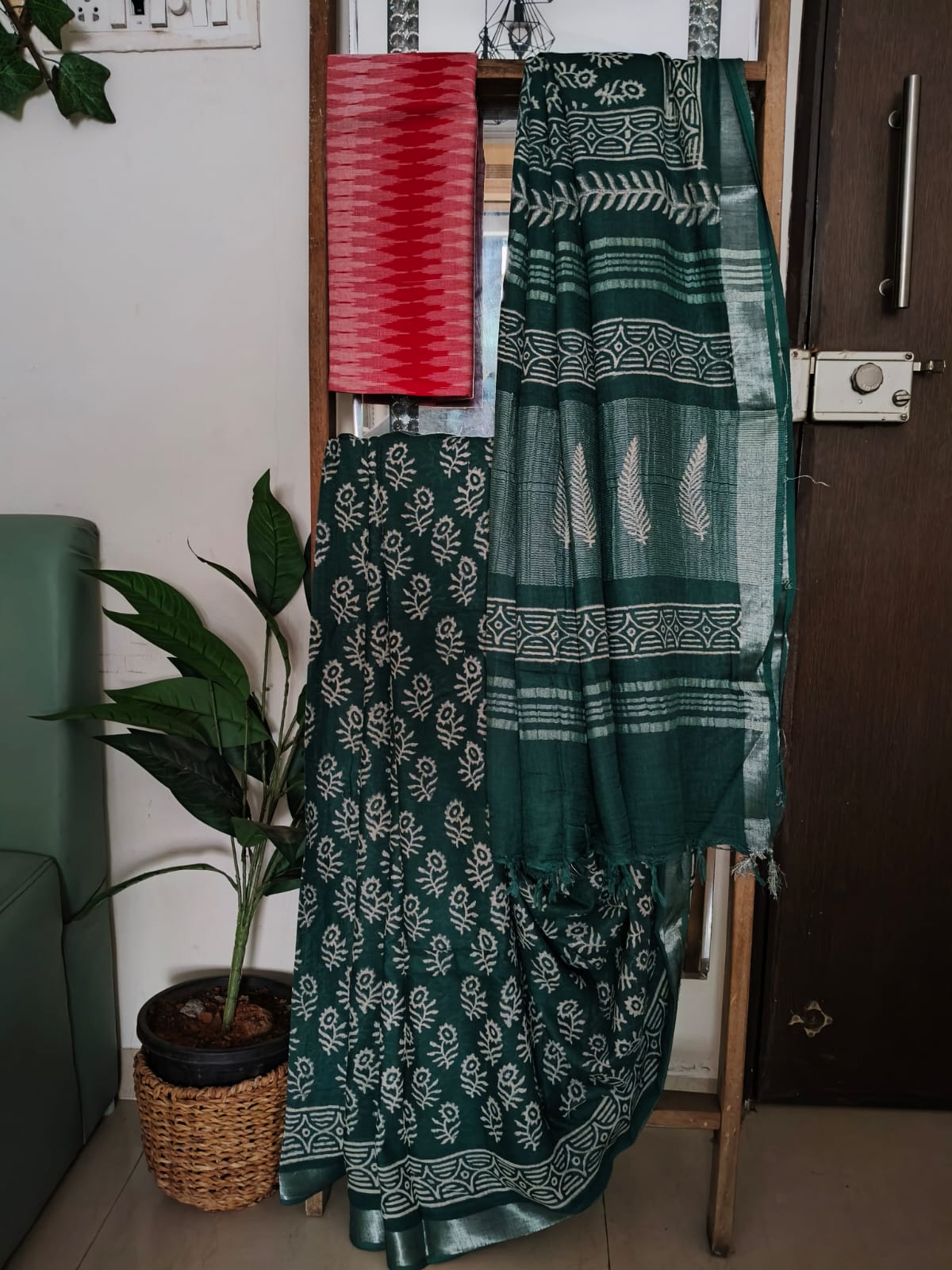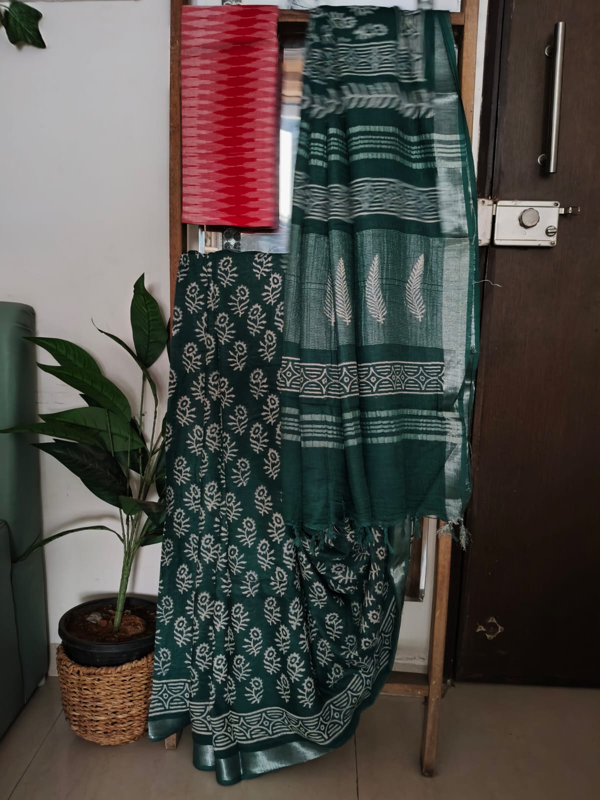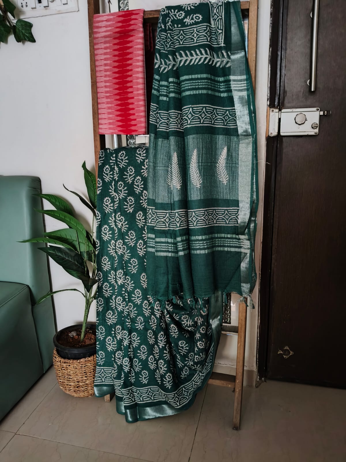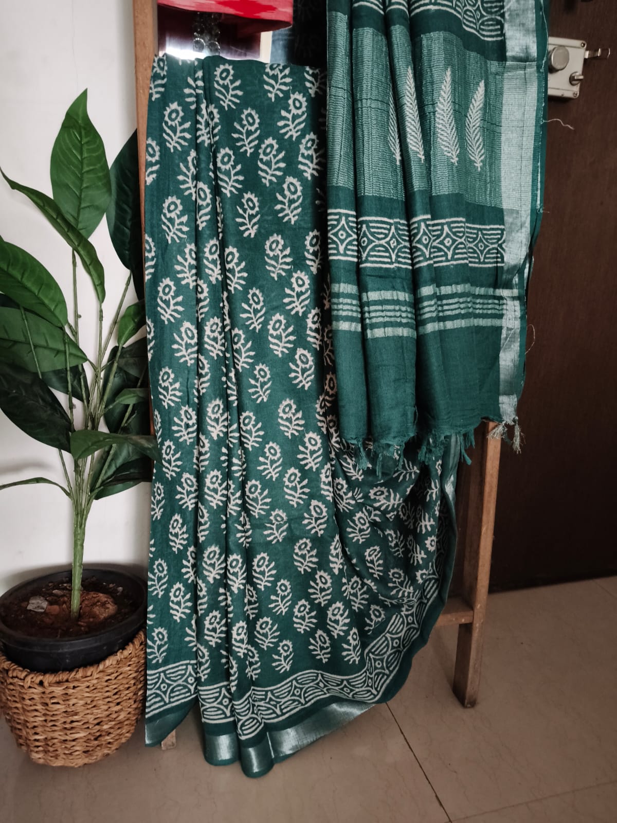 A Bottlegtreen Handblock print Linen Saree with Additional Blouse Fabric