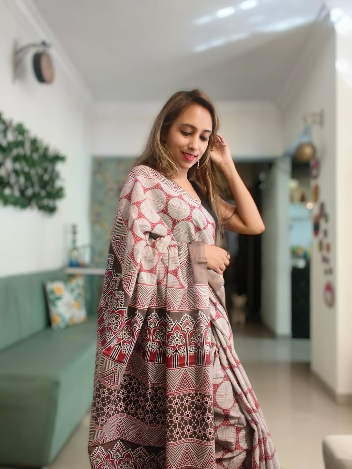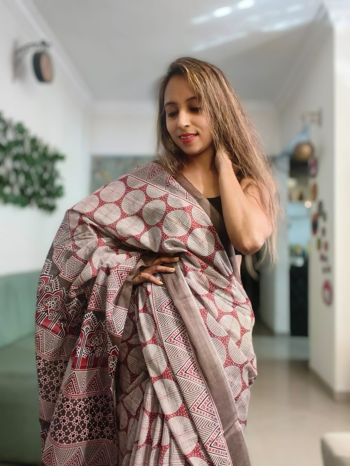 A Maroon Ajrakh Mul Cotton Saree with Blouse Piece