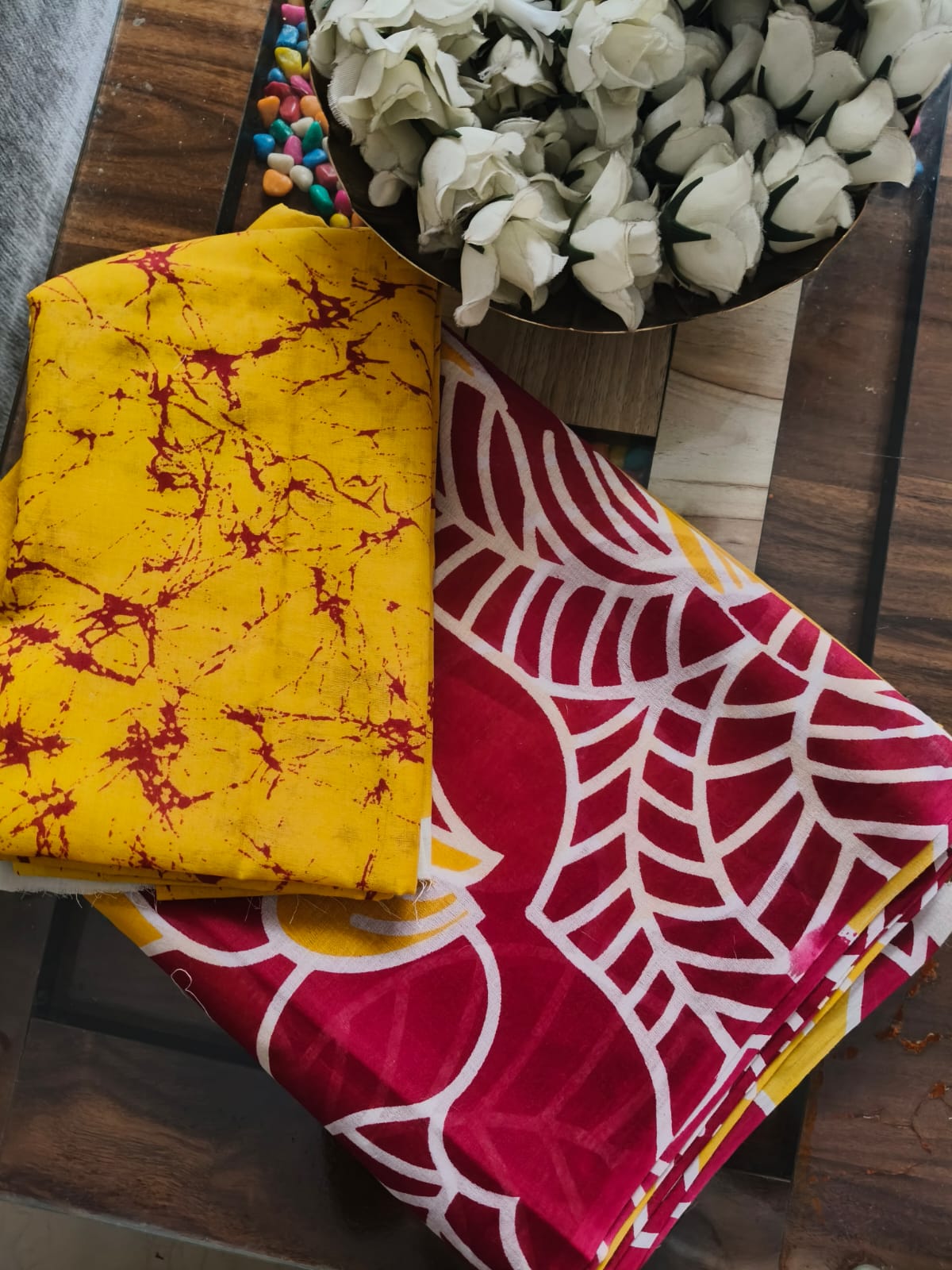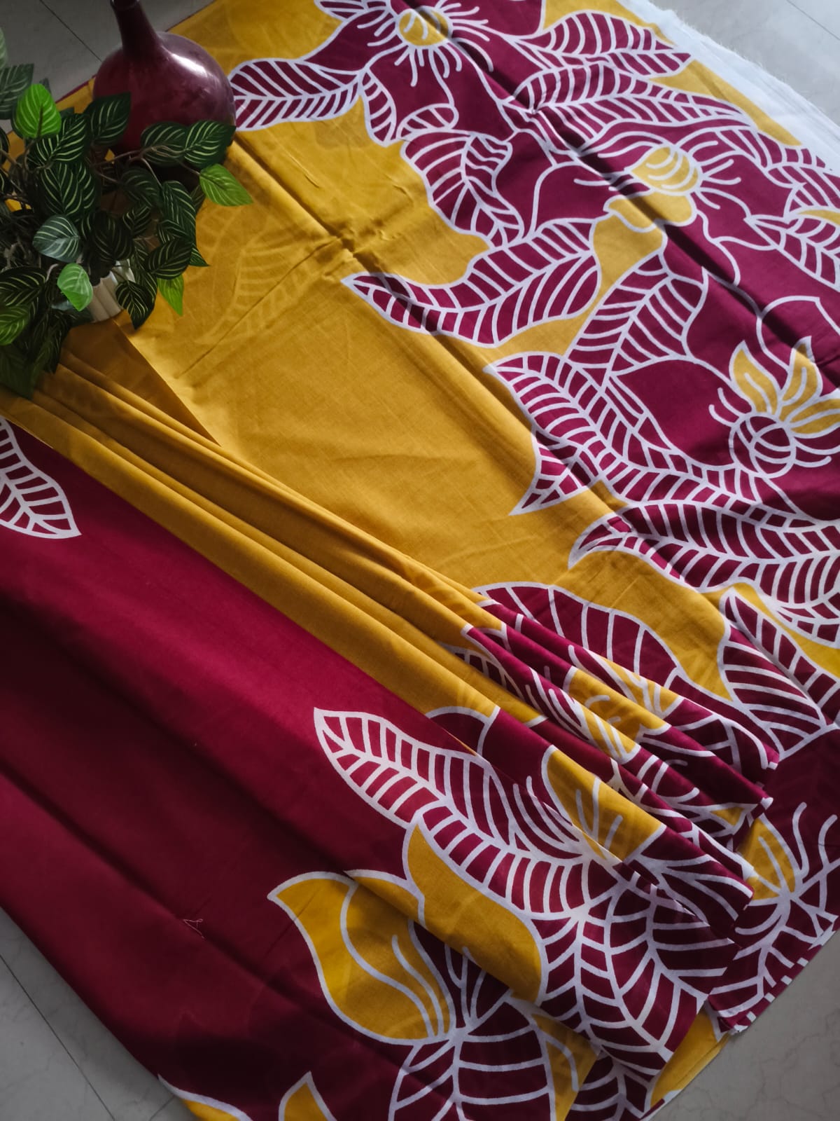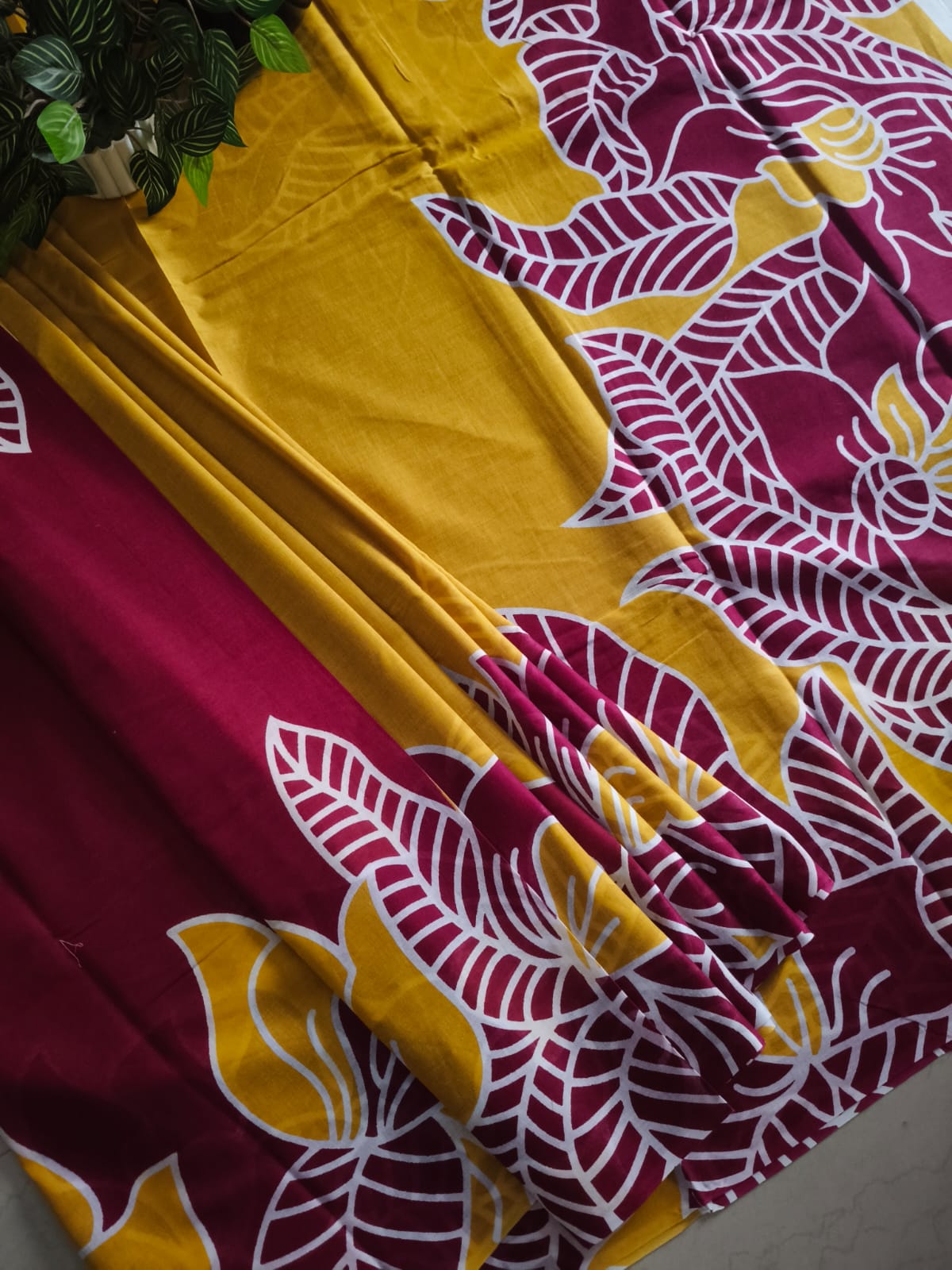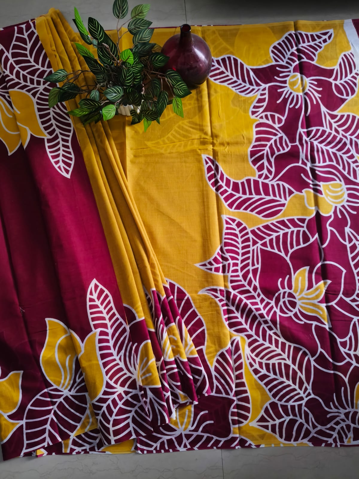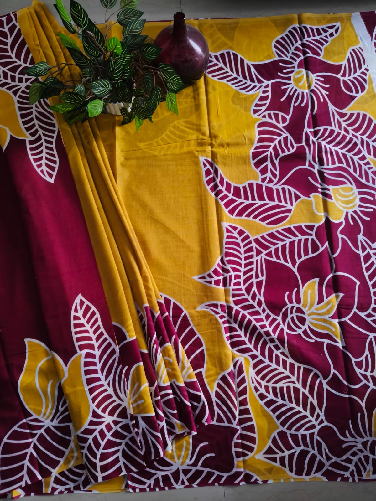 A Maroon And yellow Batik Mul Cotton Saree with Blouse Piece
