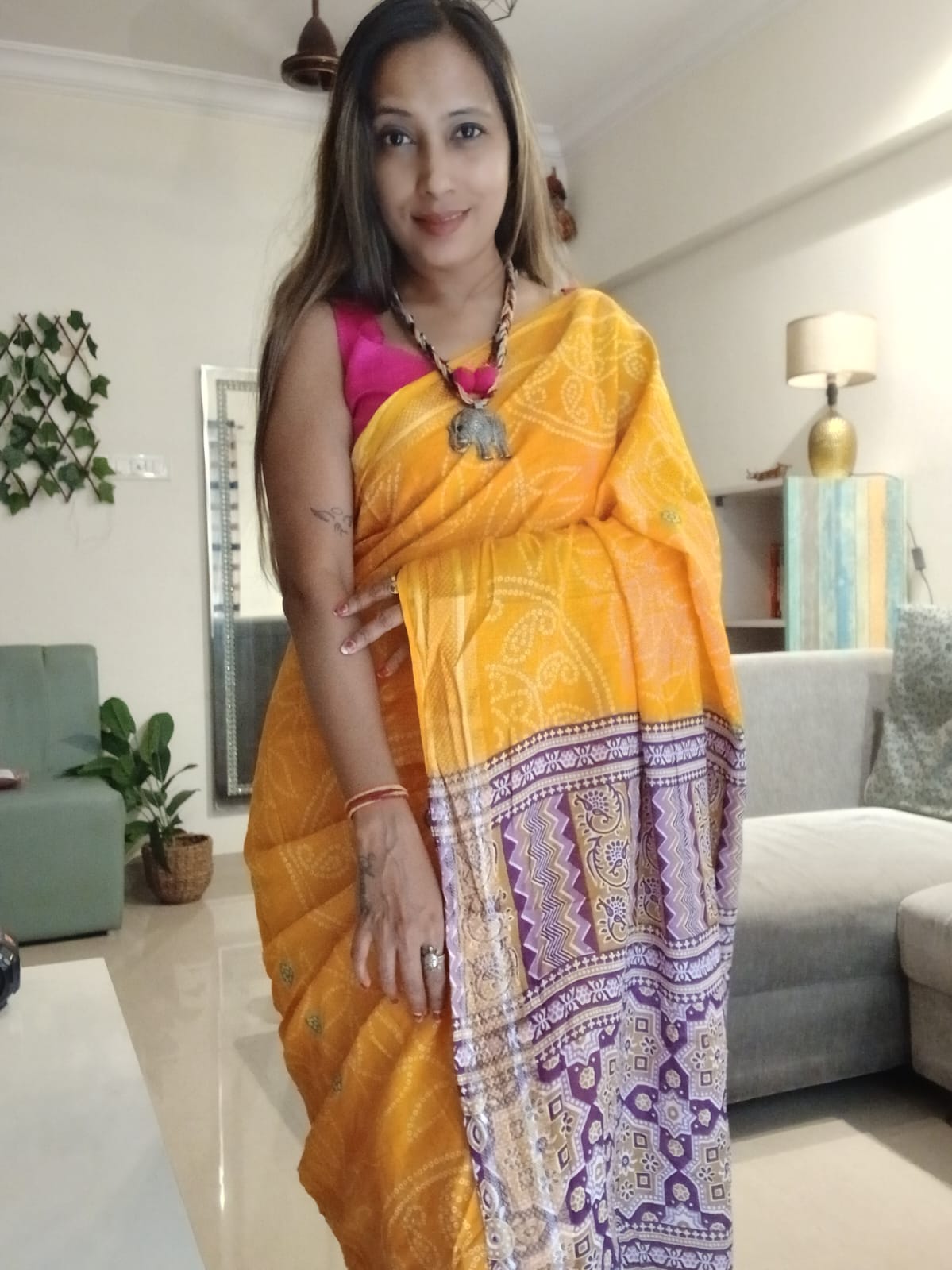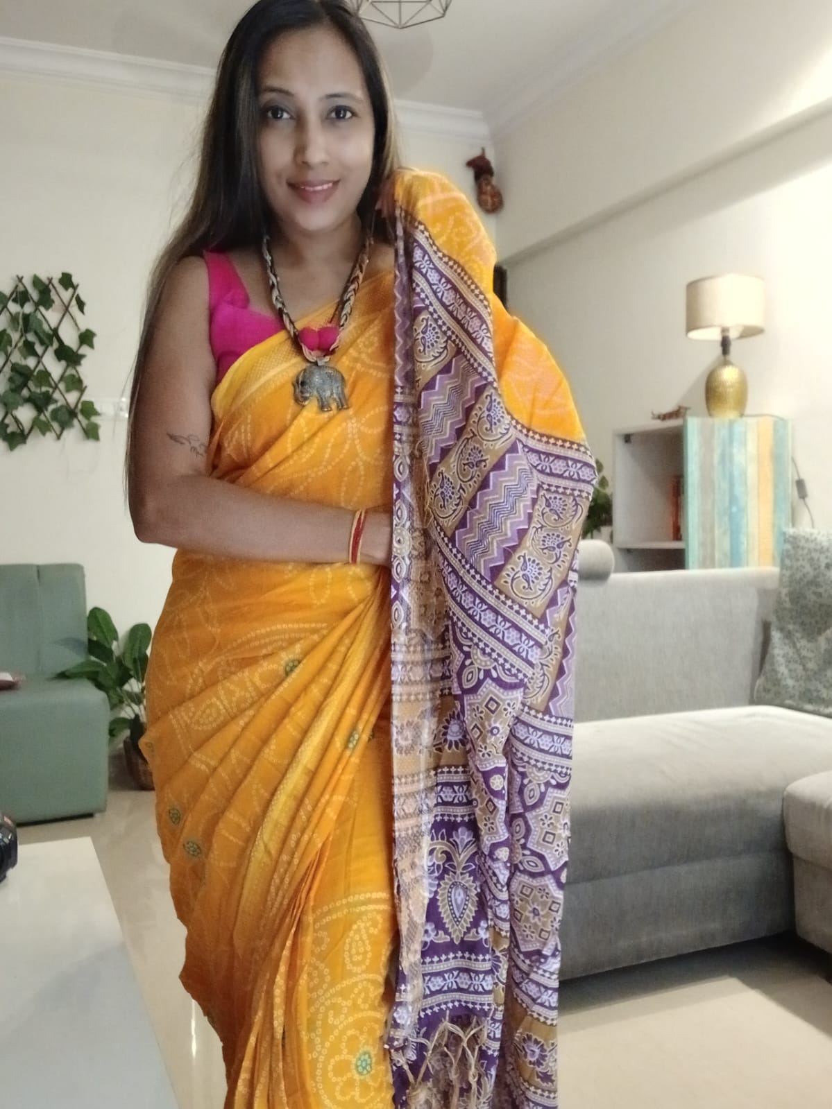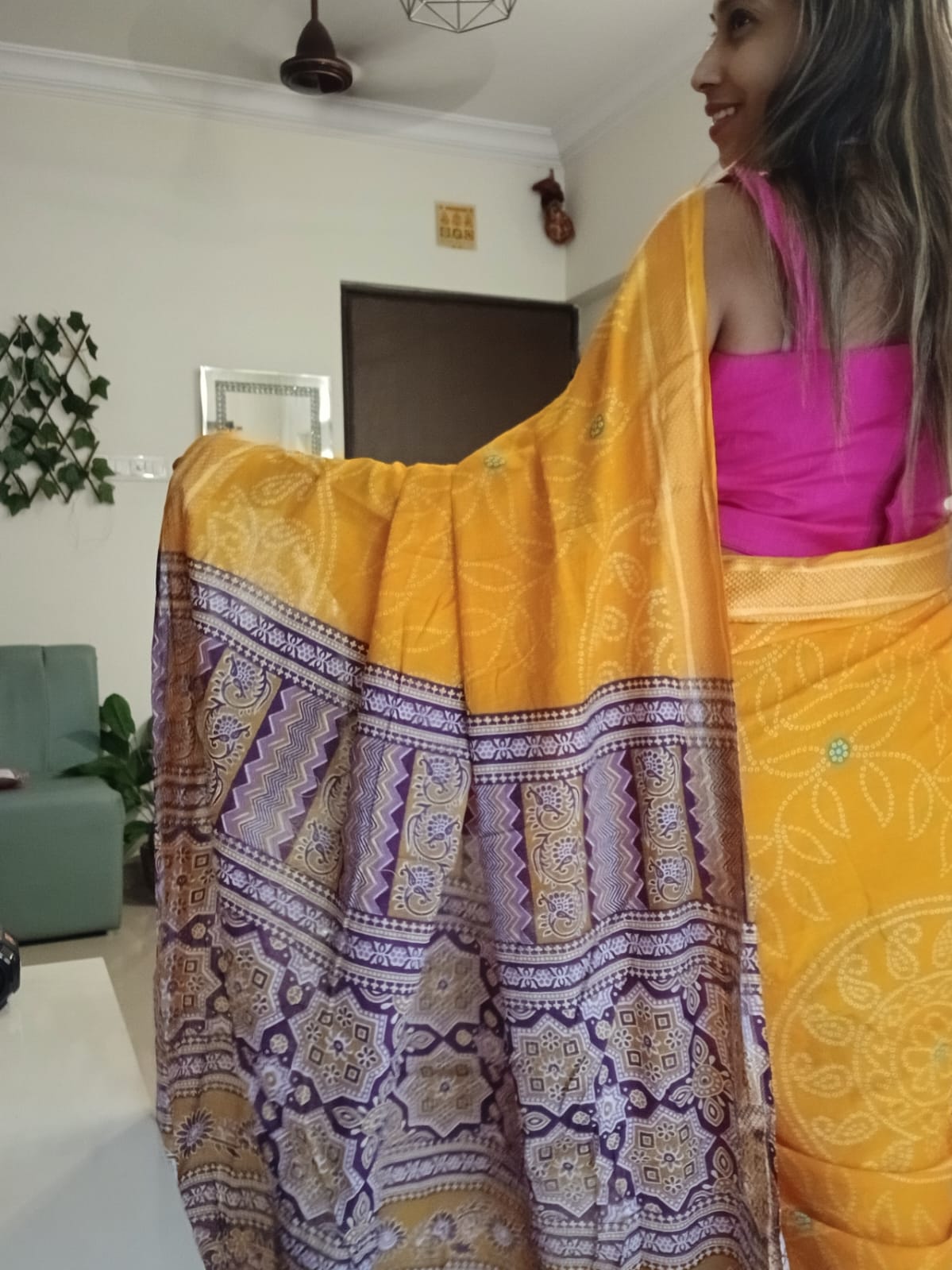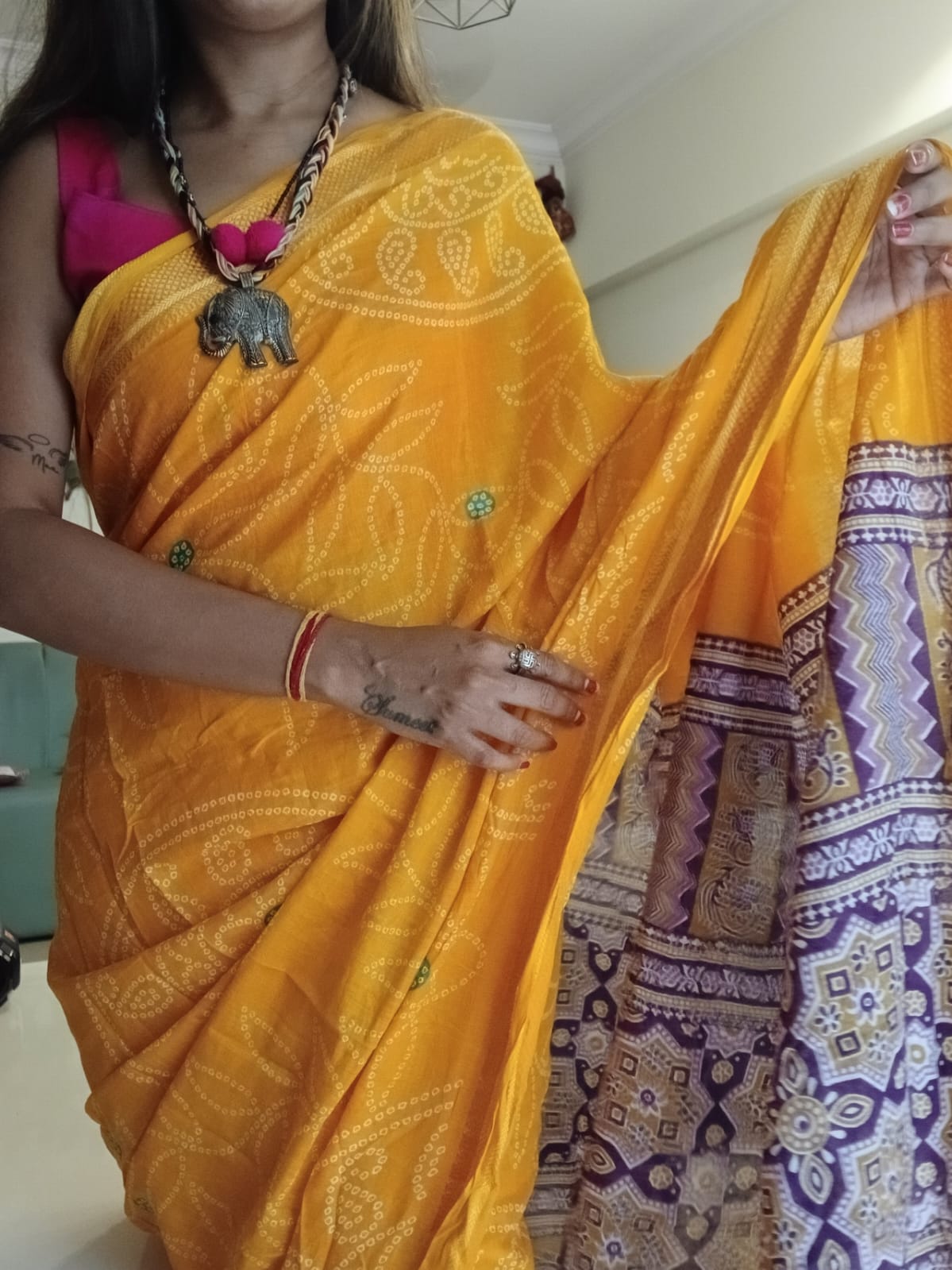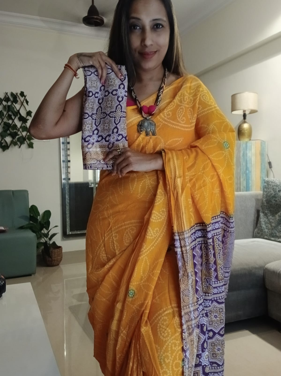 A Yellow Bandhani with Purple Ajrakh Pallu Saree. Paired with a Ajrakh Blouse Fabric.
