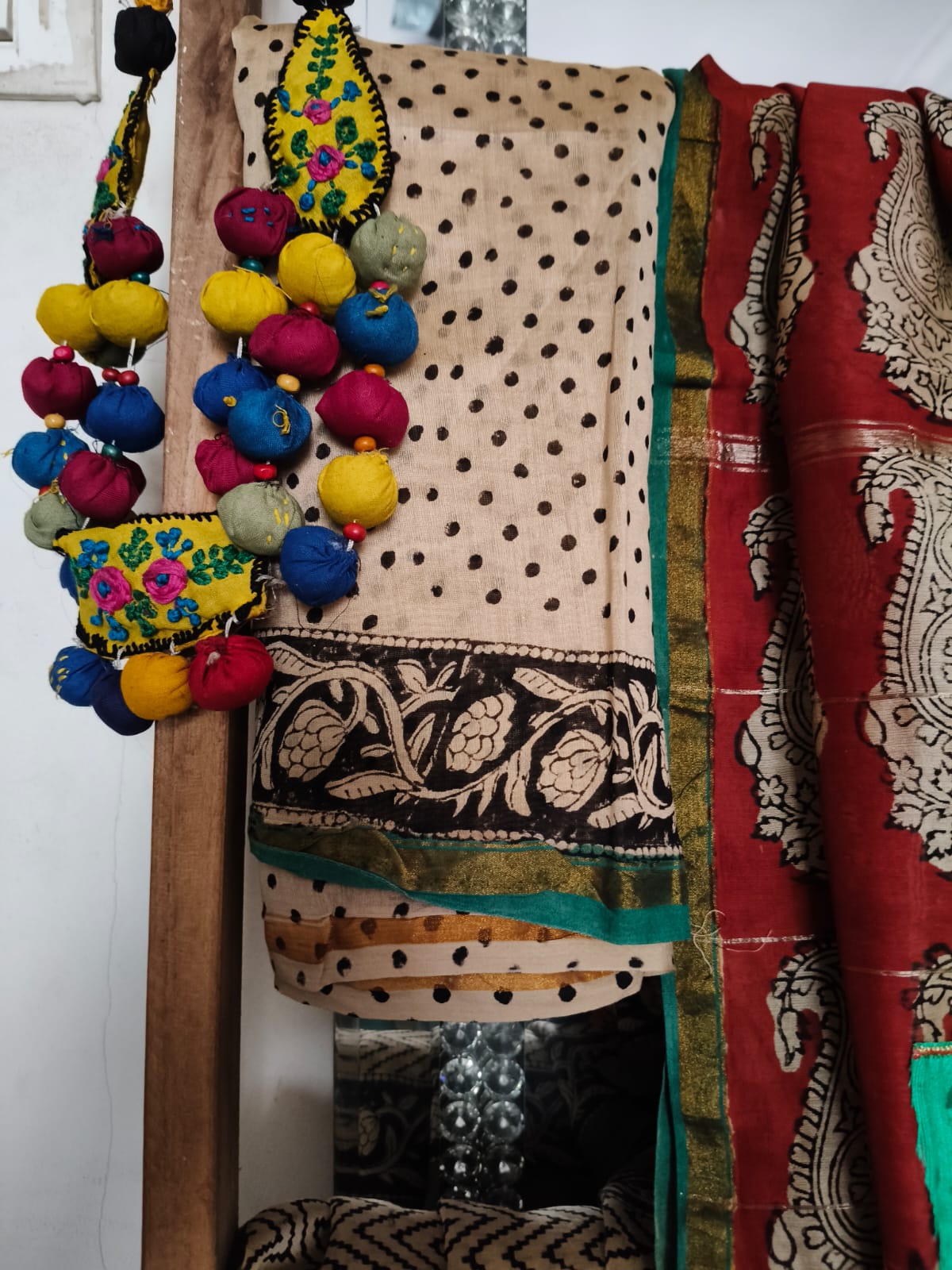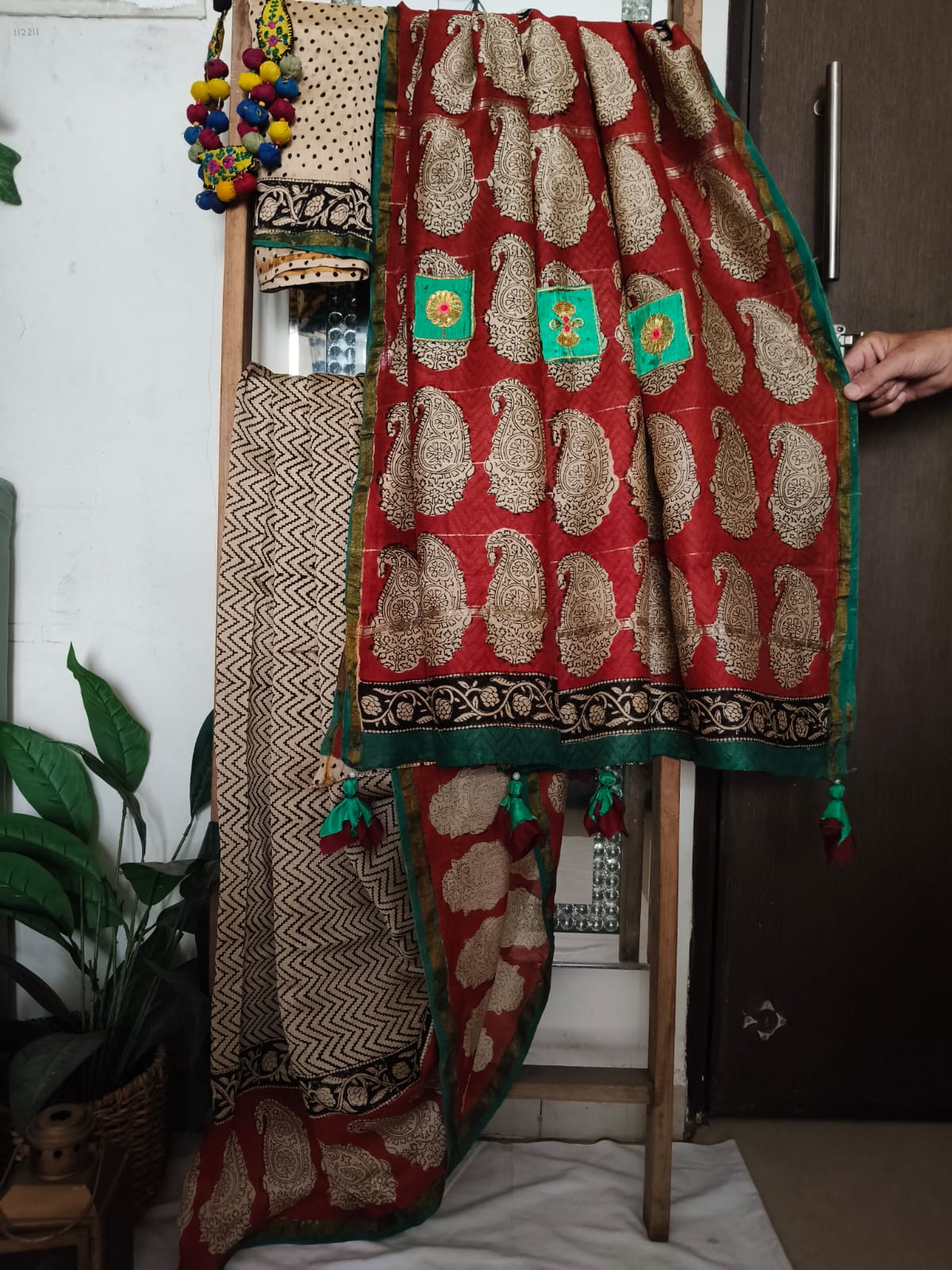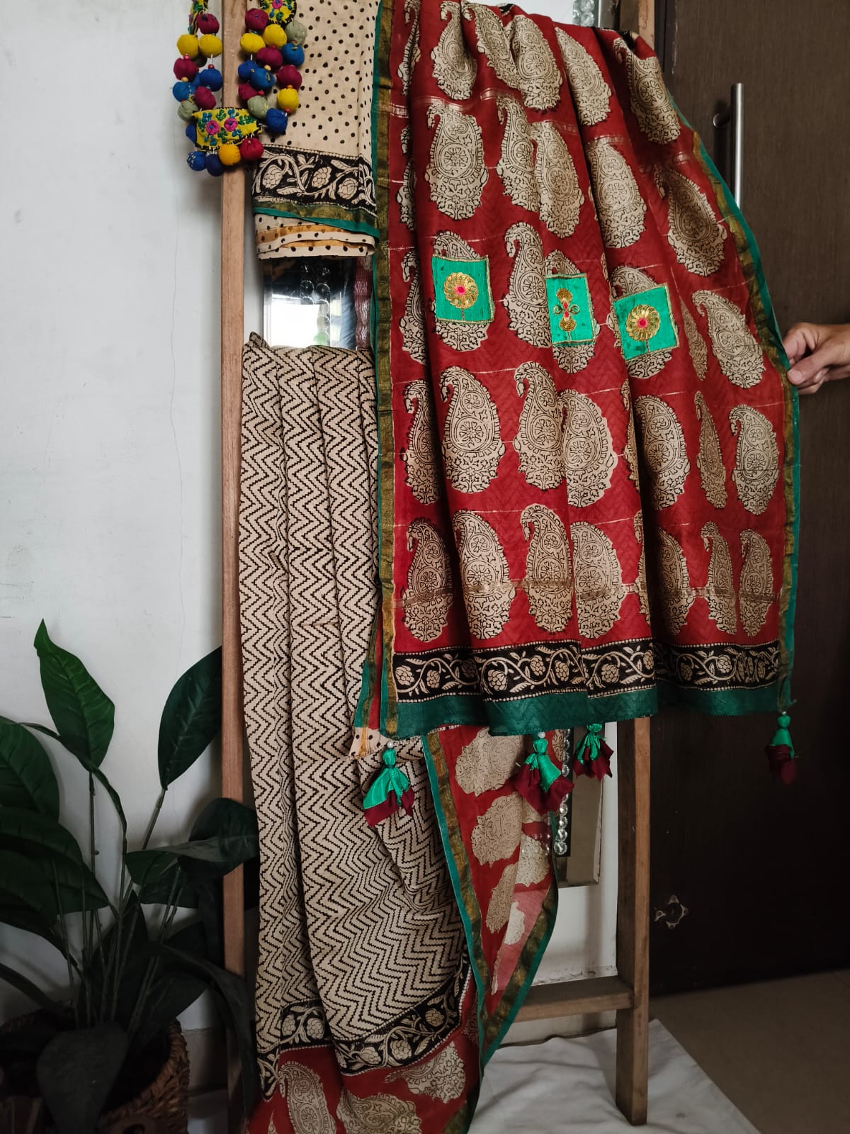 A Chevron Beige And Red Handblock Printed Chanderi Silk Saree with patchwork and tassels on the pallu. comes with Blouse Fabric