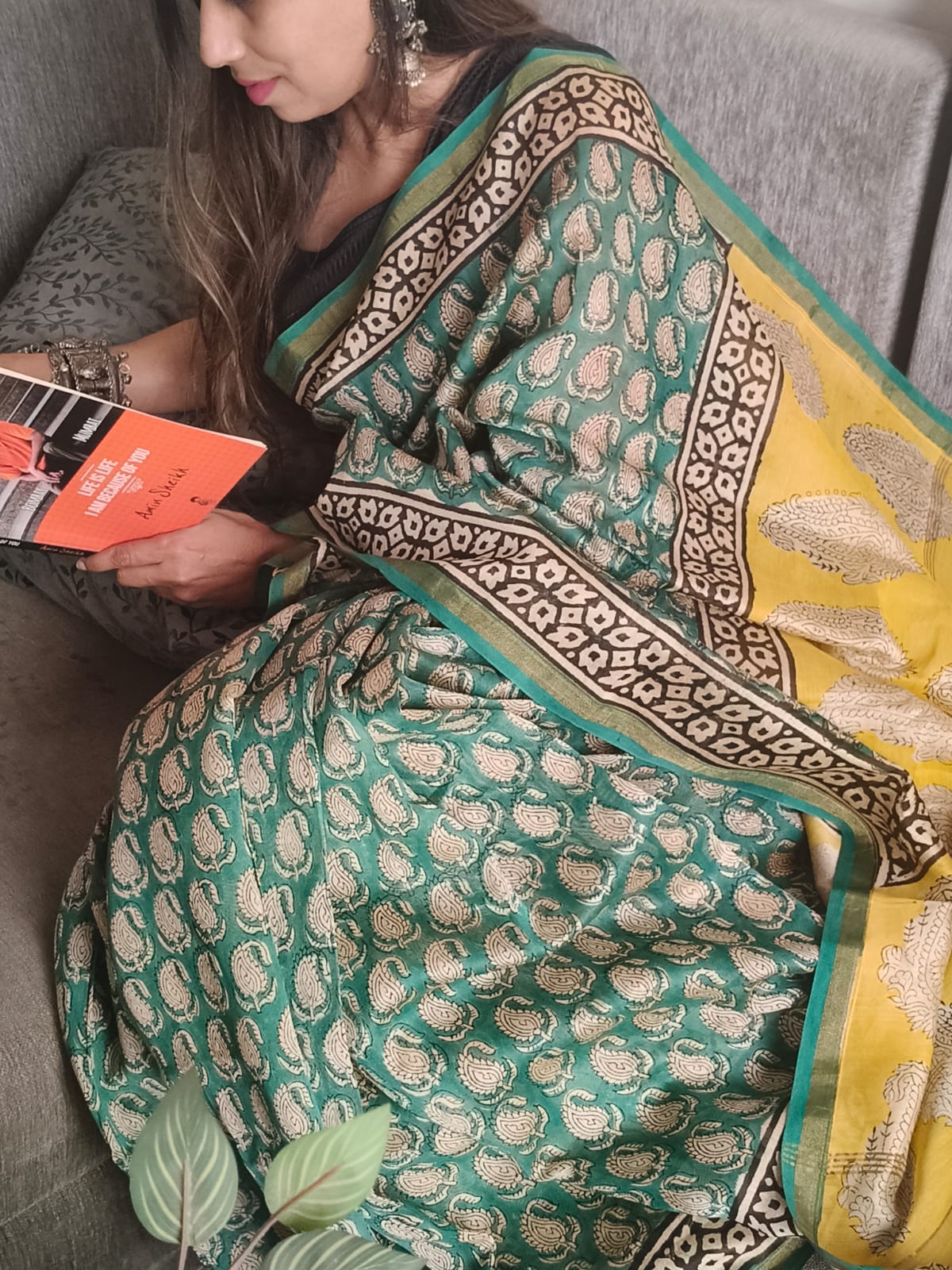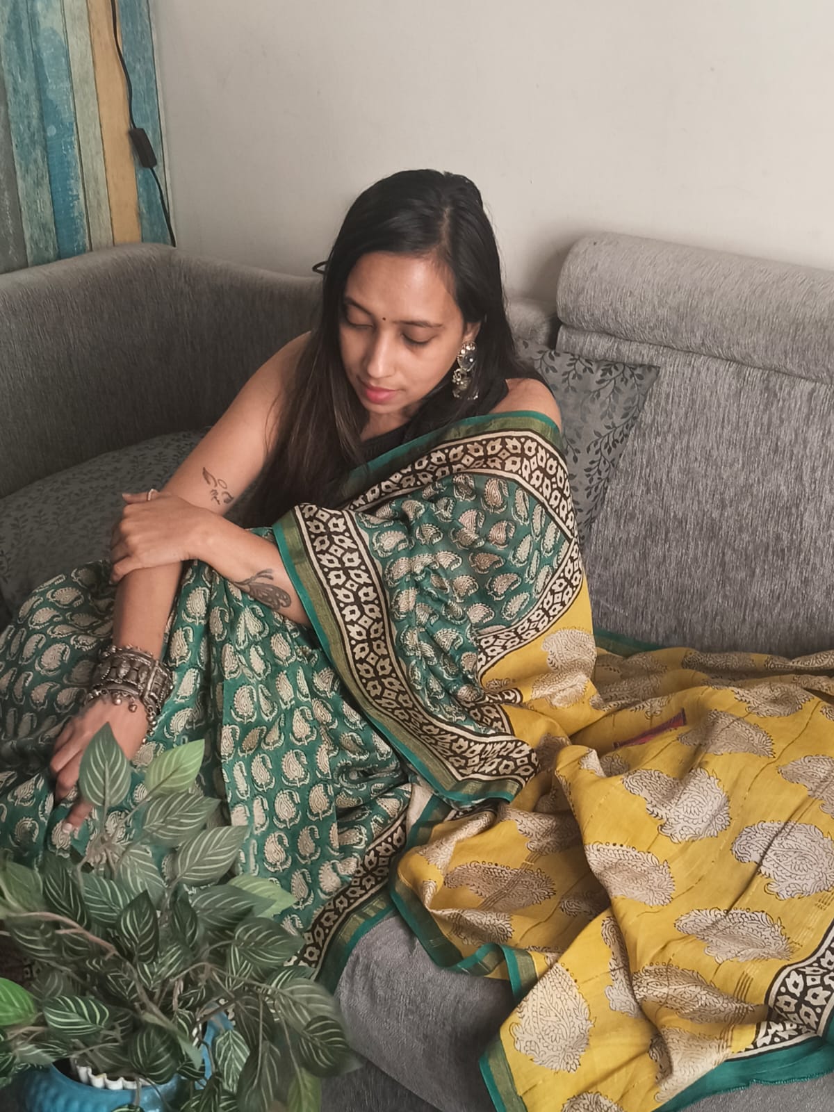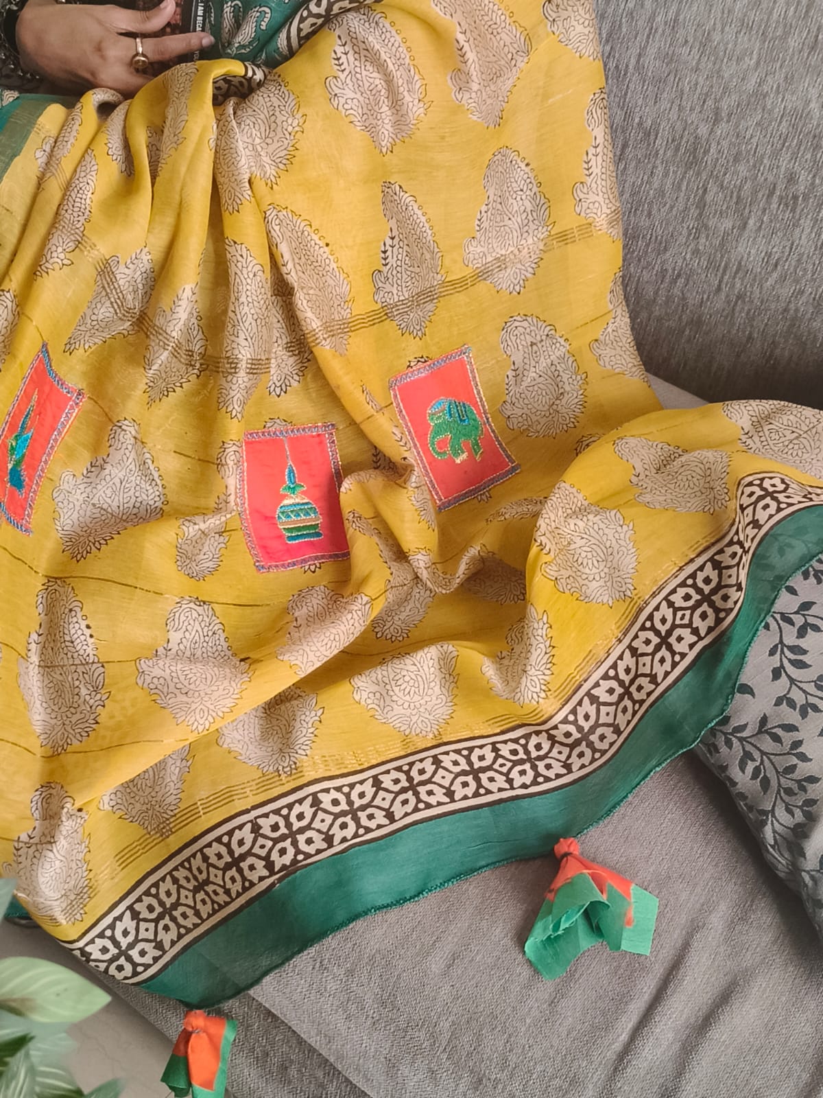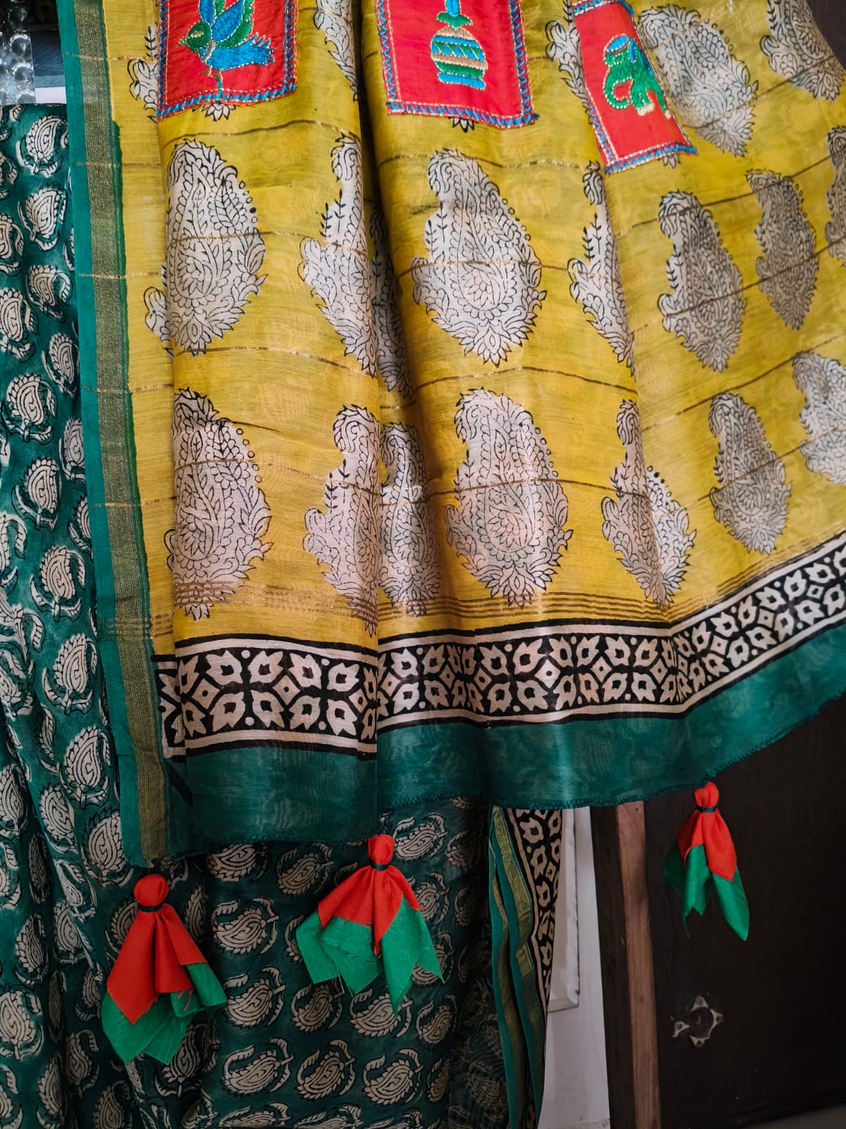 An Emerald Handblock Printed Chanderi Silk Saree with patchwork and tassels on the pallu. comes with Blouse Fabric