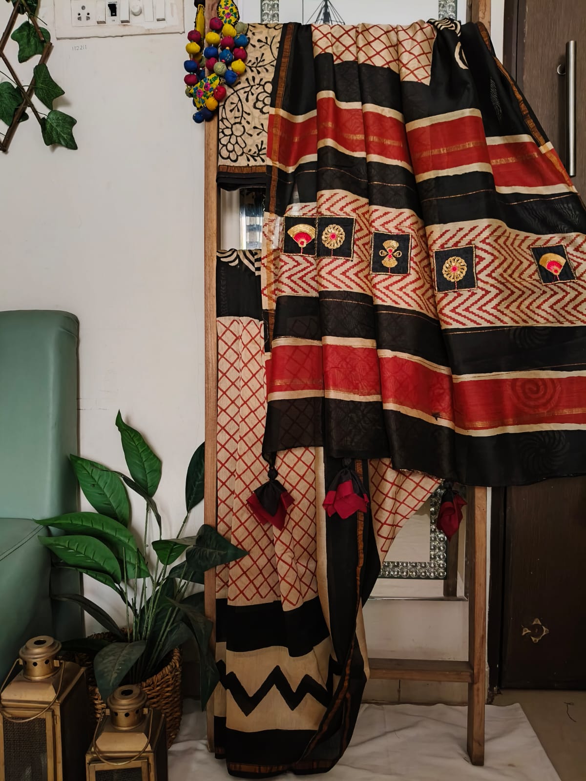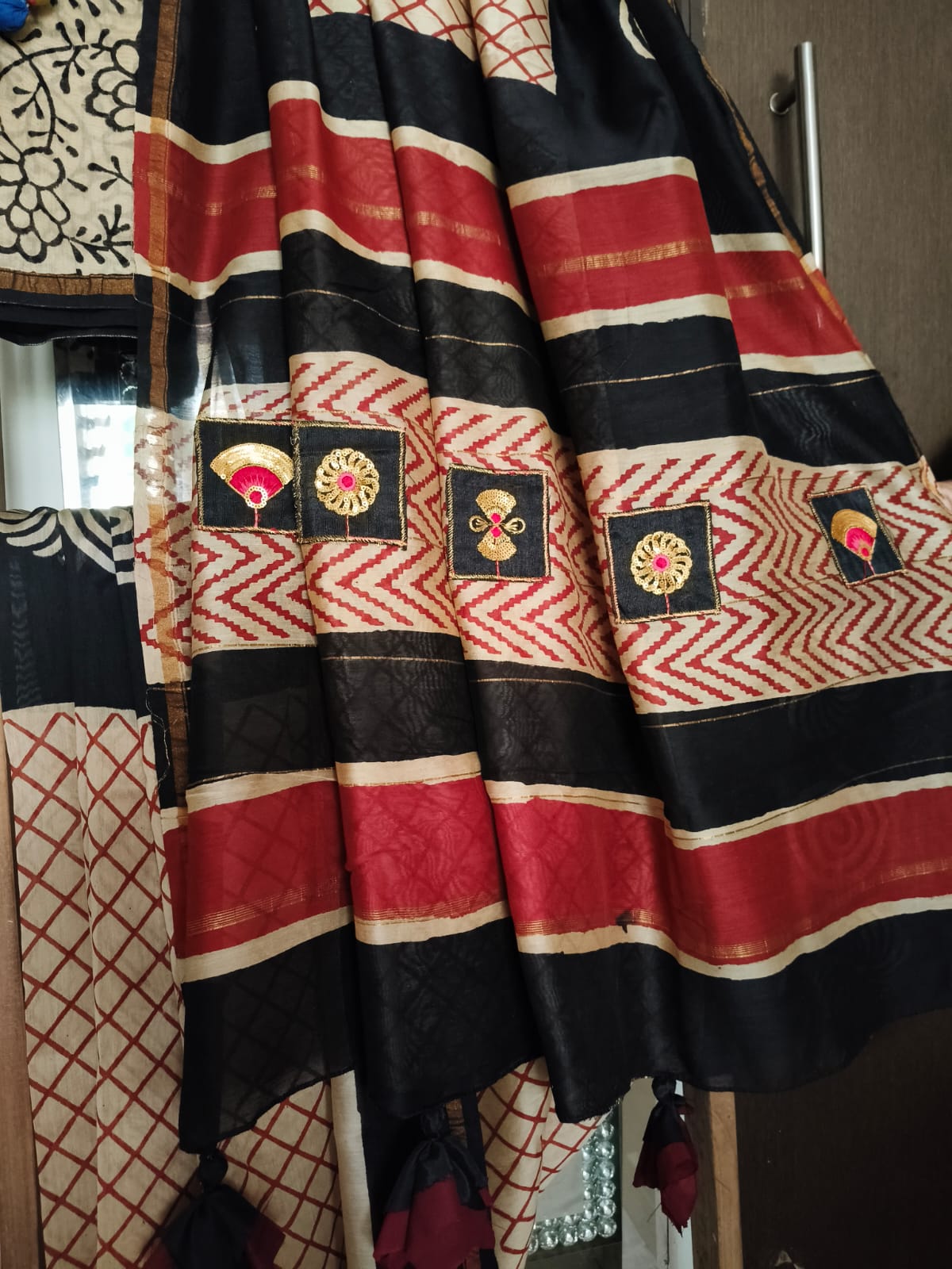 A Diagonal Beige Handblock Printed Chanderi Silk Saree with patchwork and tassles on the pallu. comes with Blouse Fabric