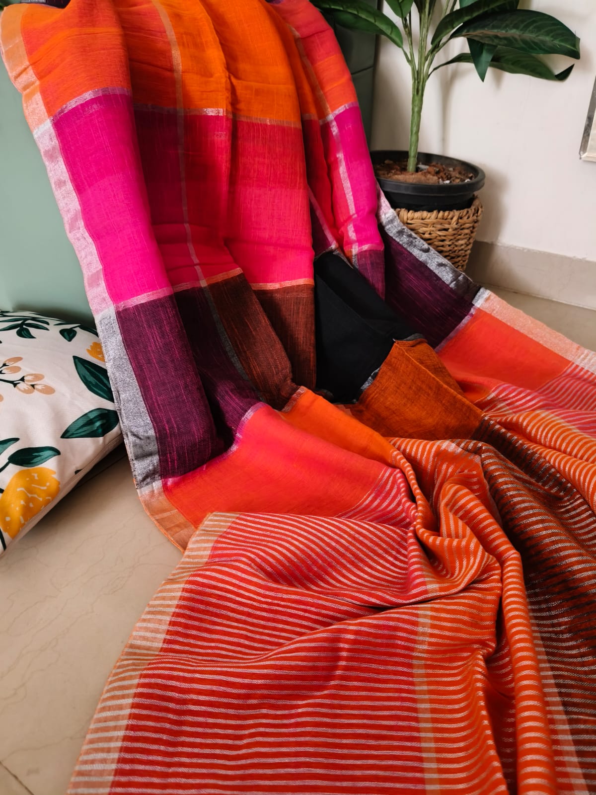 A Drak Realm Chequered Linen Saree paired with Blouse Piece.