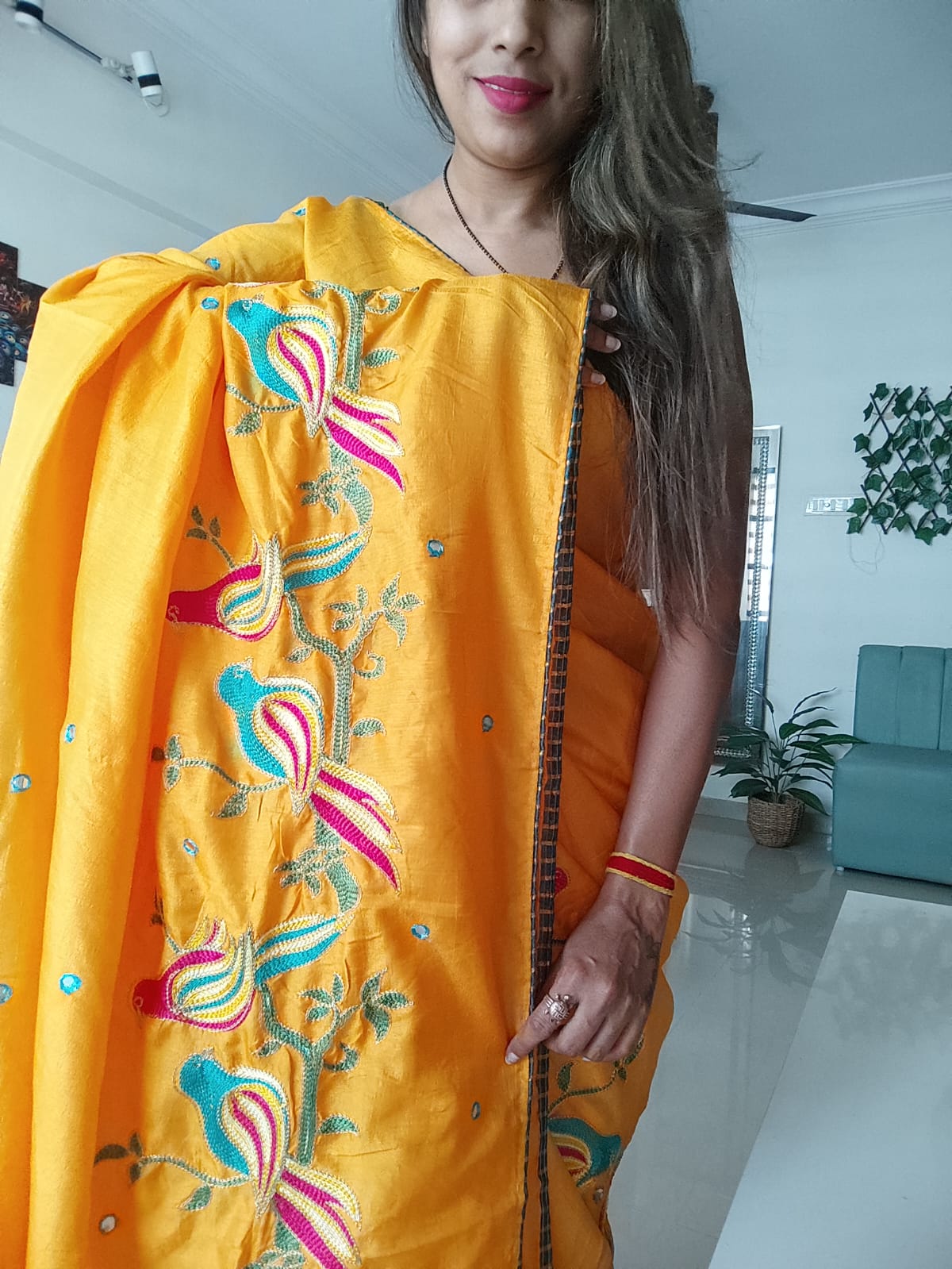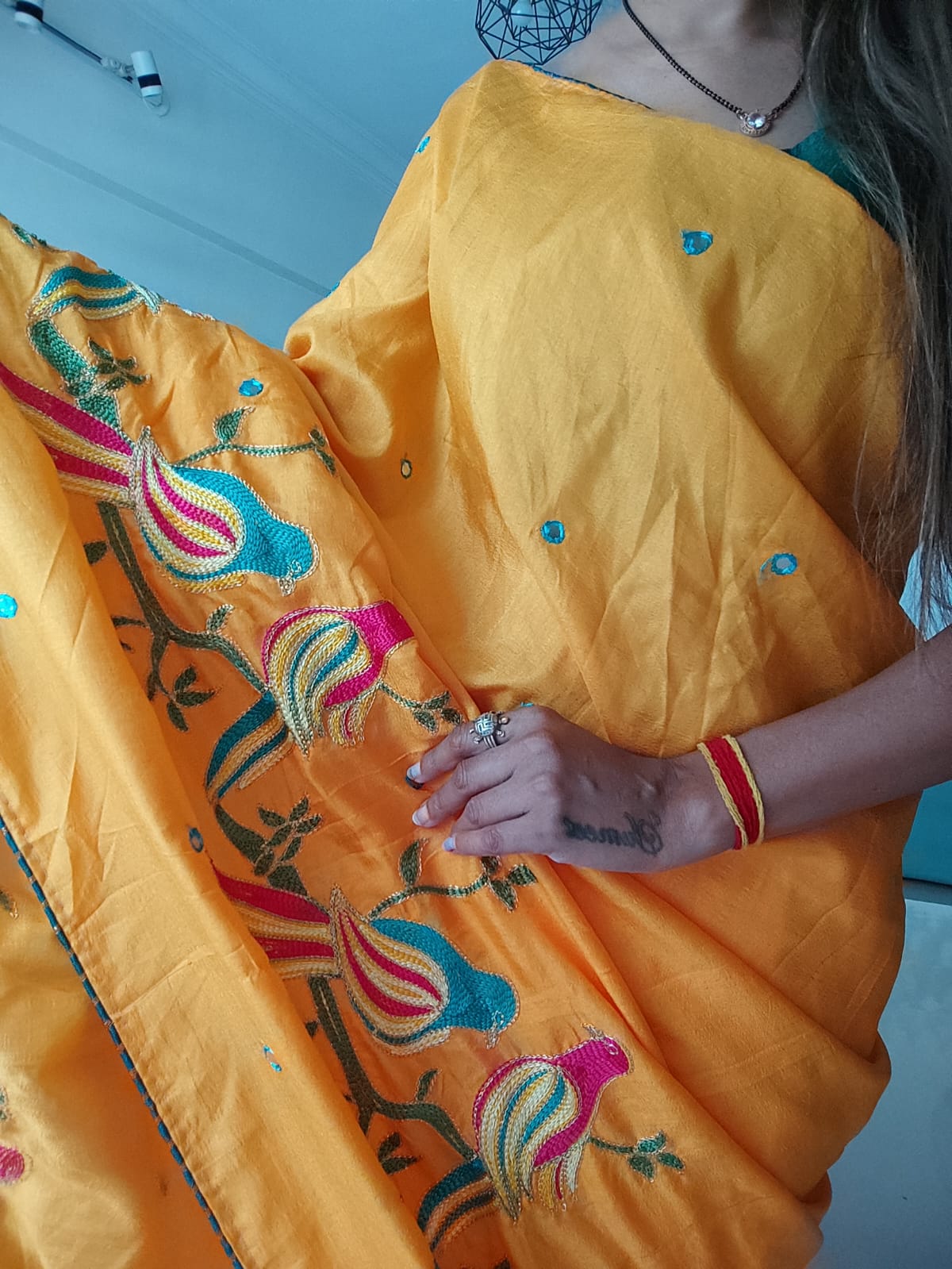 A Yellow Crepe Silk Embroided Saree
