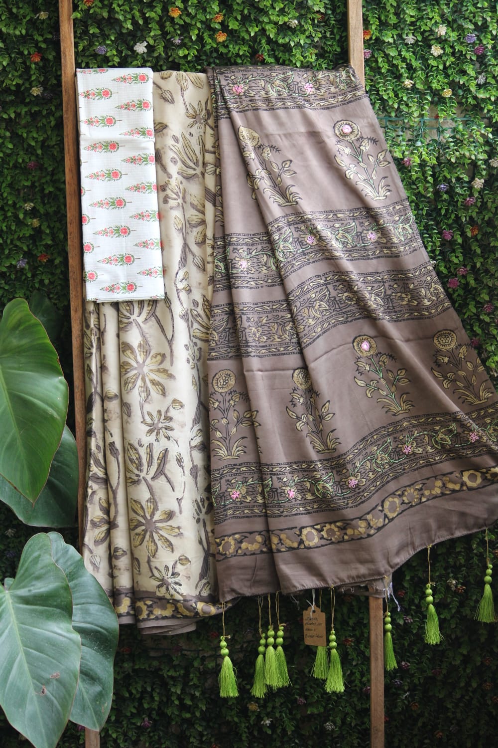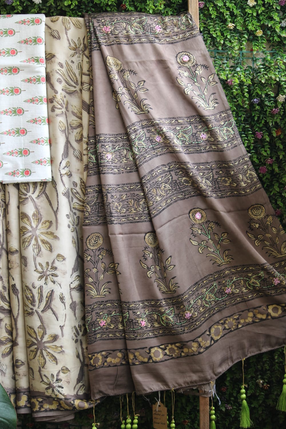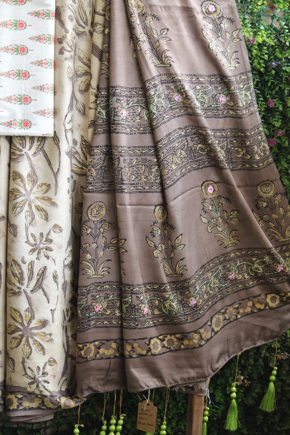 An Earthy Shade Handblock Printed Modal Silk Embroidered saree . Has a Blouse Fabric.