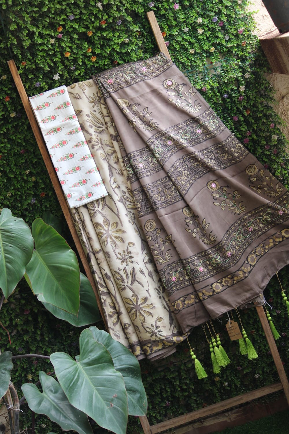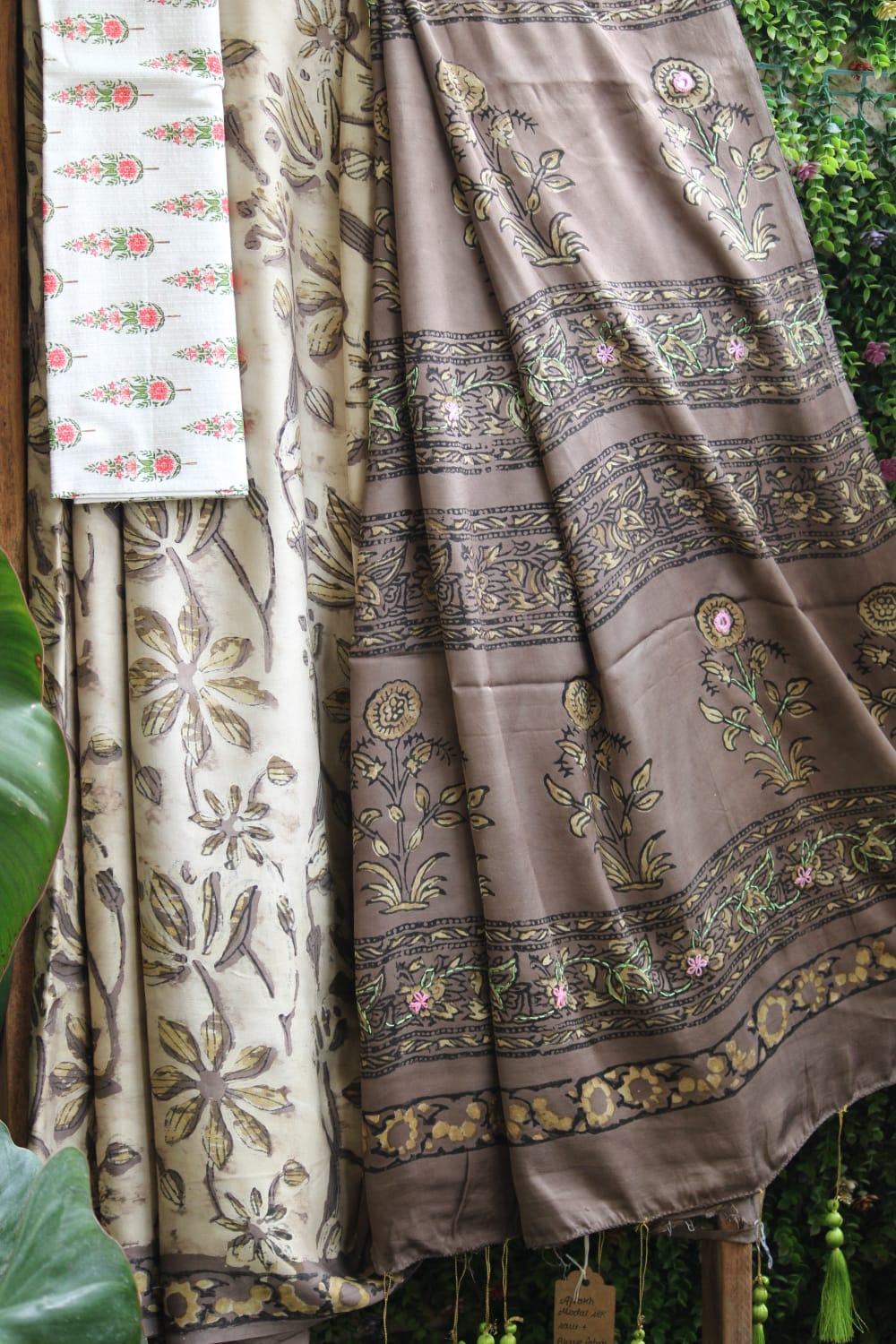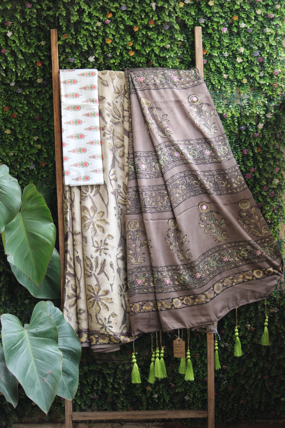An Earthy Shade Handblock Printed Modal Silk Embroidered saree . Has a Blouse Fabric.