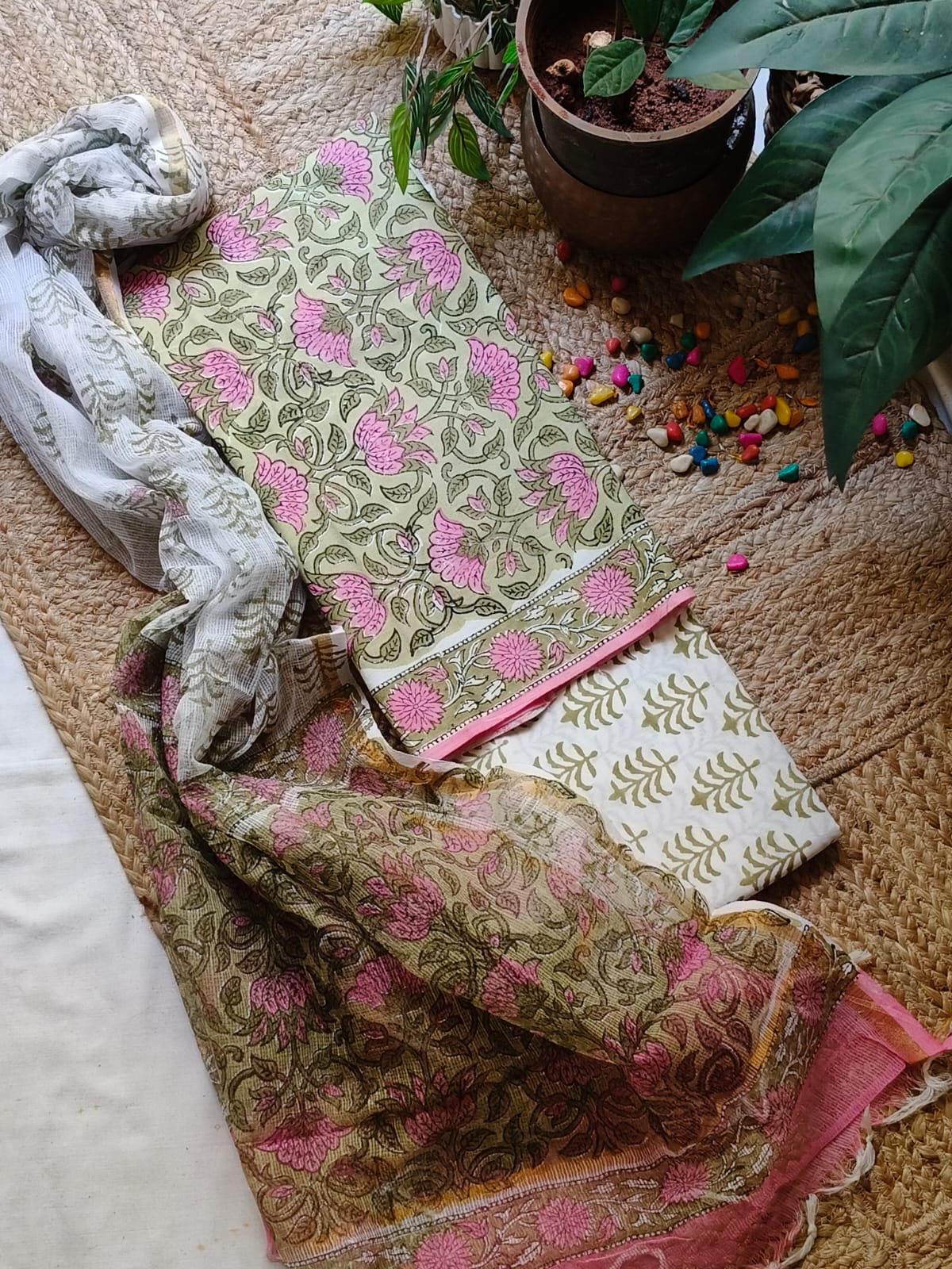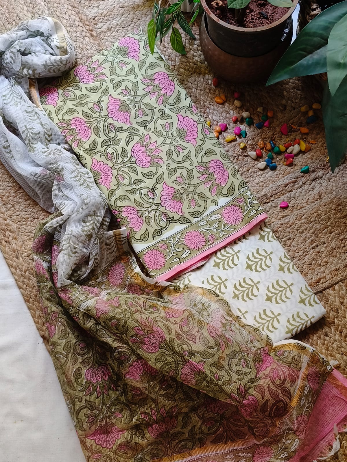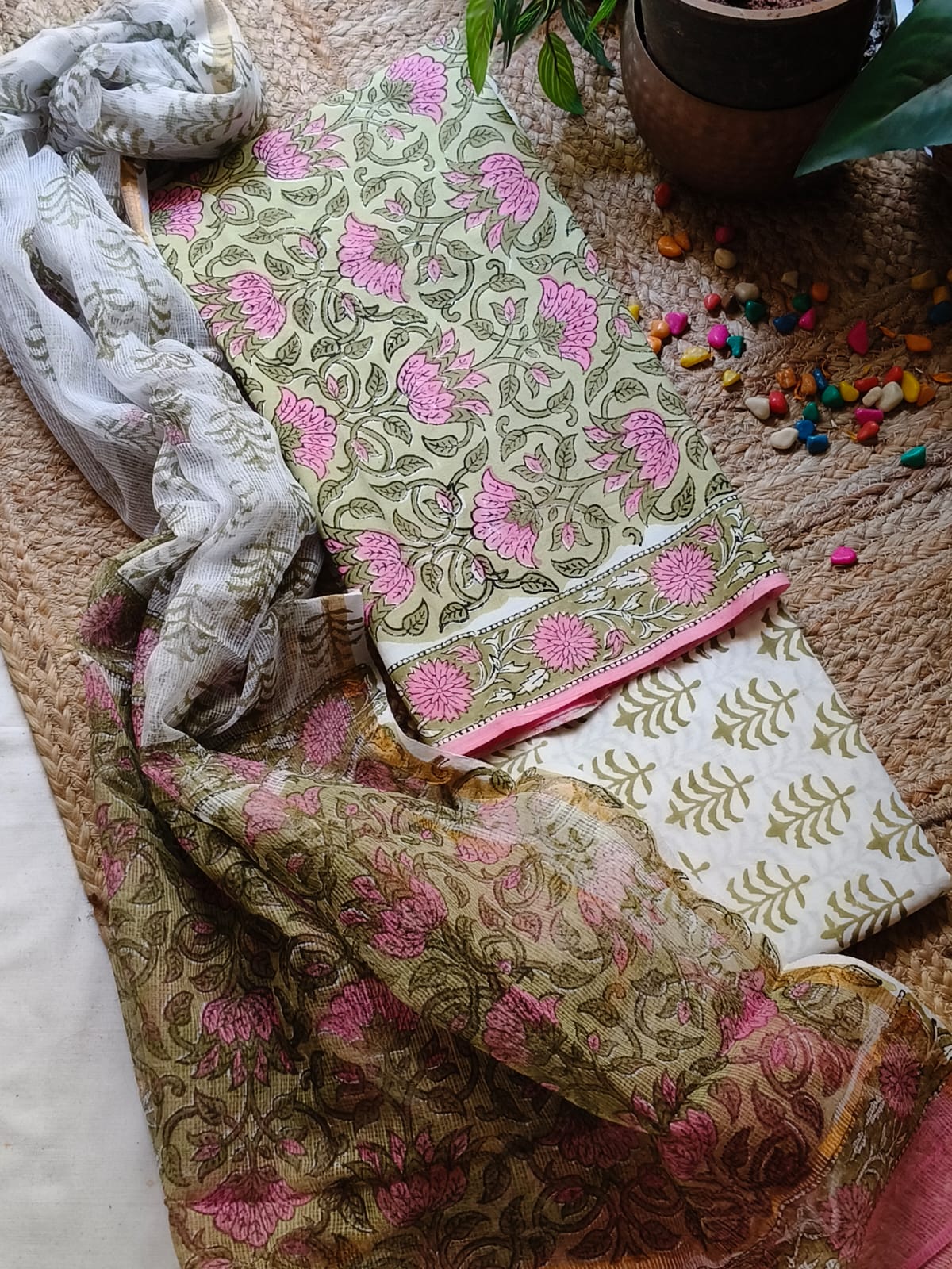Green And Pink Sangeneri Cotton Suit Set With Kota Dupatta