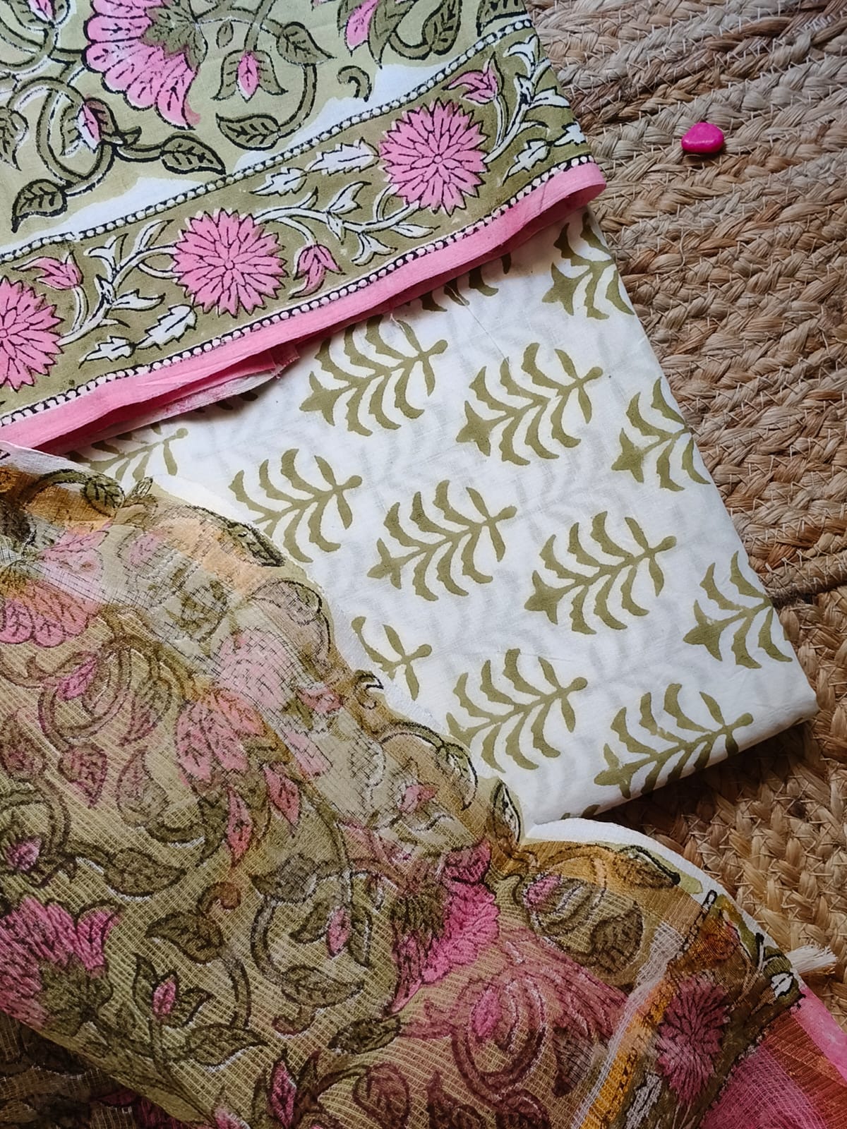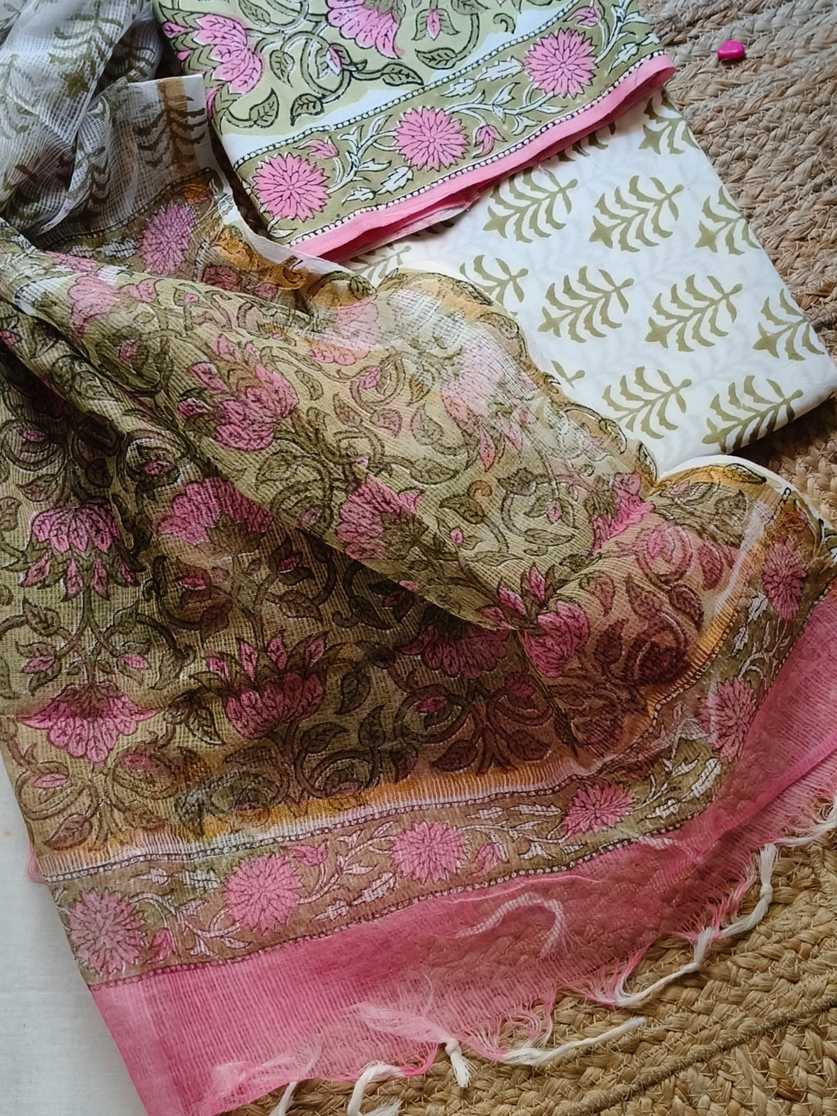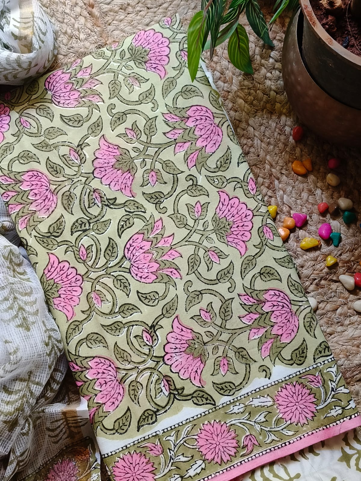 Green And Pink Sangeneri Cotton Suit Set With Kota Dupatta