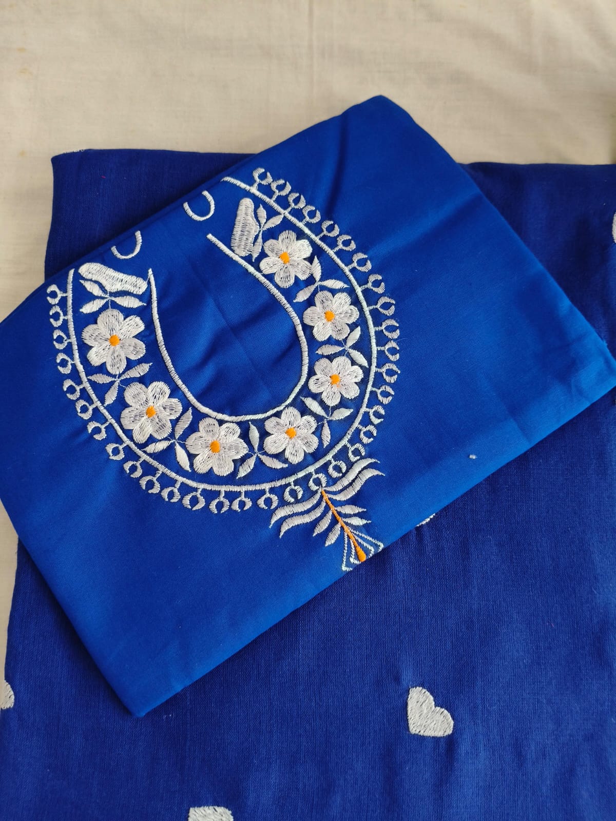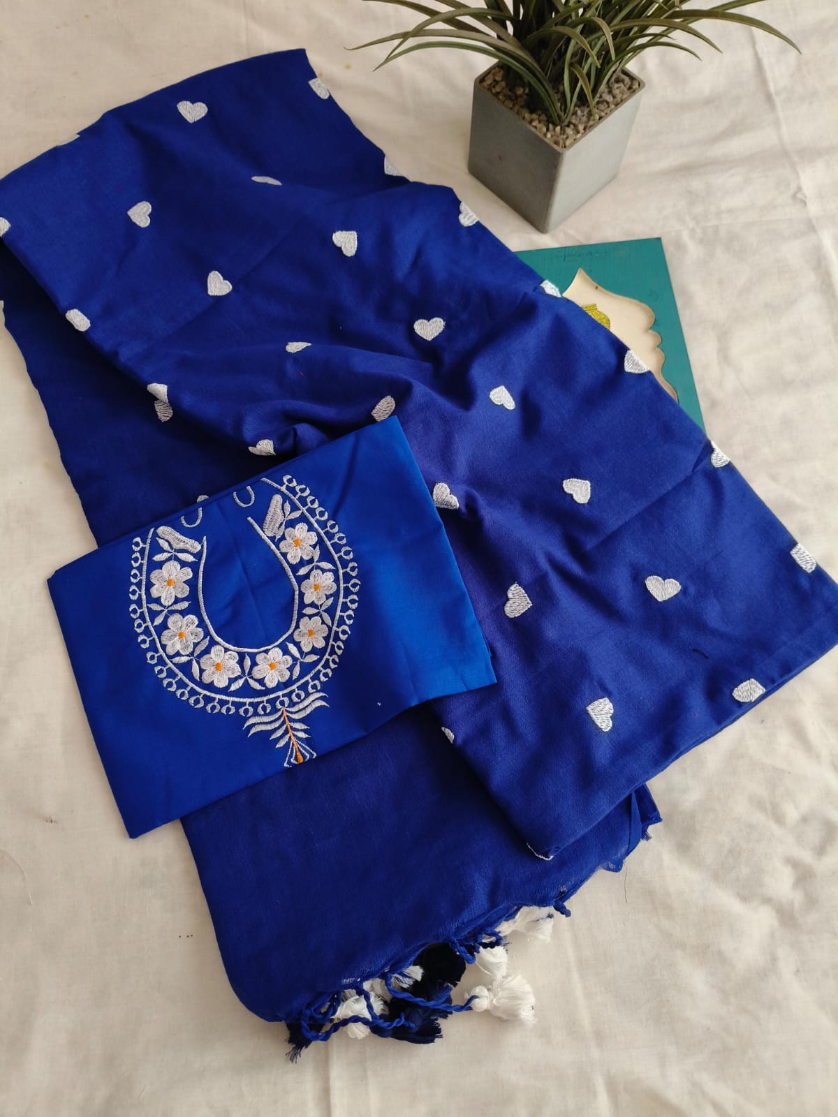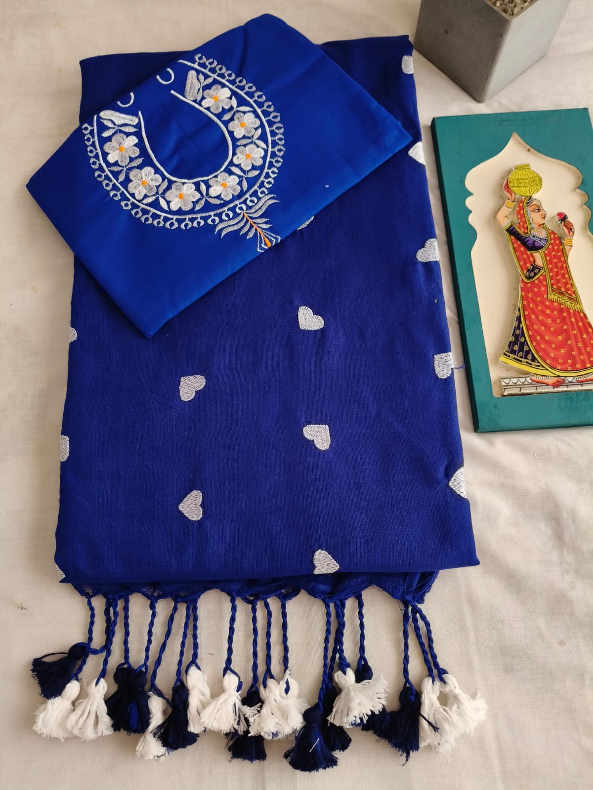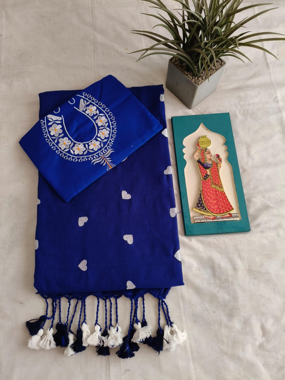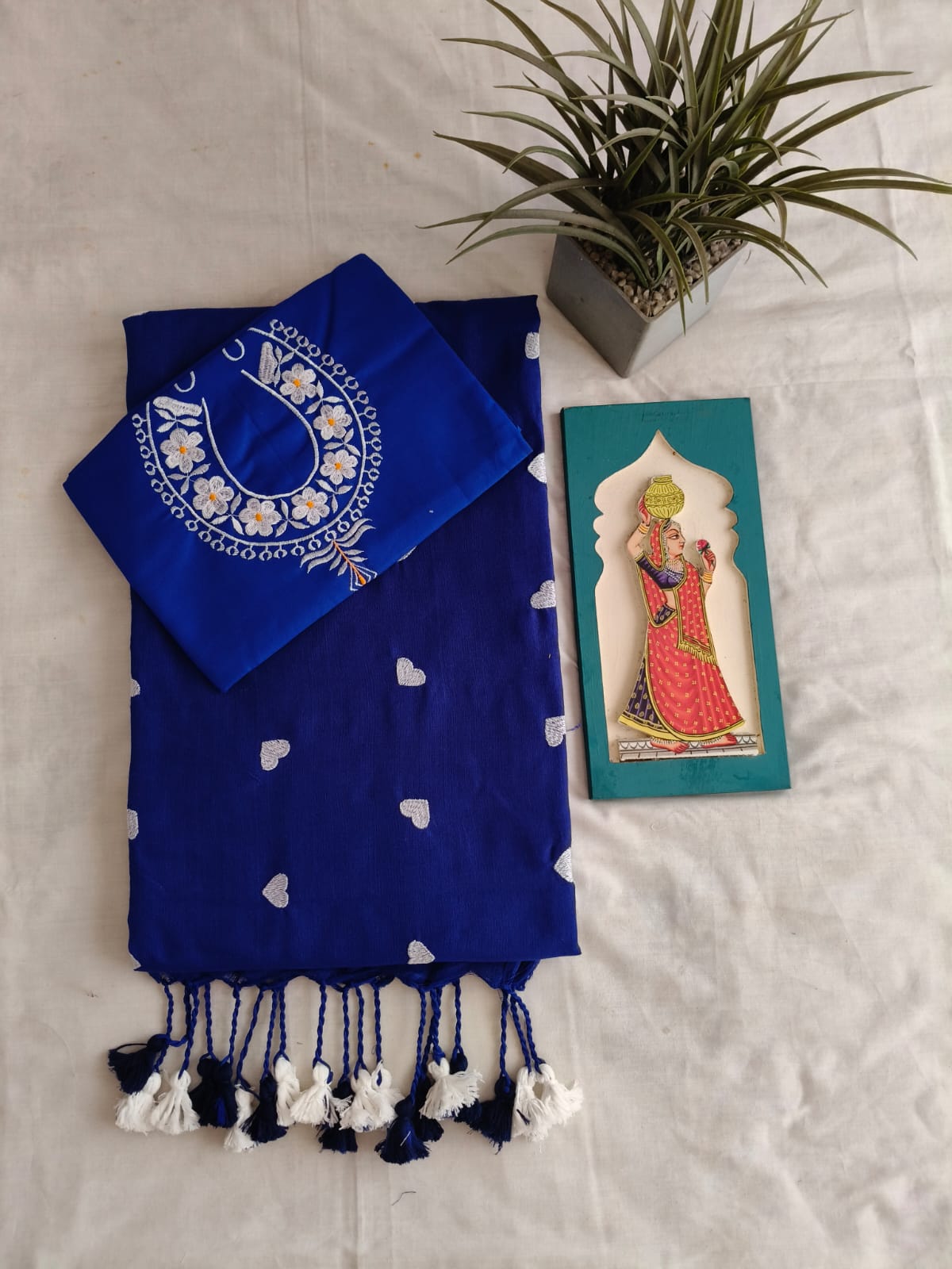 A Royal Blue With White Heart Embroidery Mul Cotton Saree. Paired with Embroidered Blouse Fabric.