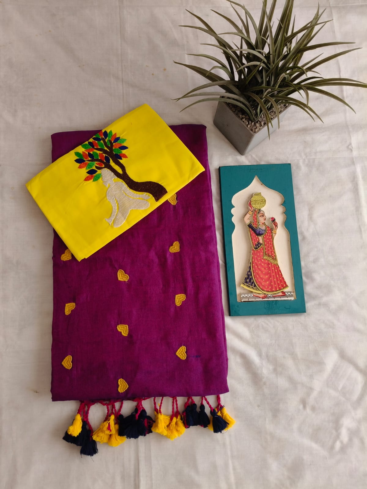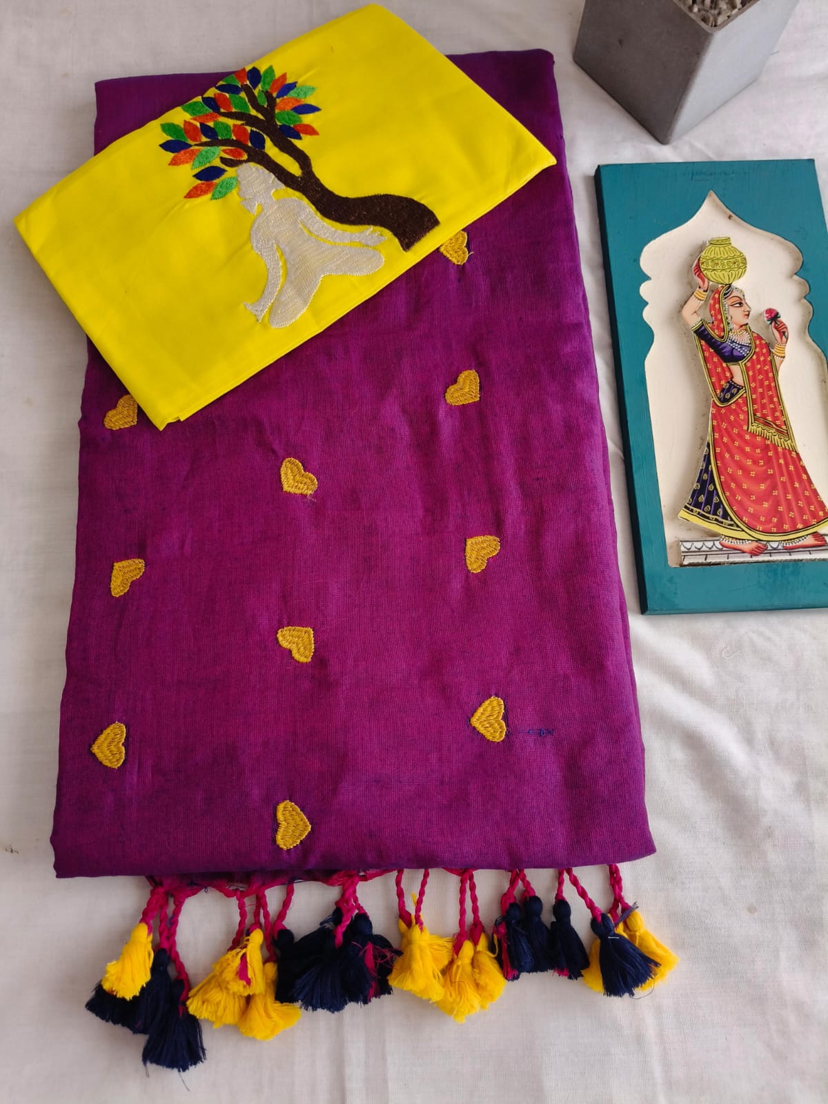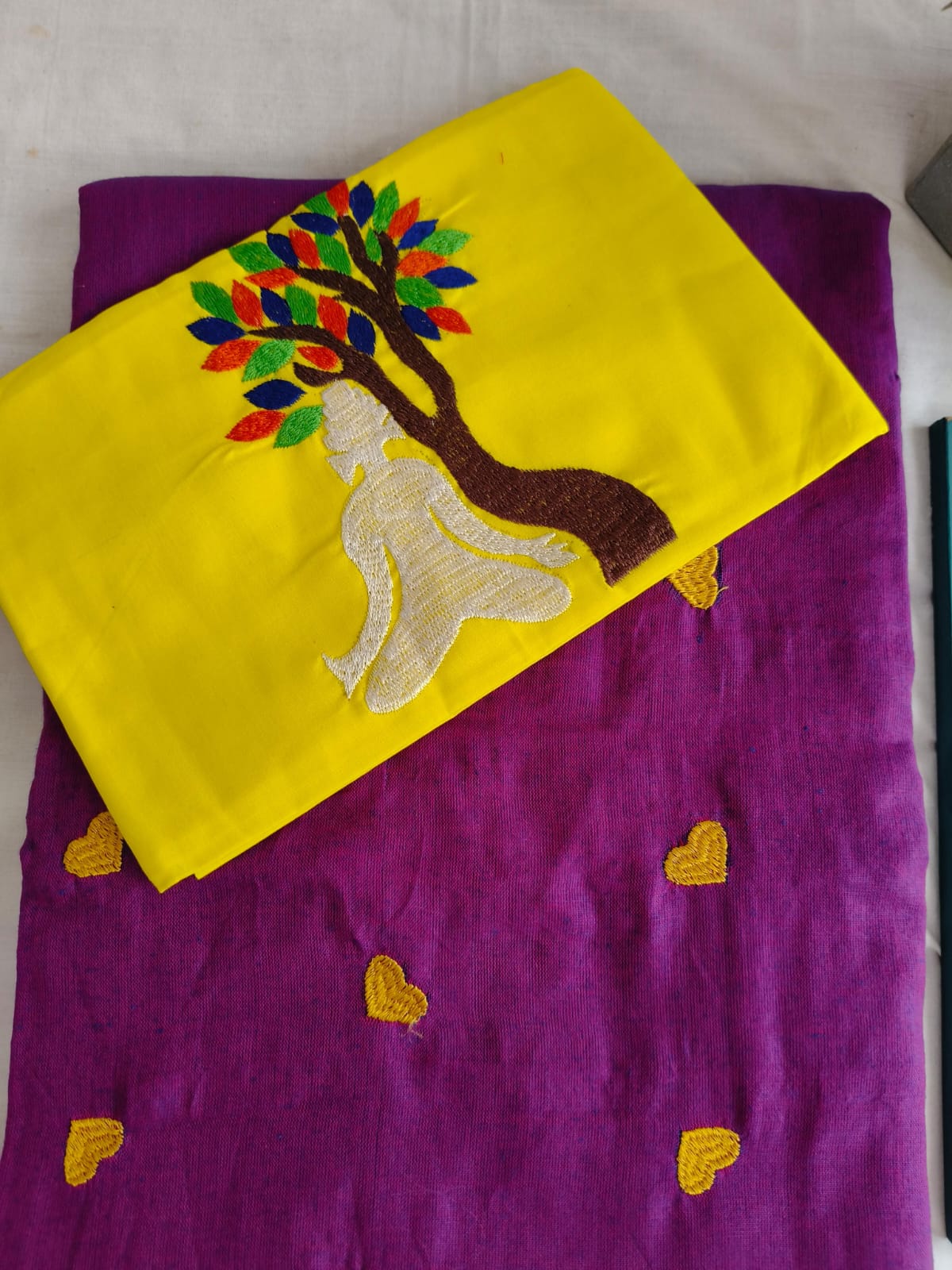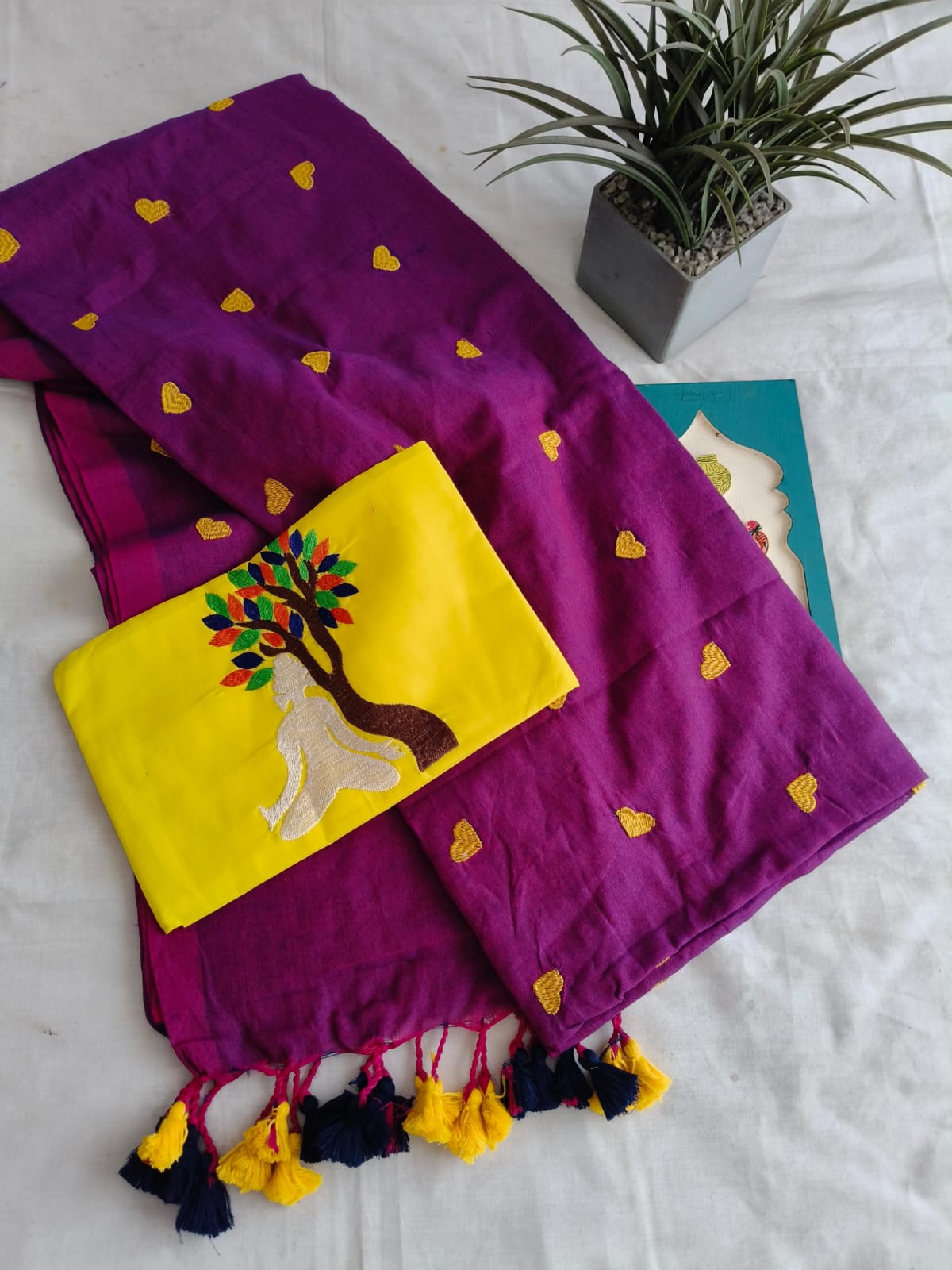 A Purple With Yellow Heart Embroidery Mul Cotton Saree. Paired with Embroidered Blouse Fabric.