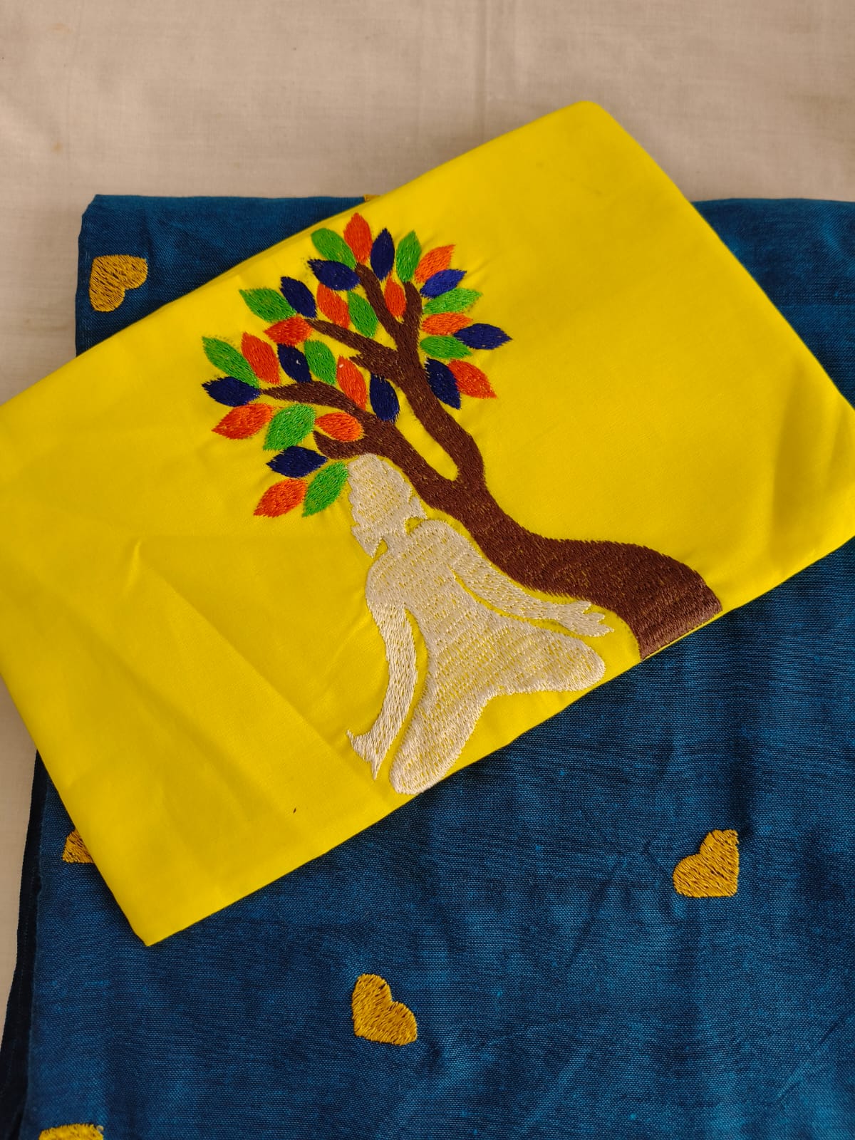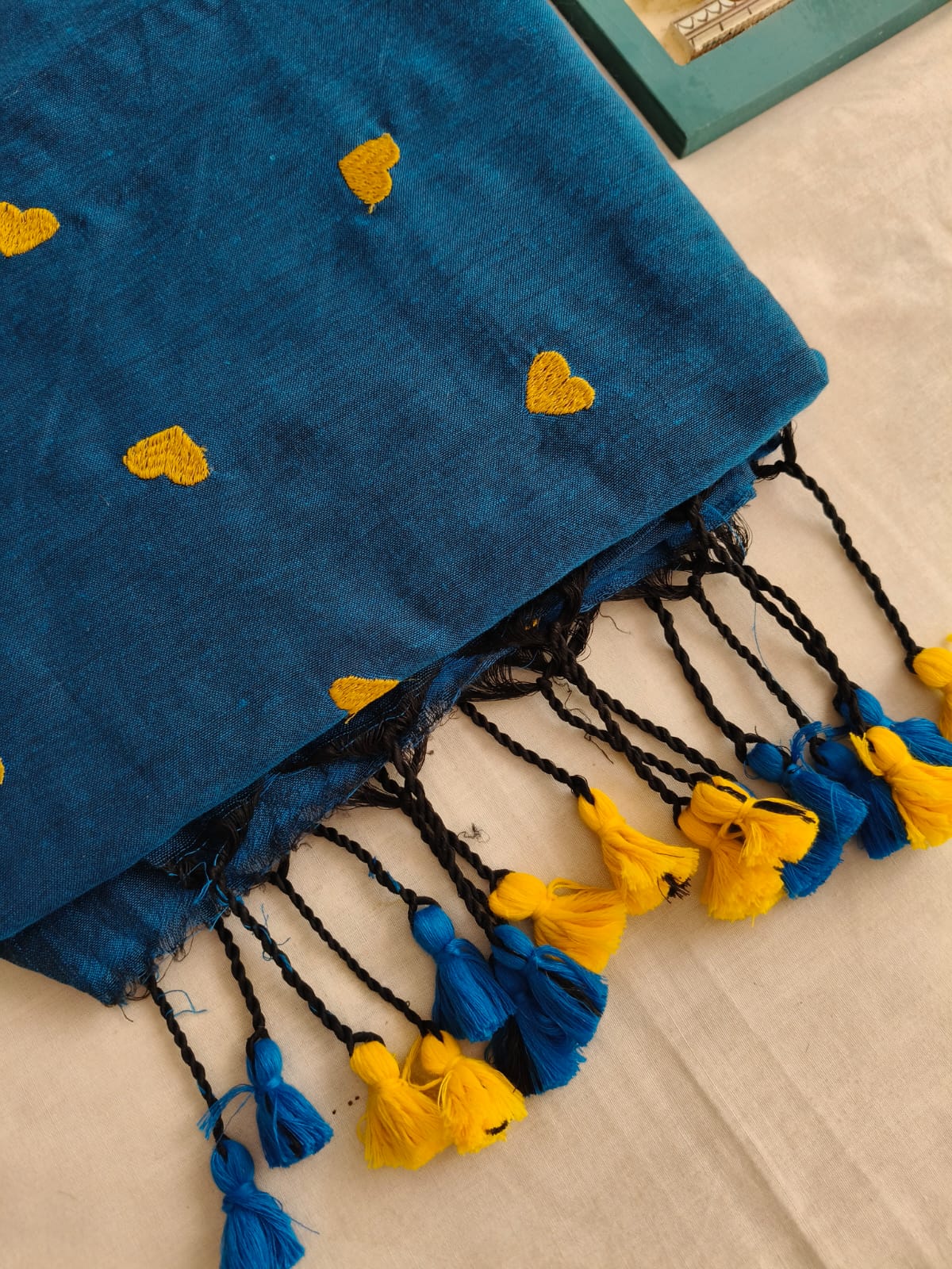 A Peacock Green With Yellow Heart Embroidery Mul Cotton Saree. Paired with Embroidered Blouse Fabric.