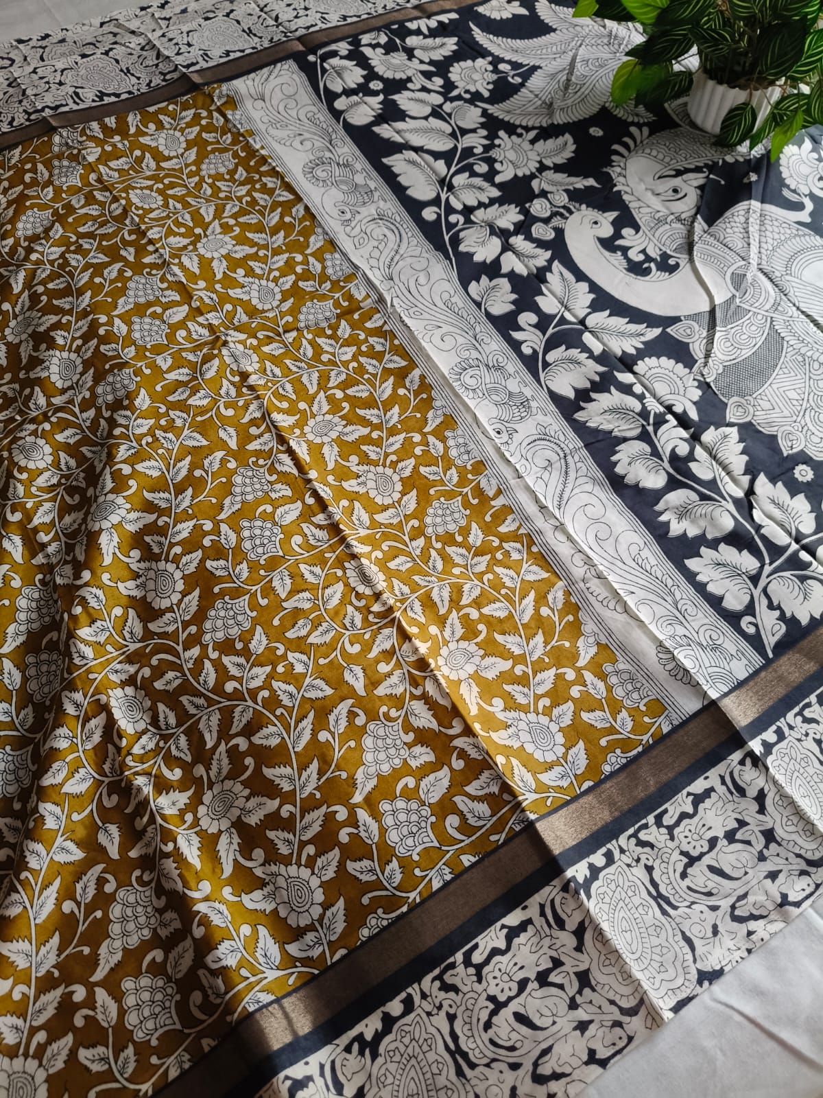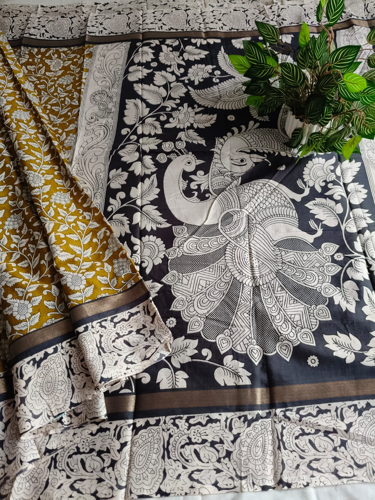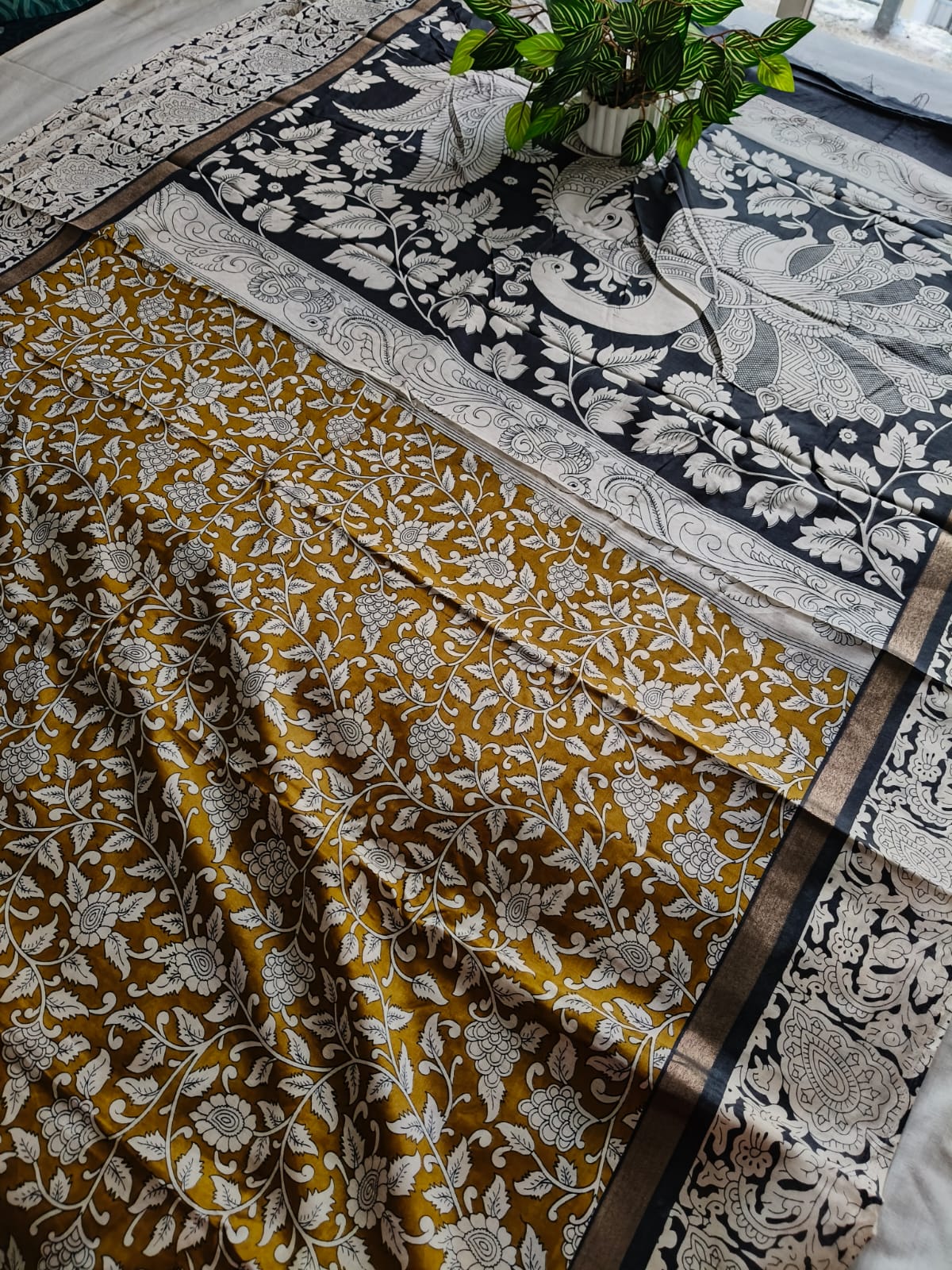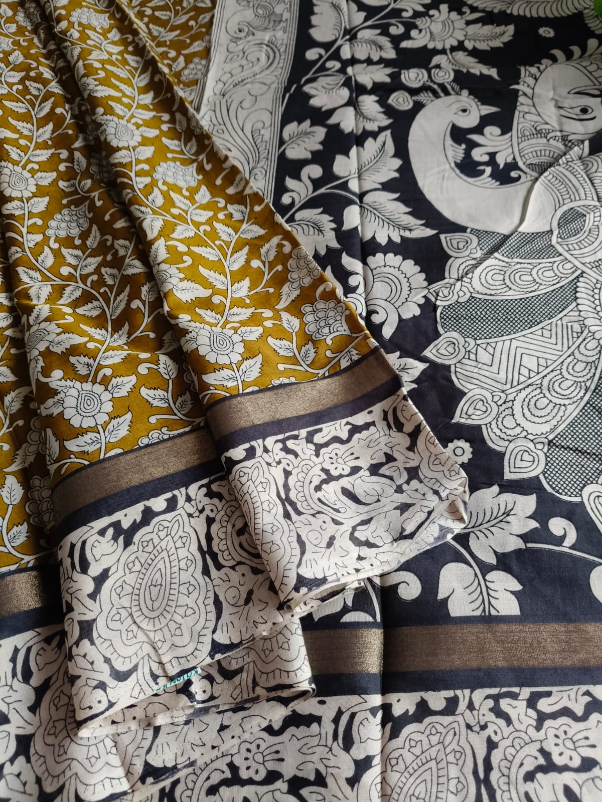 A Mustard With Black Kalamkari Nellore Silk Saree with Blouse Fabric.