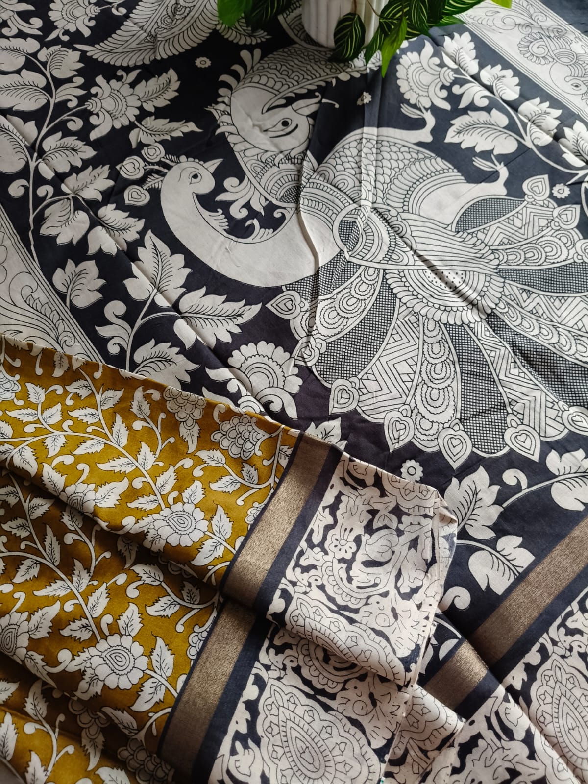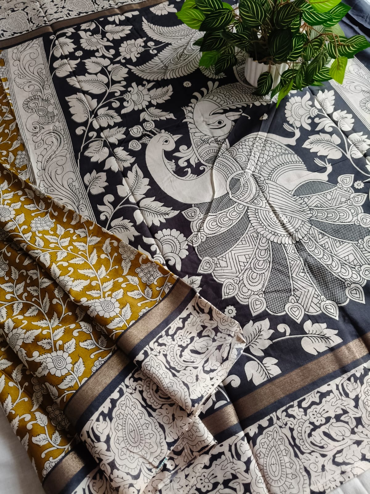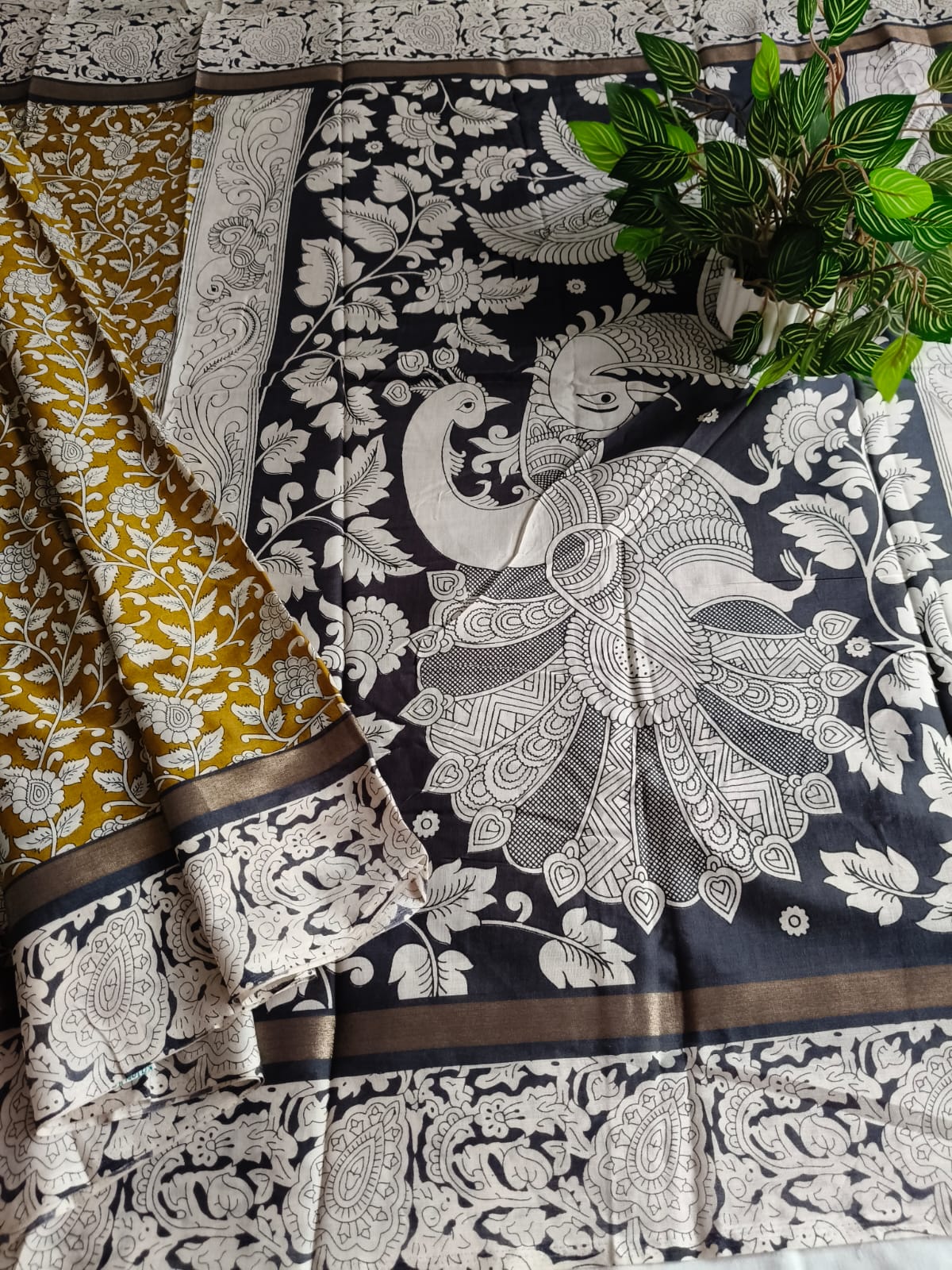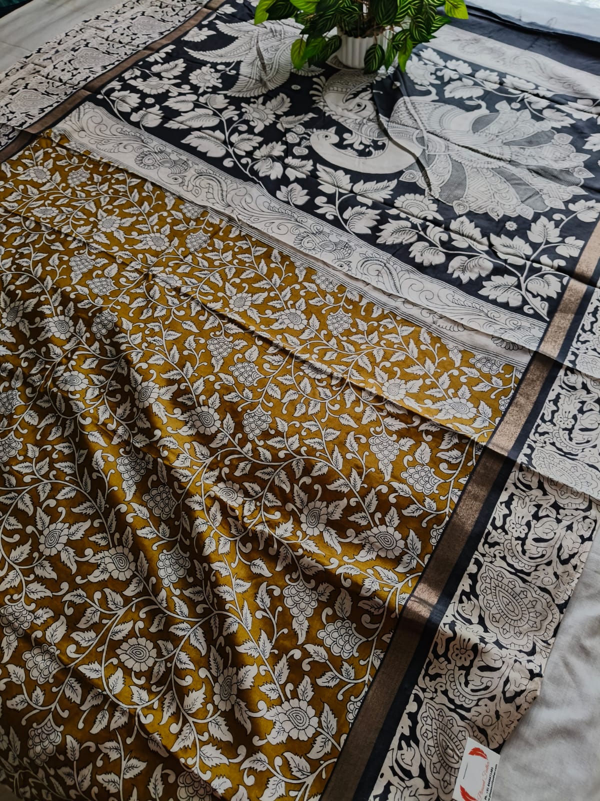 A Mustard With Black Kalamkari Nellore Silk Saree with Blouse Fabric.