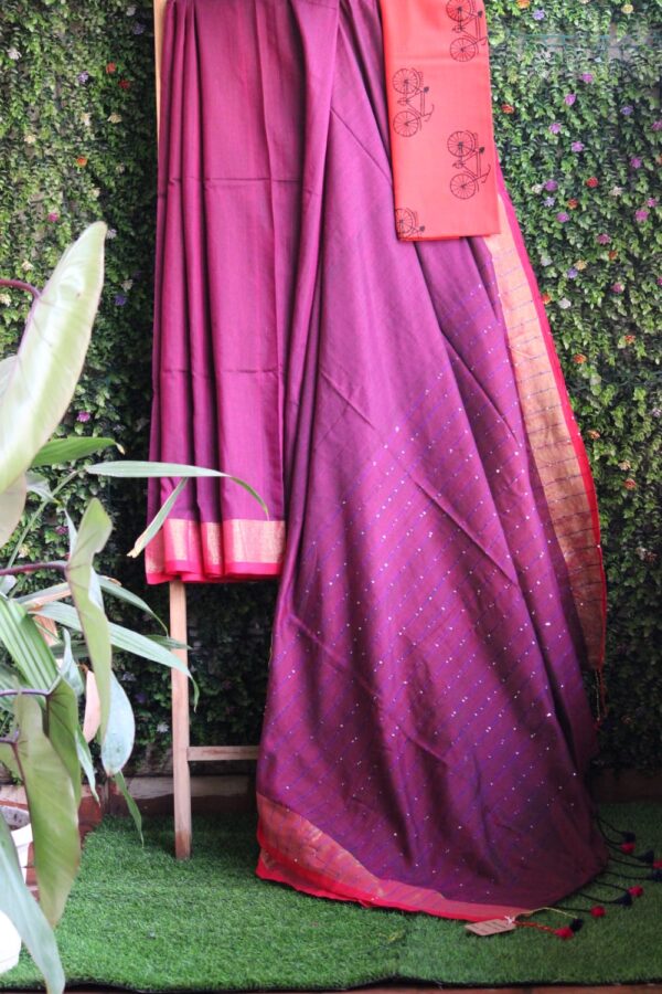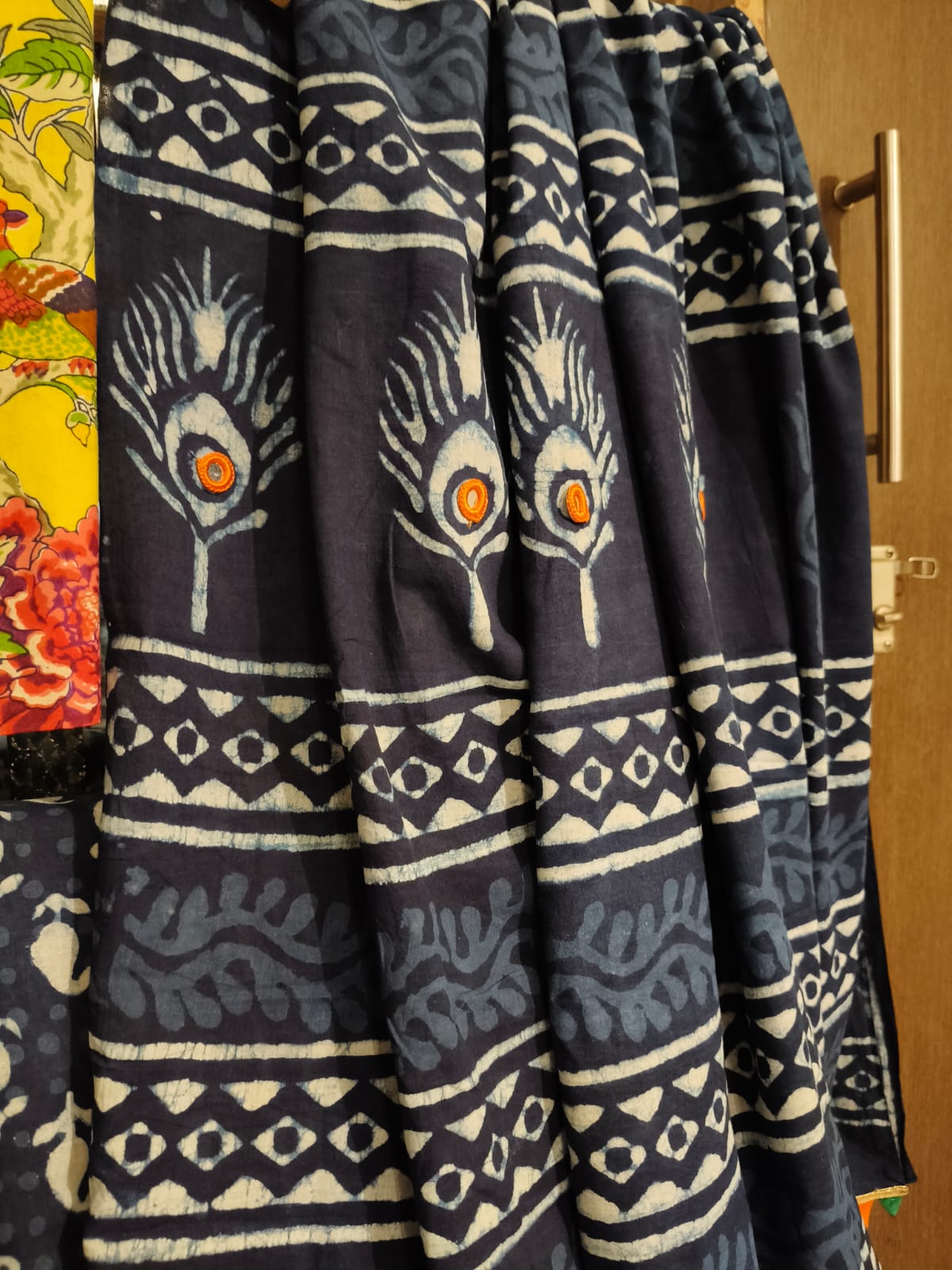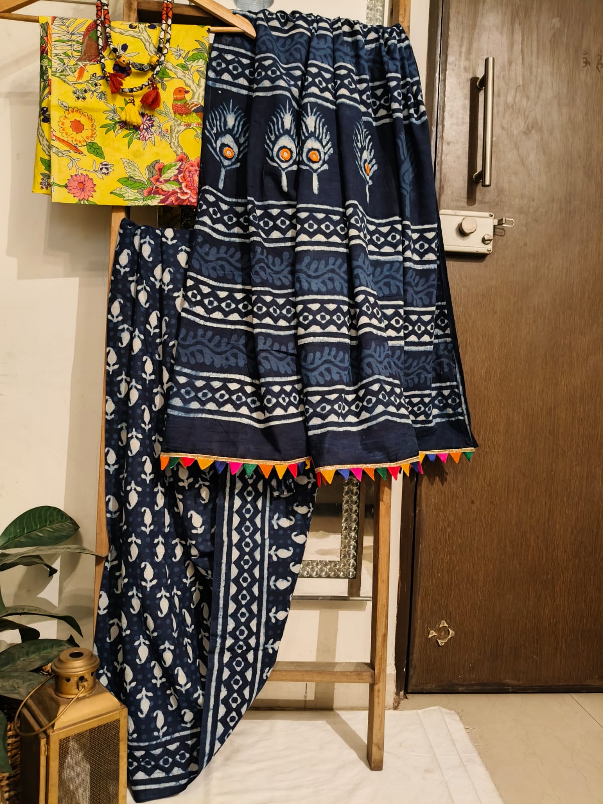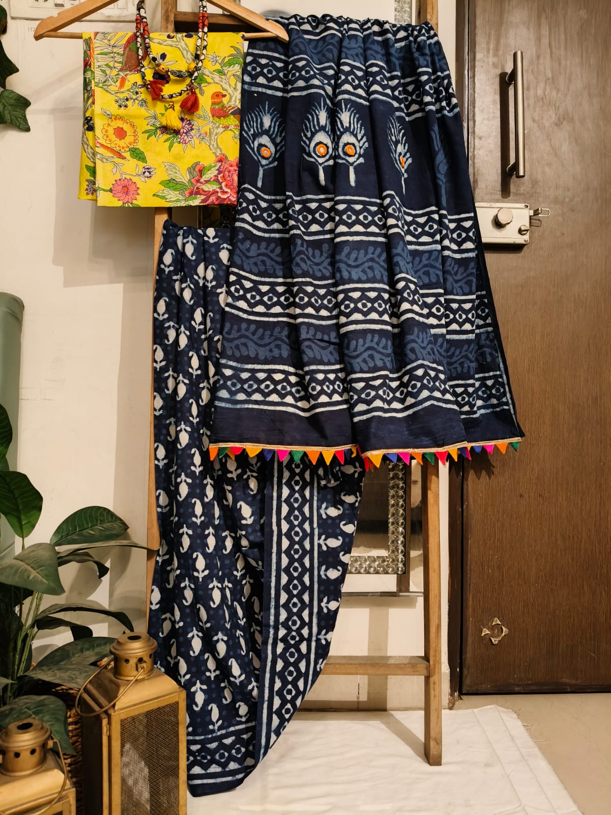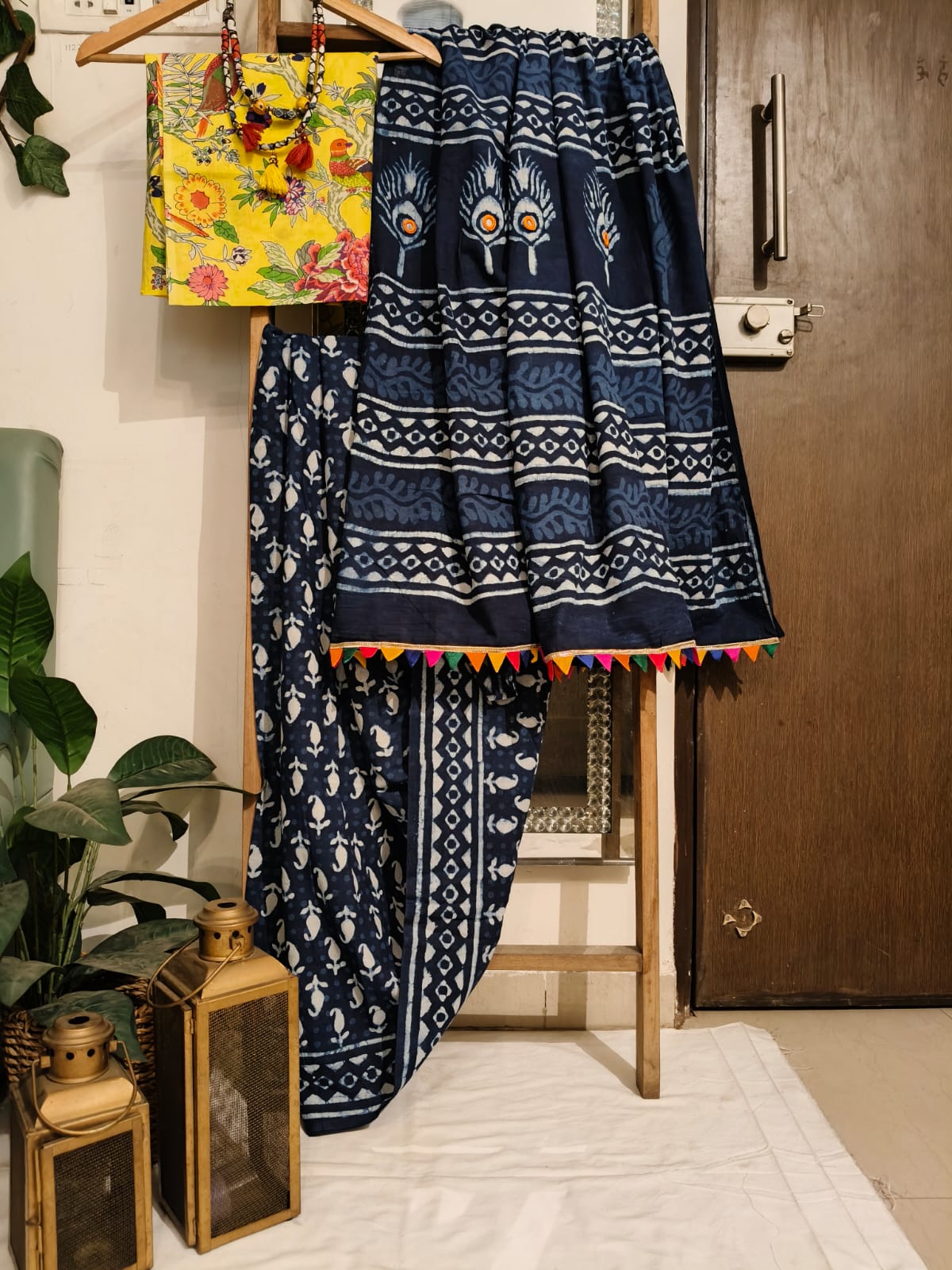 A Butta Handblock Print Saree With Embroidered Pallu . Paired With additional Yellow Bird Blouse Fabric