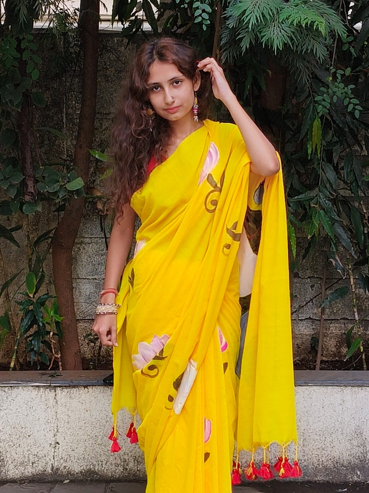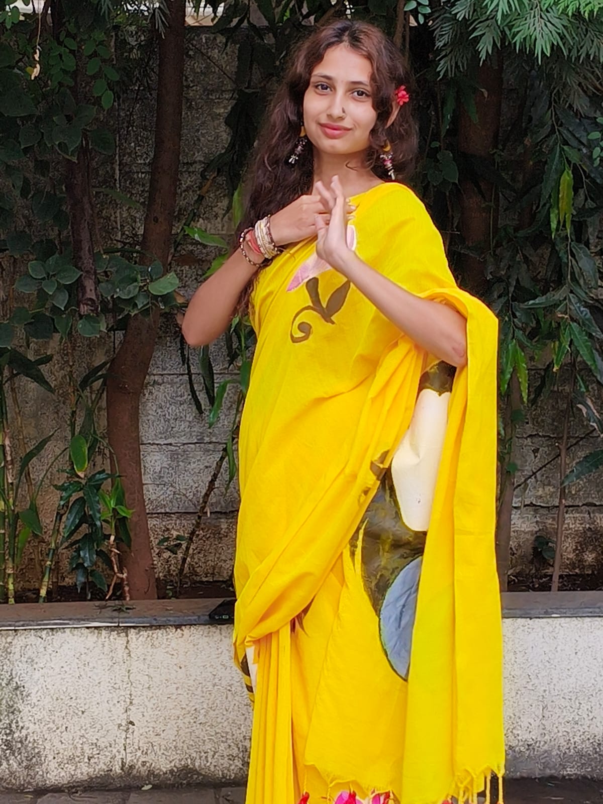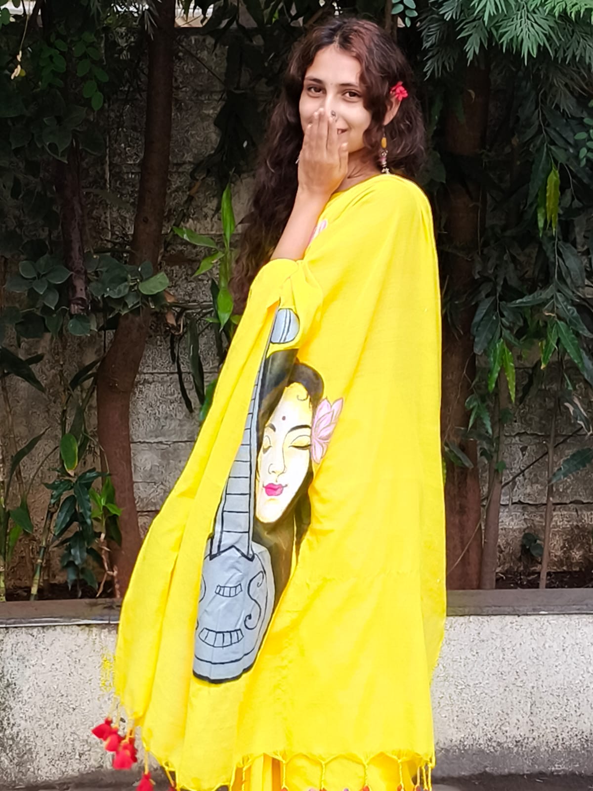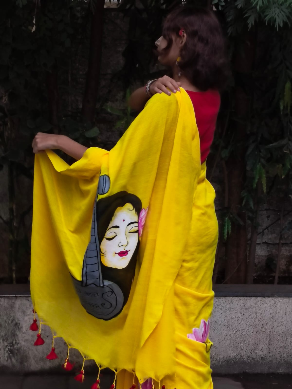 A Yellow Mesmerising Meera with Sitar Handpainted Khadi Mul Cotton SareeĀ .