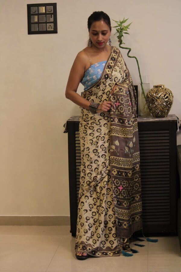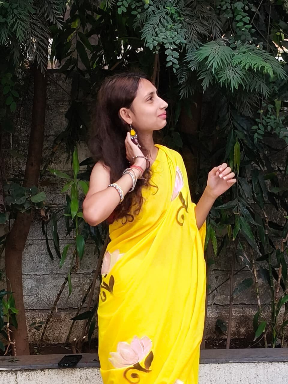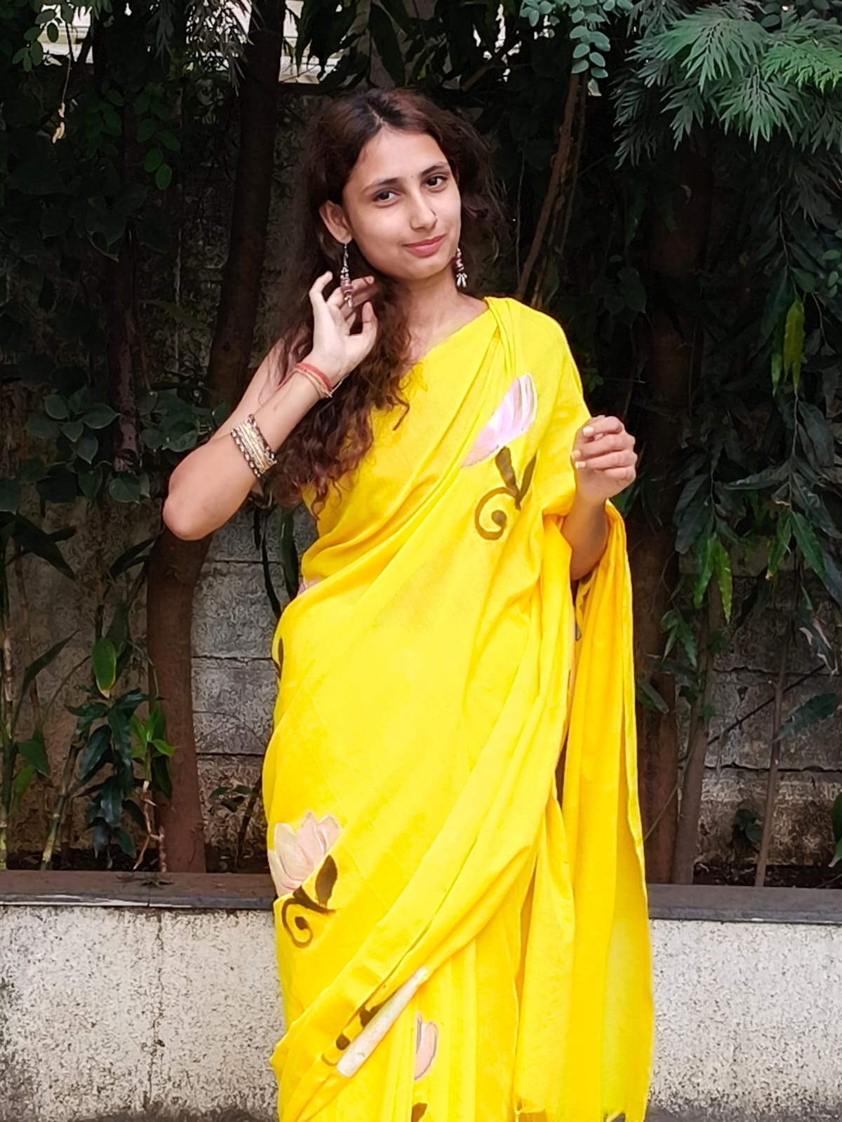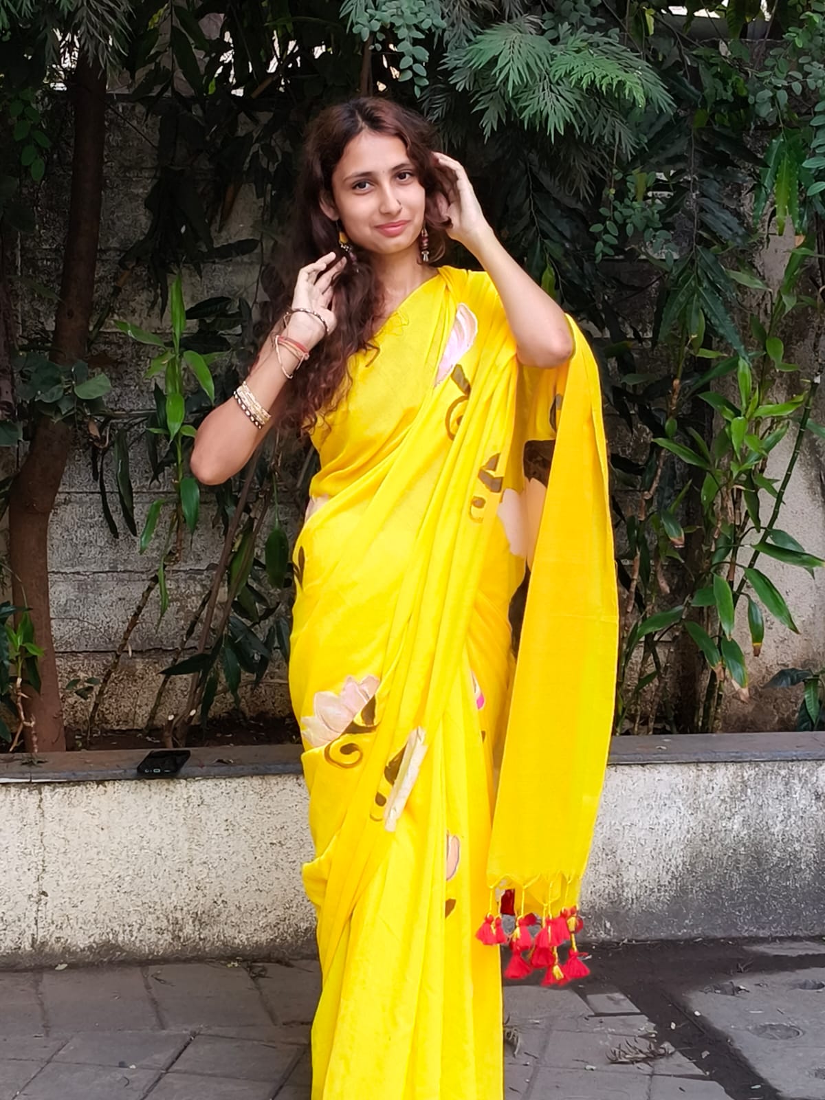 A Yellow Mesmerising Meera with Sitar Handpainted Khadi Mul Cotton SareeĀ .