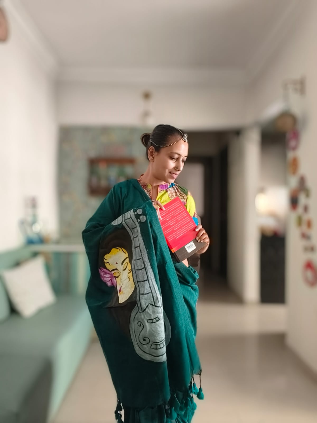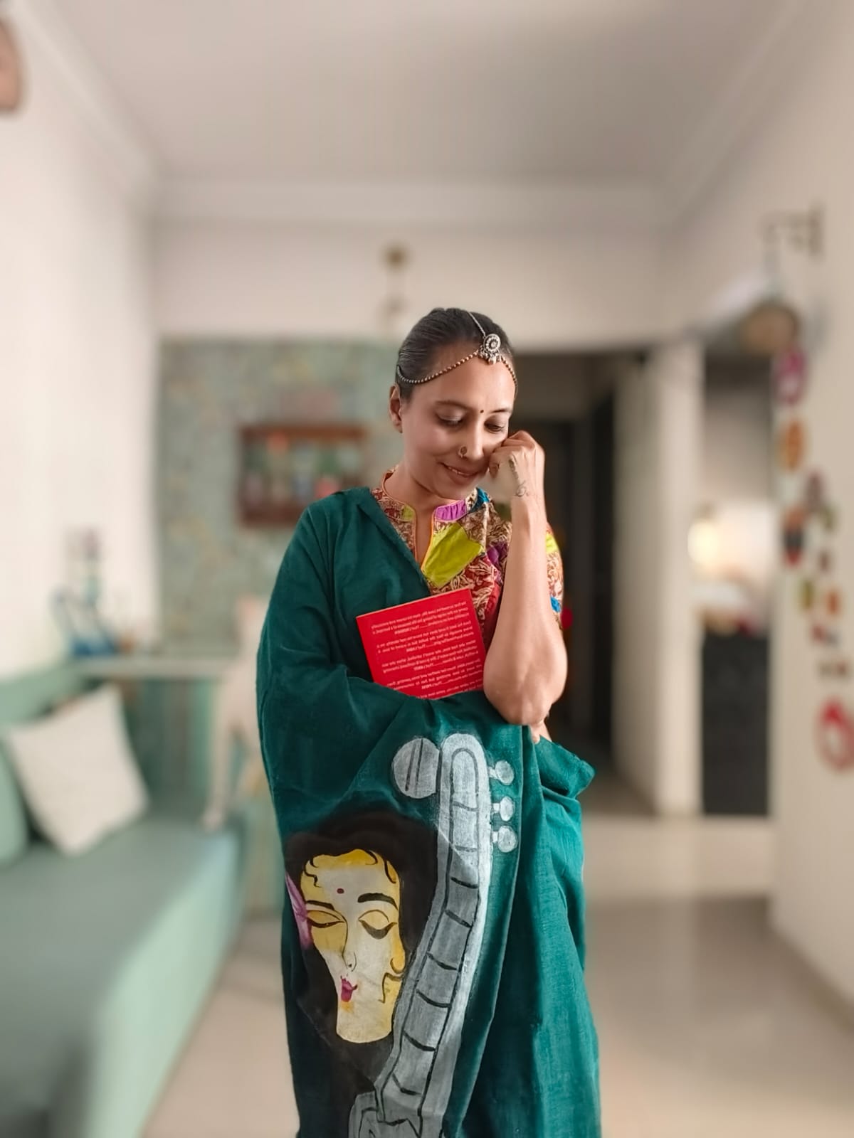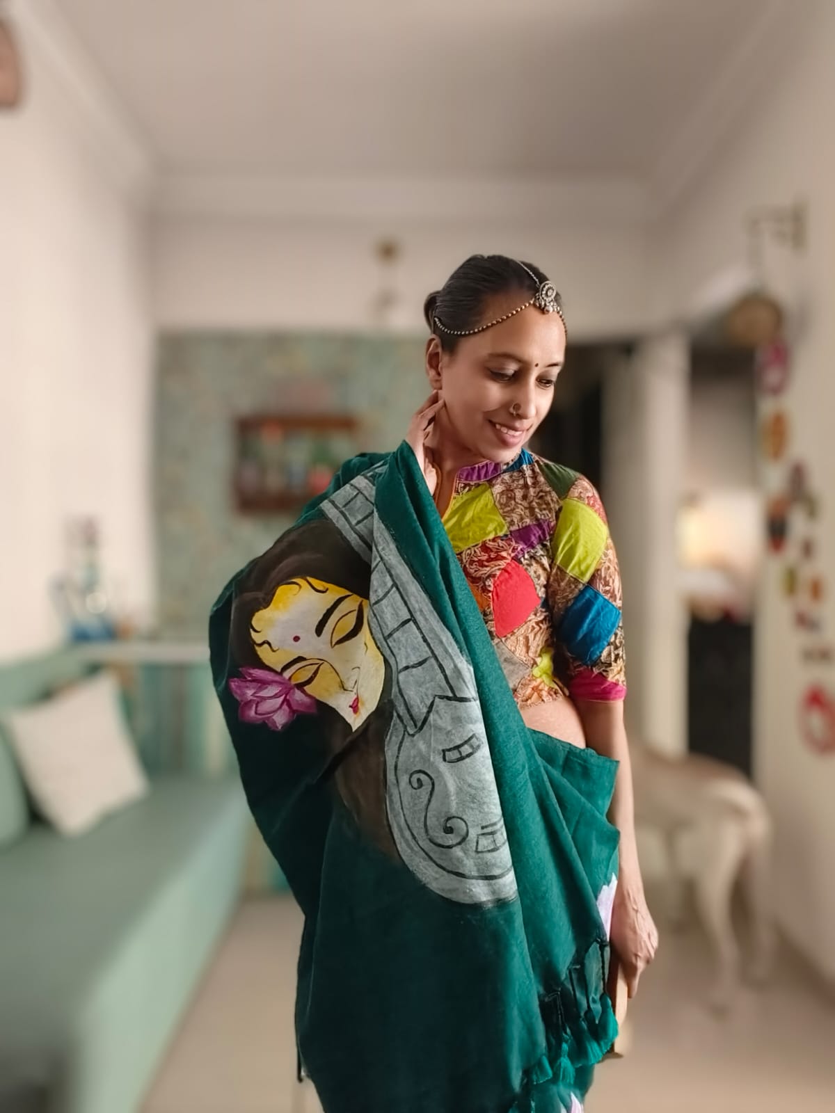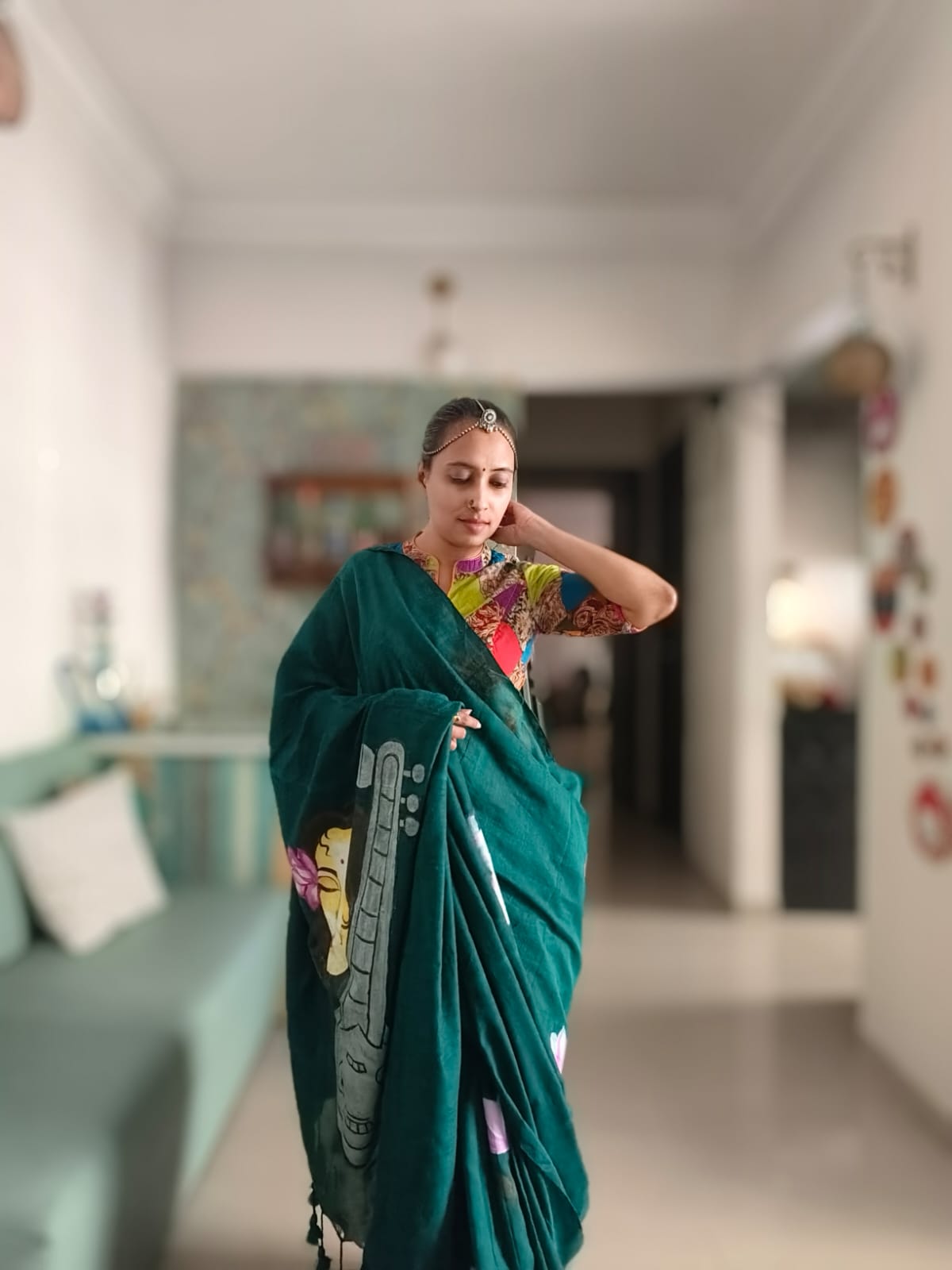 A Peacock Blue Mesmerising Meera with Sitar Handpainted Khadi Mul Cotton SareeĀ .