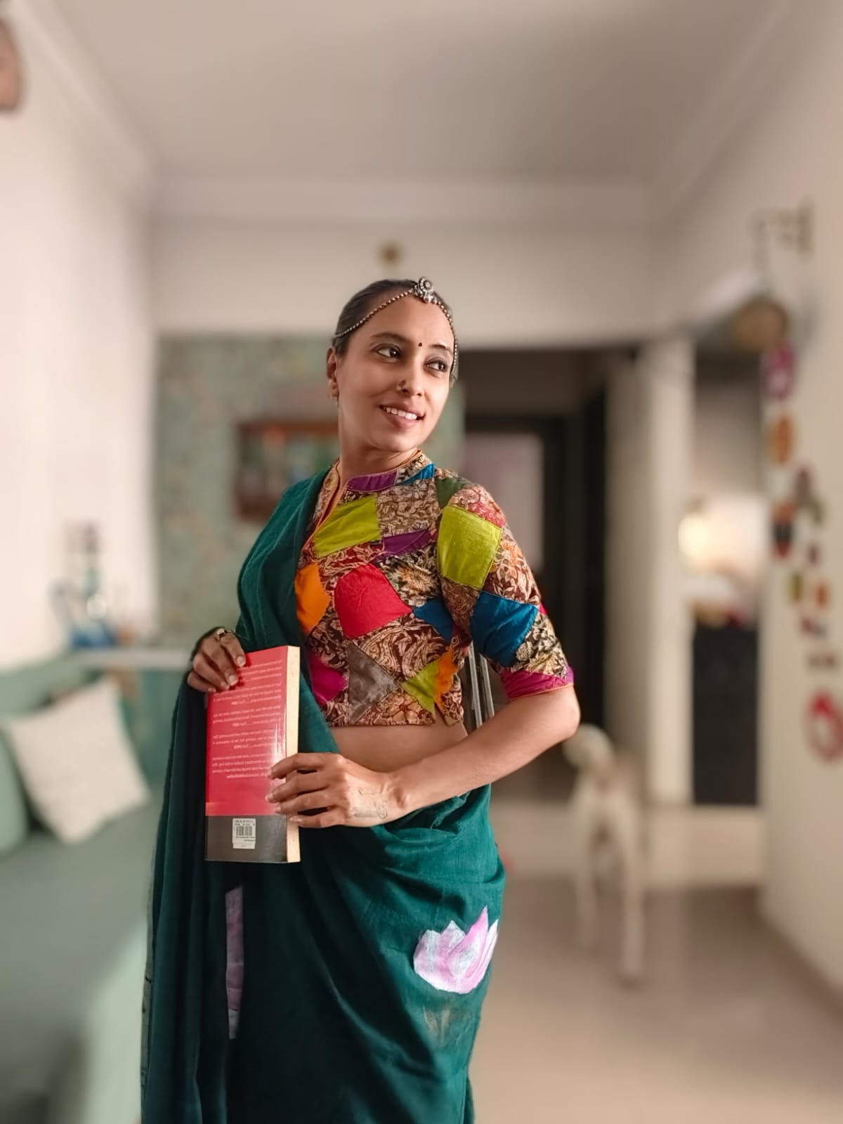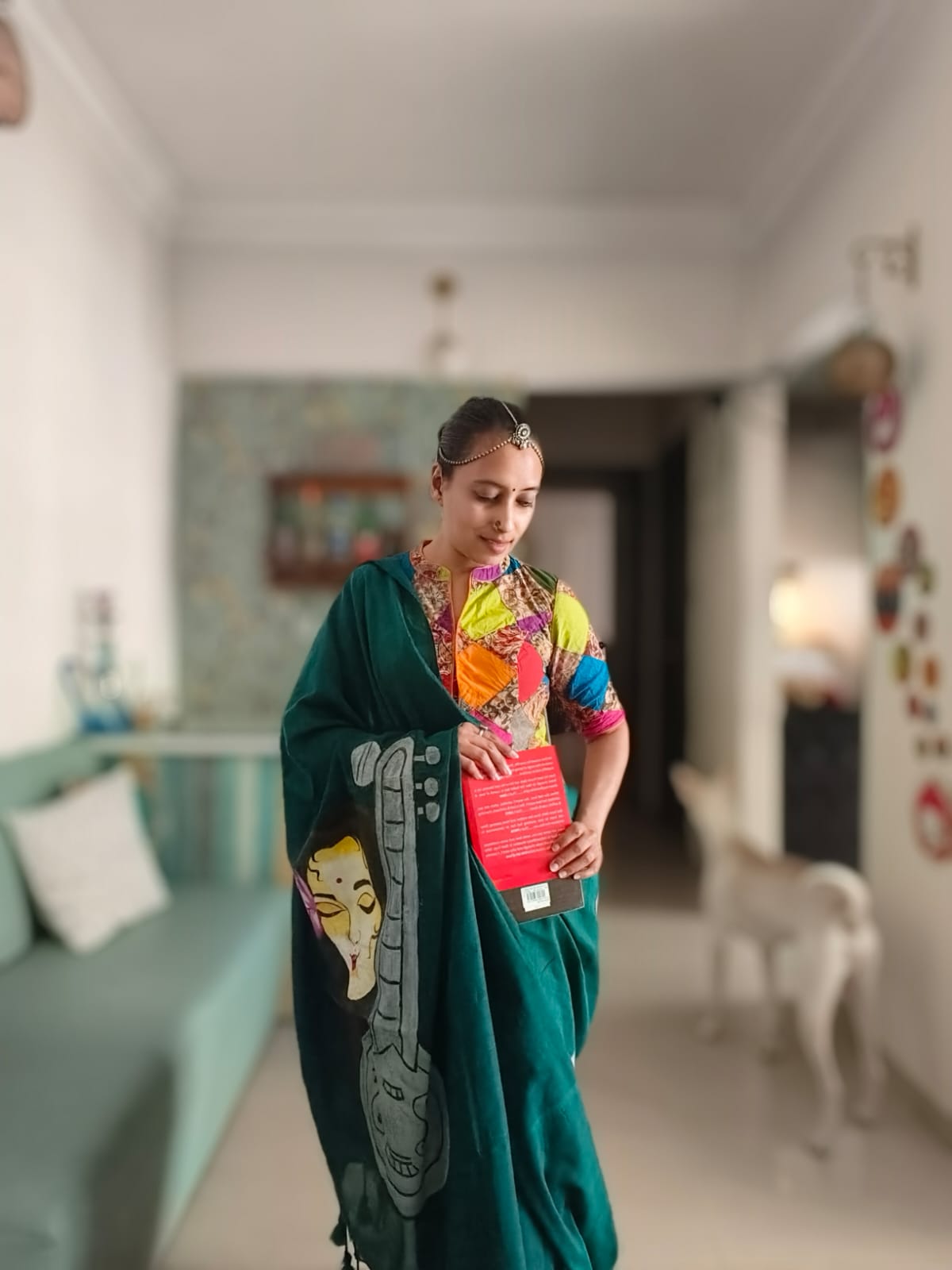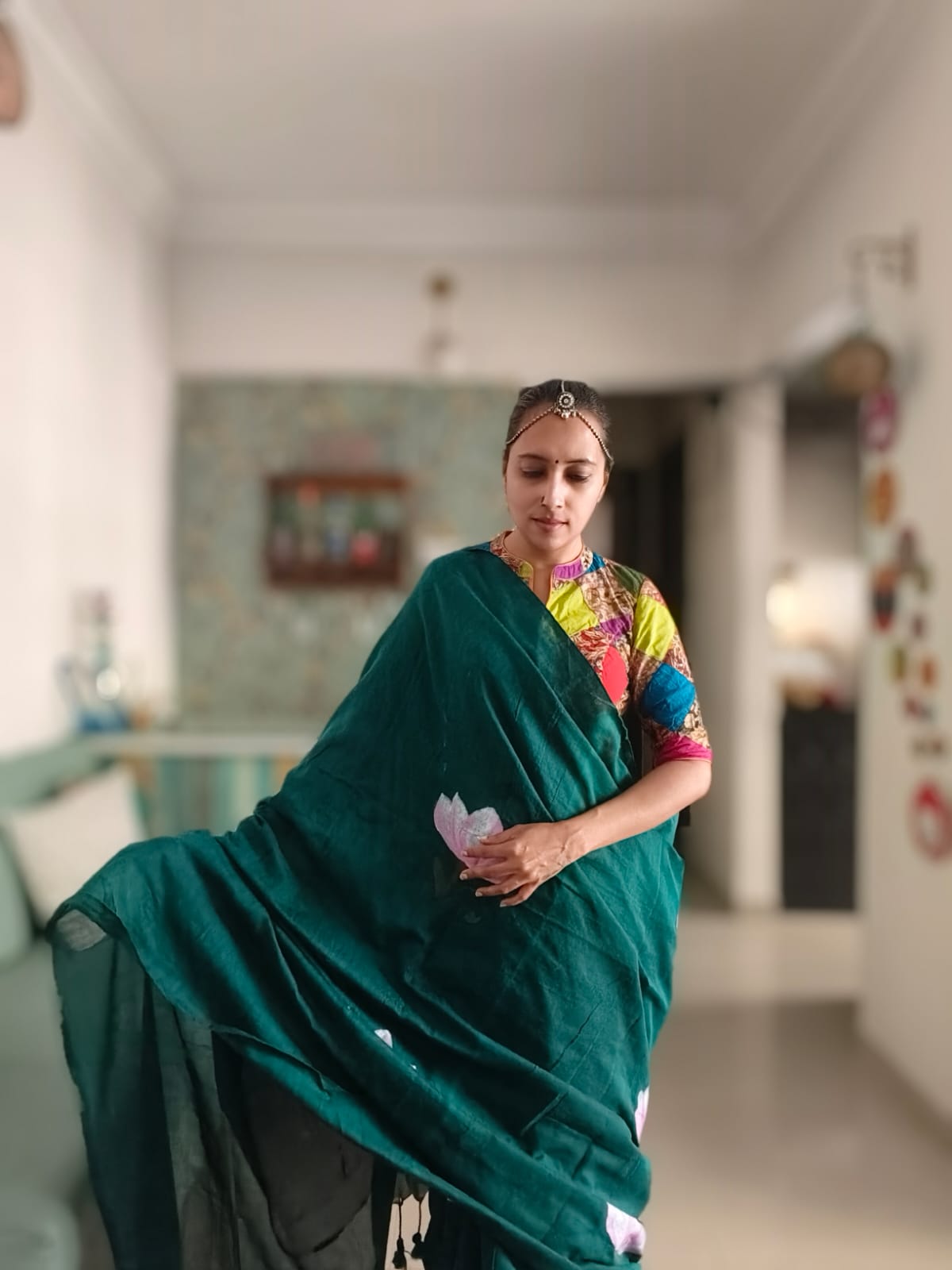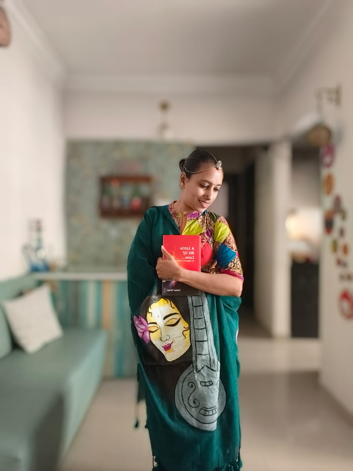 A Peacock Blue Mesmerising Meera with Sitar Handpainted Khadi Mul Cotton SareeĀ .