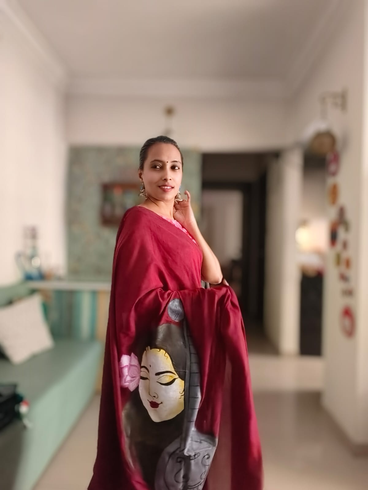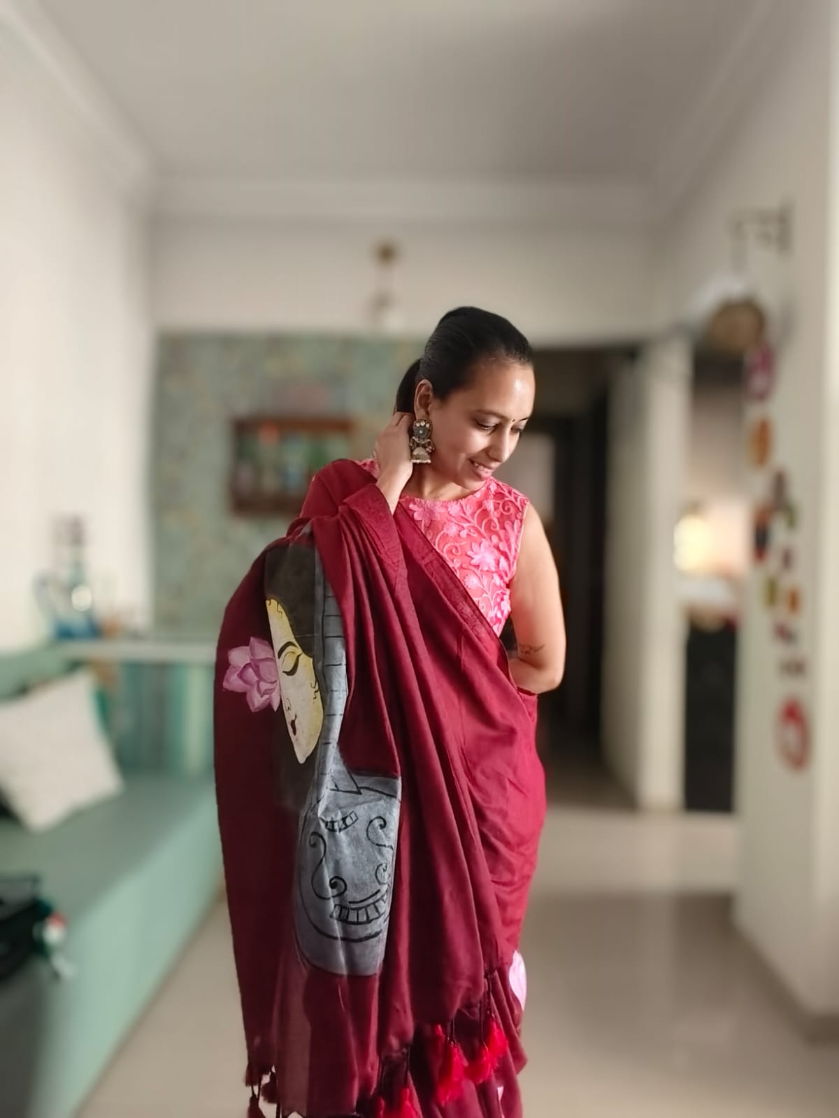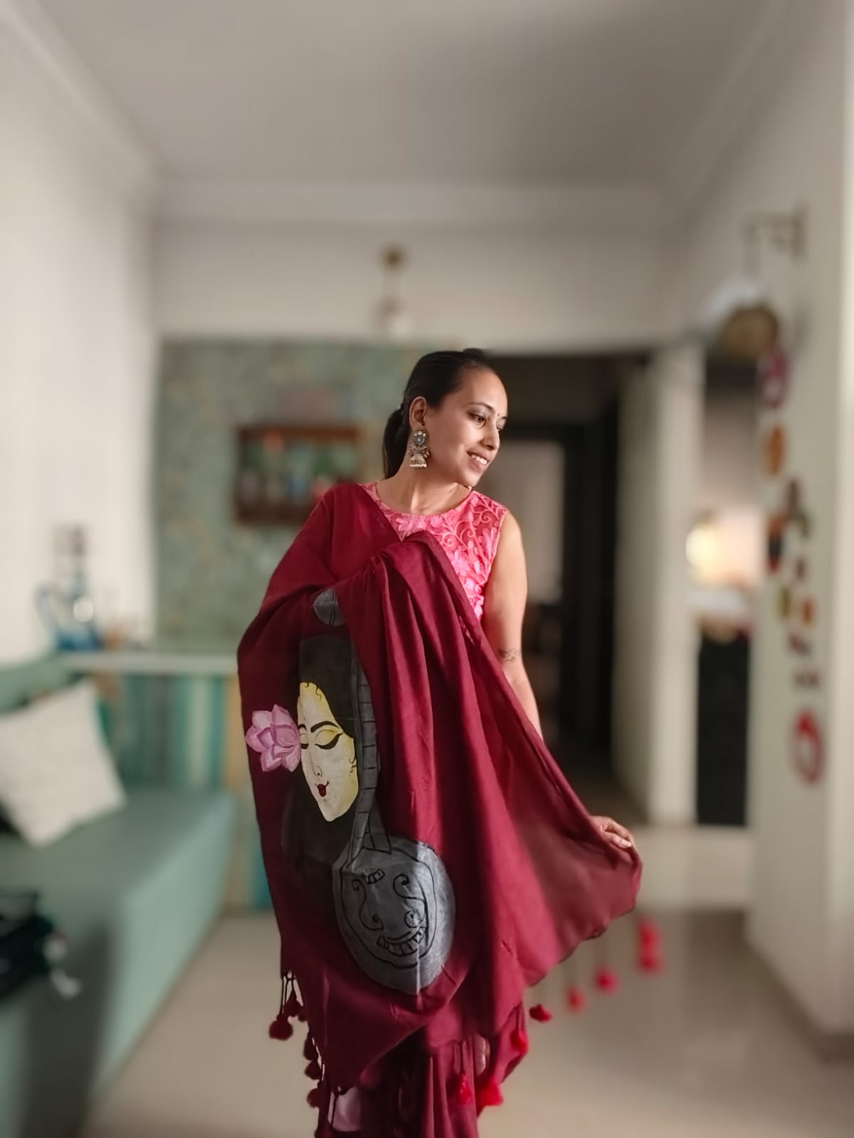 A Burgundy Mesmerising Meera with Sitar Handpainted Khadi Mul Cotton SareeĀ .