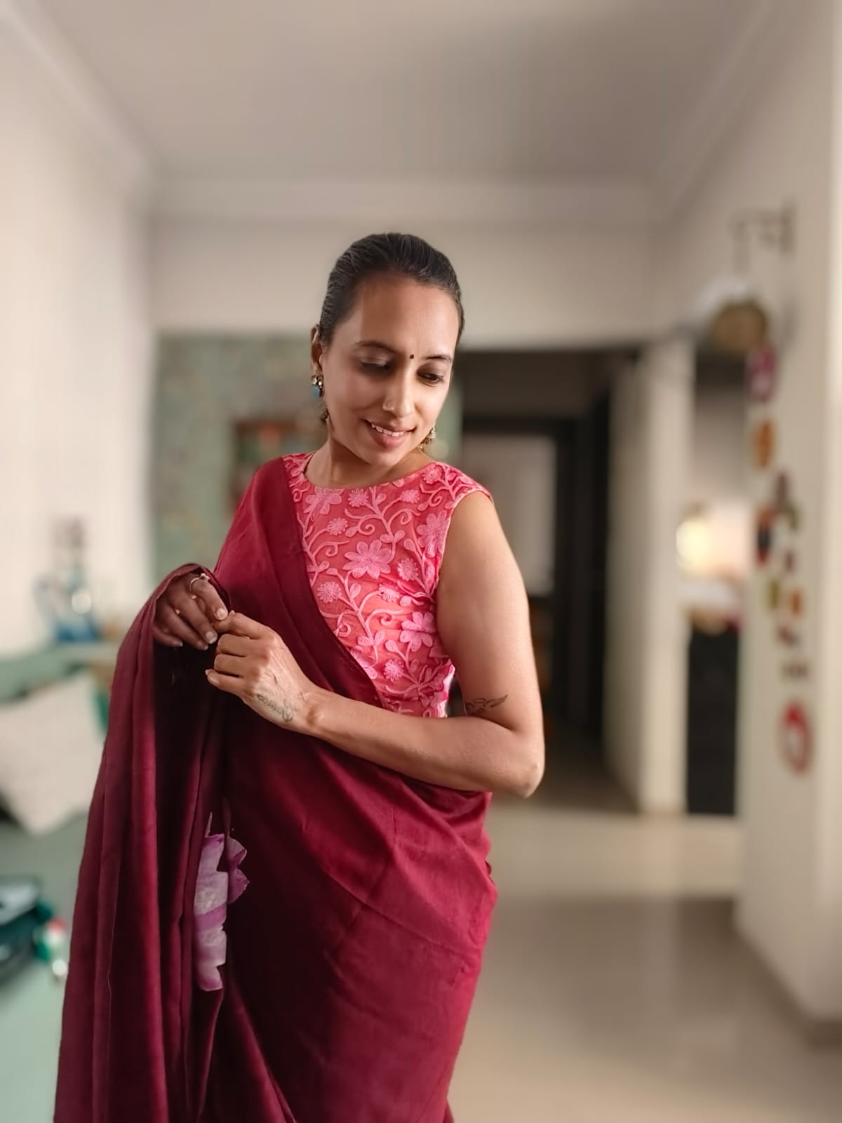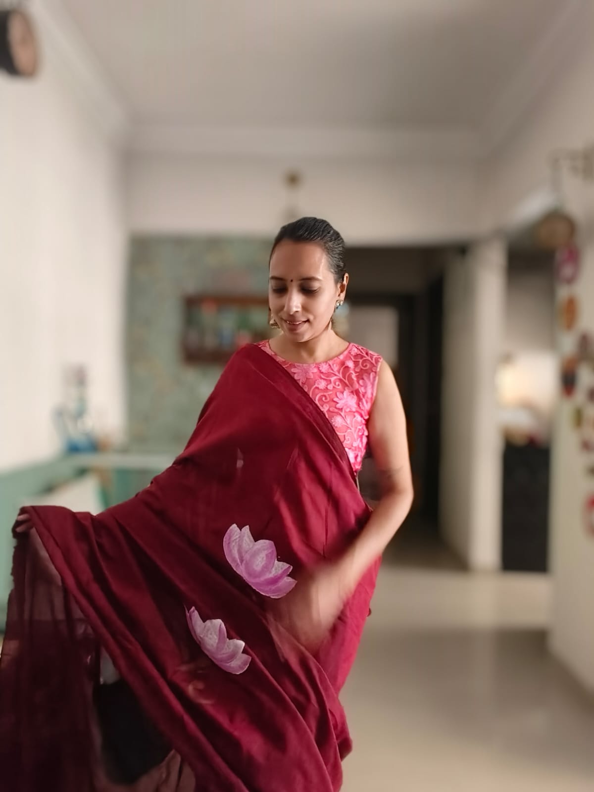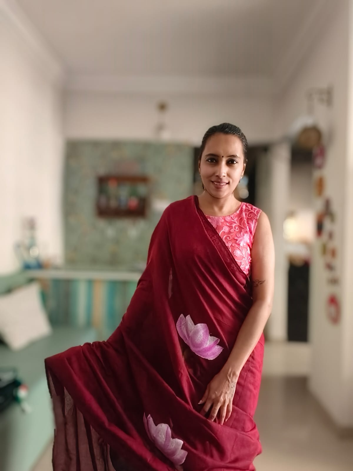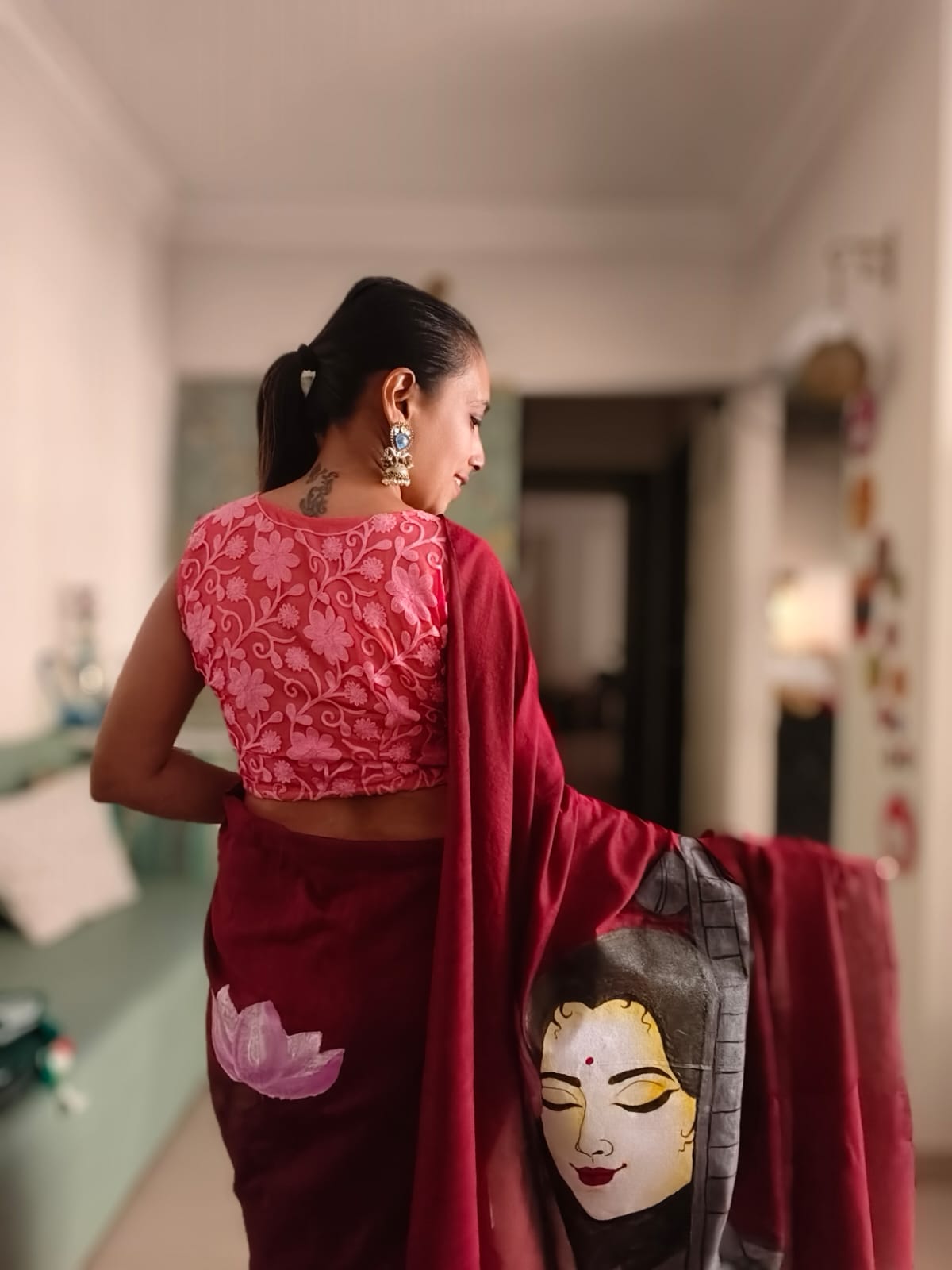 A Burgundy Mesmerising Meera with Sitar Handpainted Khadi Mul Cotton SareeĀ .