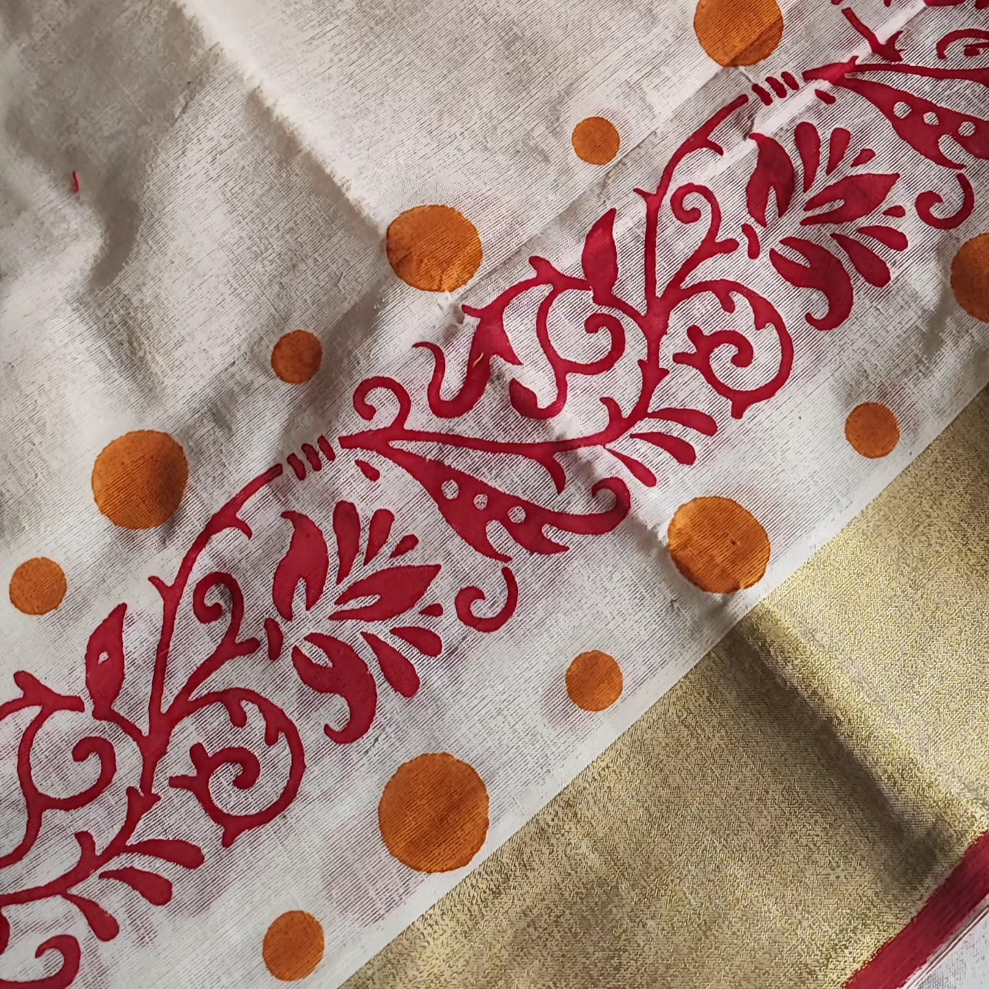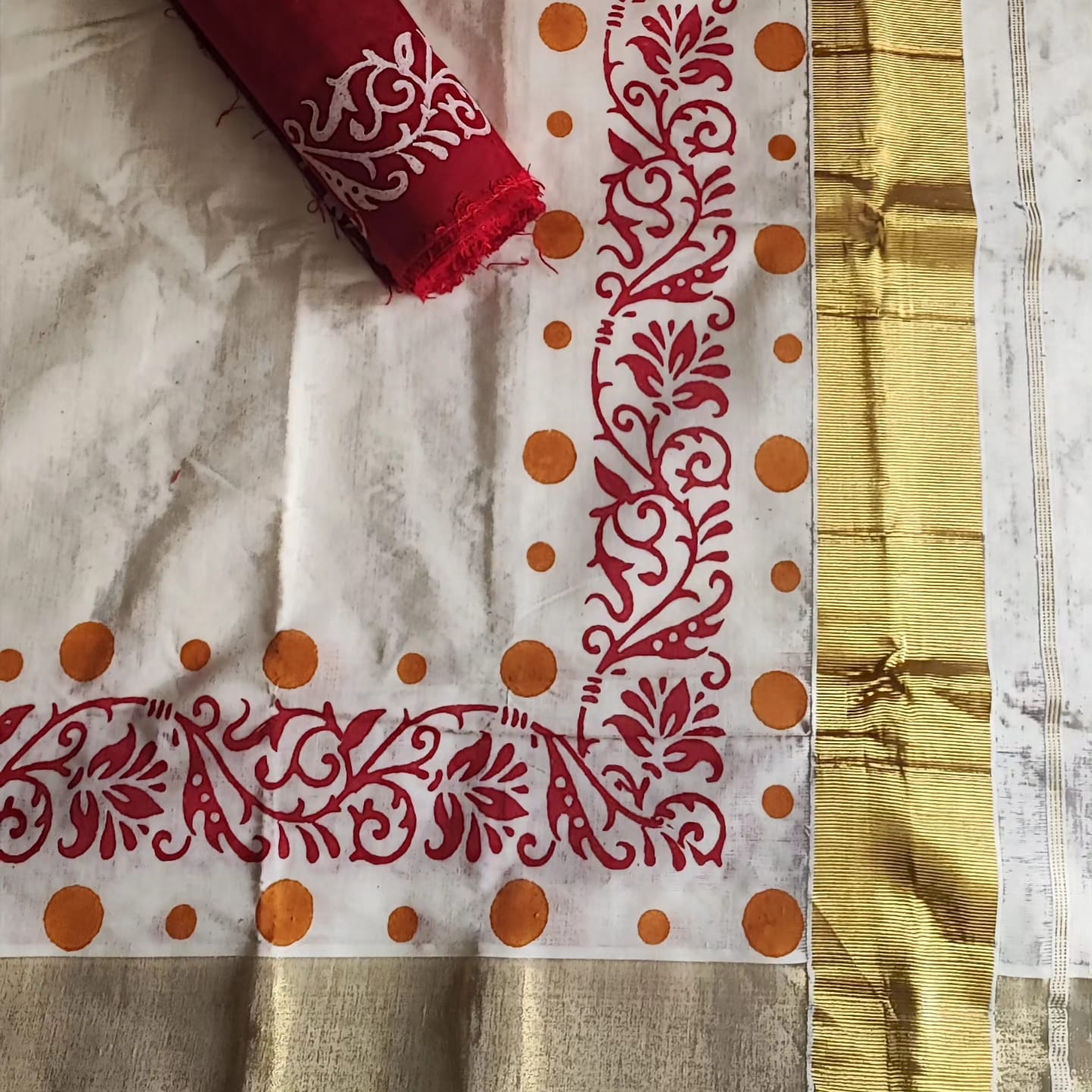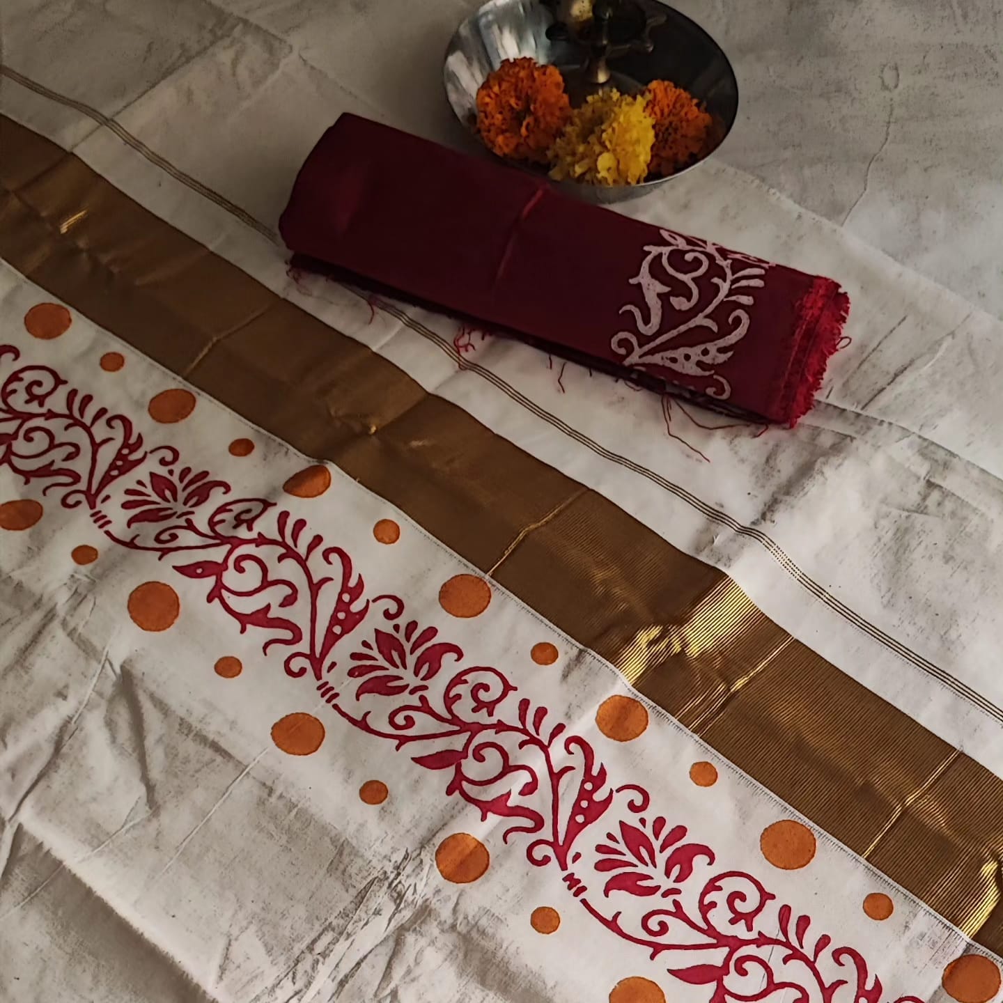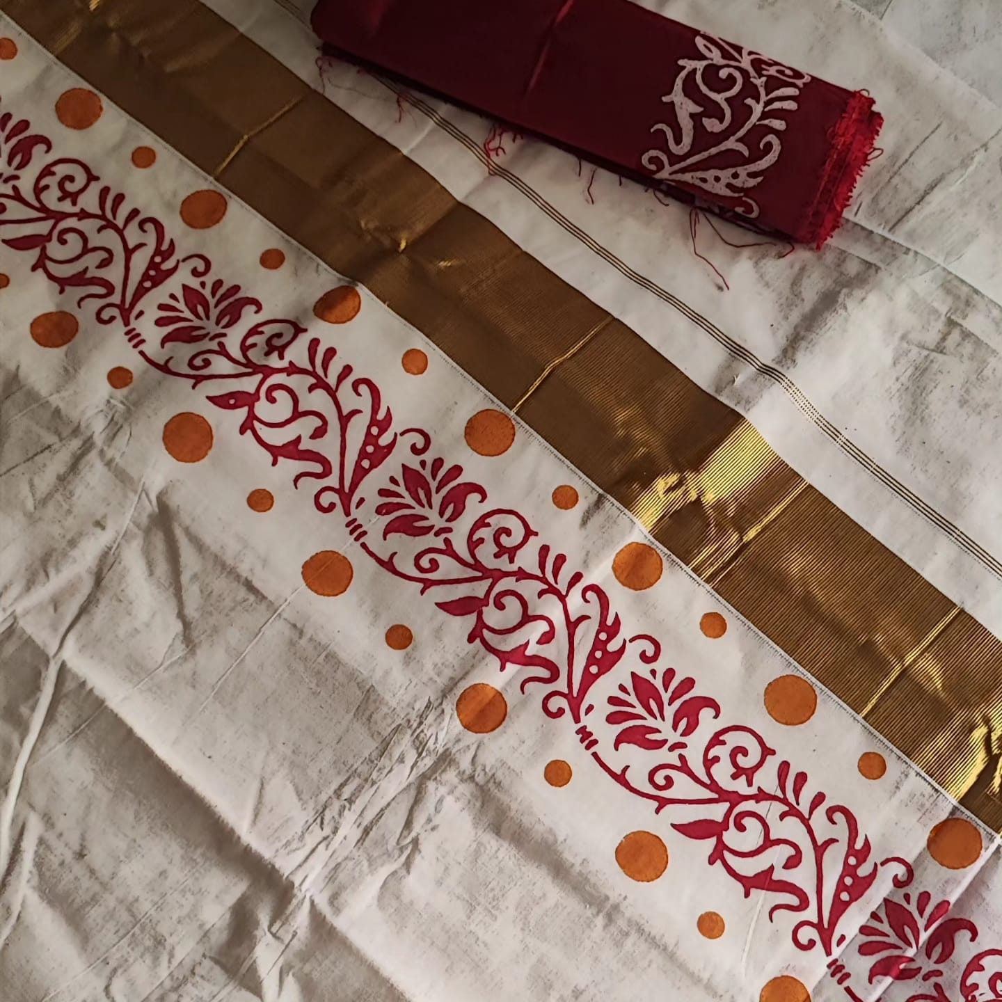 A Golden Border Cotton Hand Painted Saree with Contrast Blouse