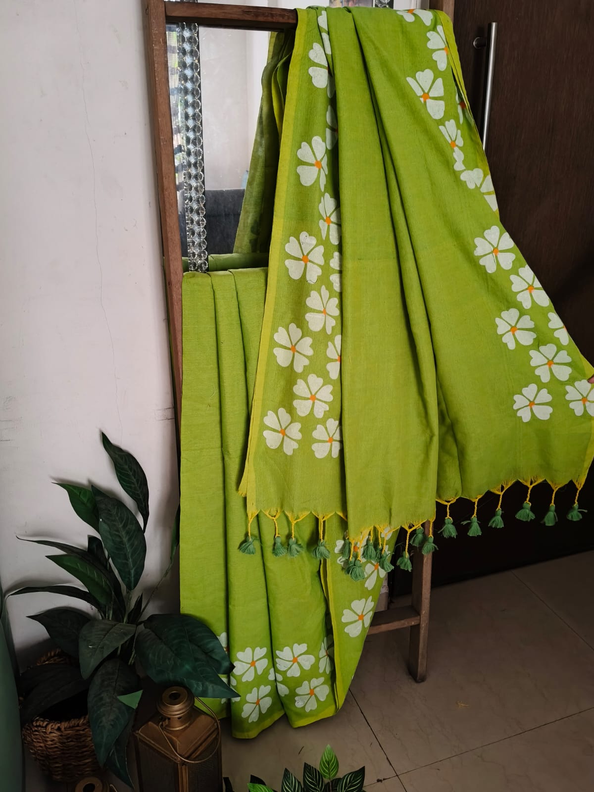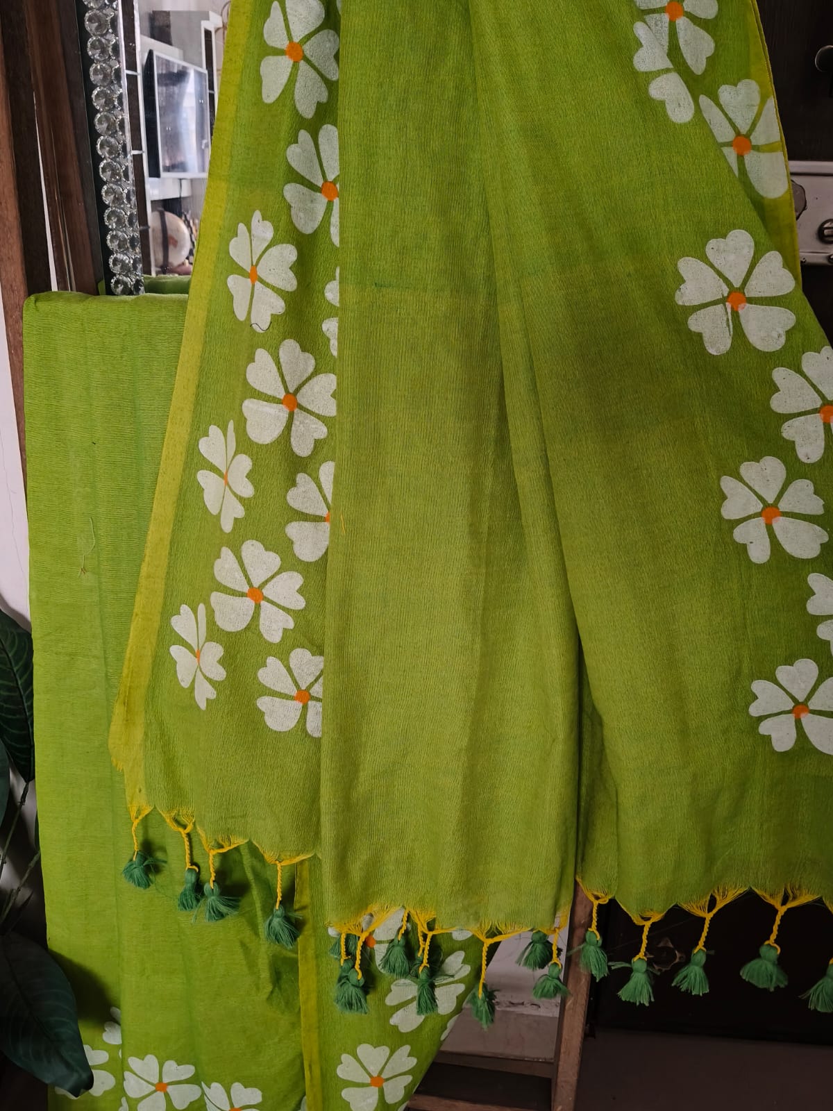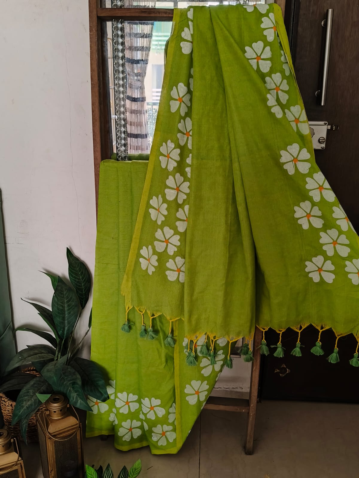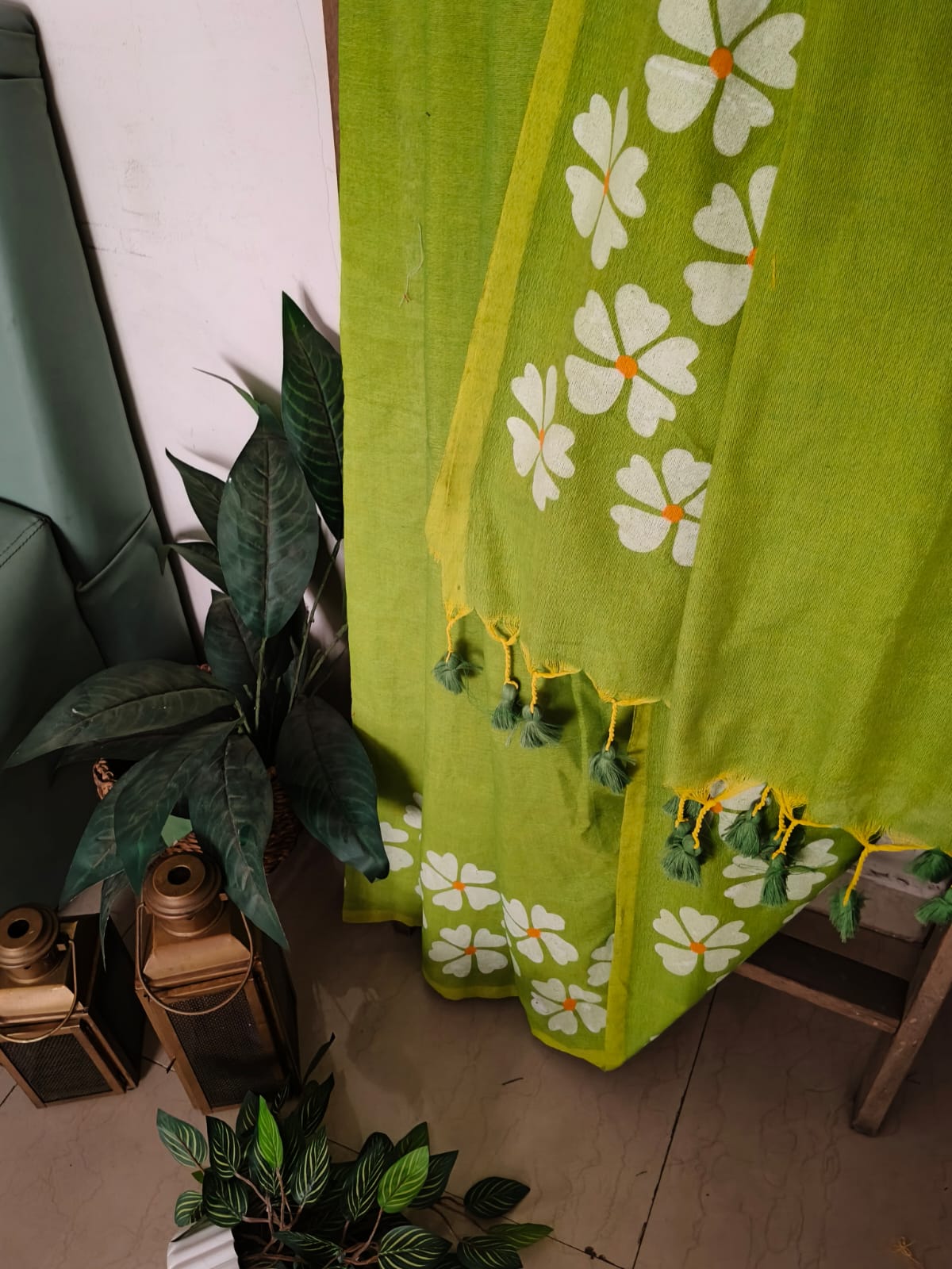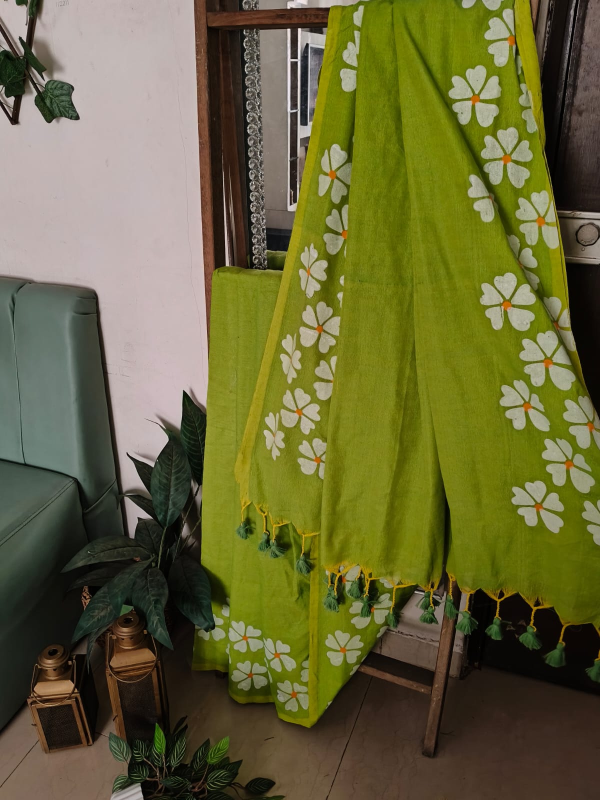 A Chartreuse Green Handpainted Prajakta Mul Cotton Saree. No BLouse.