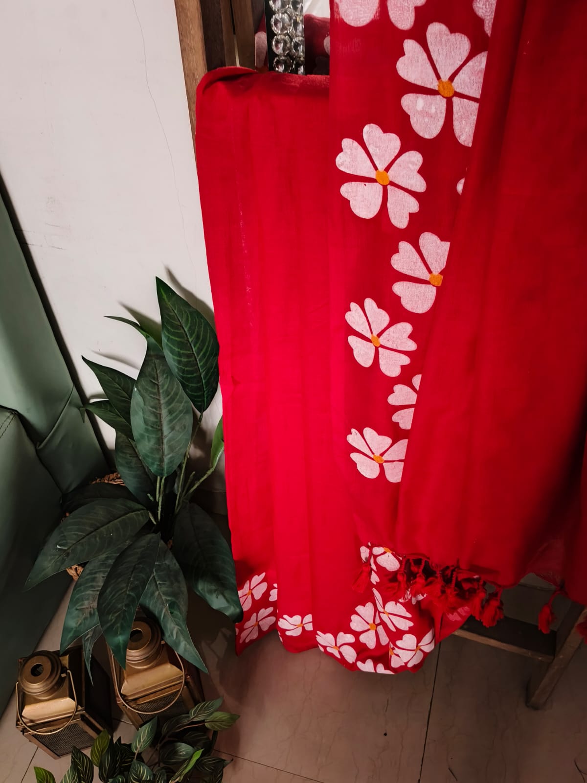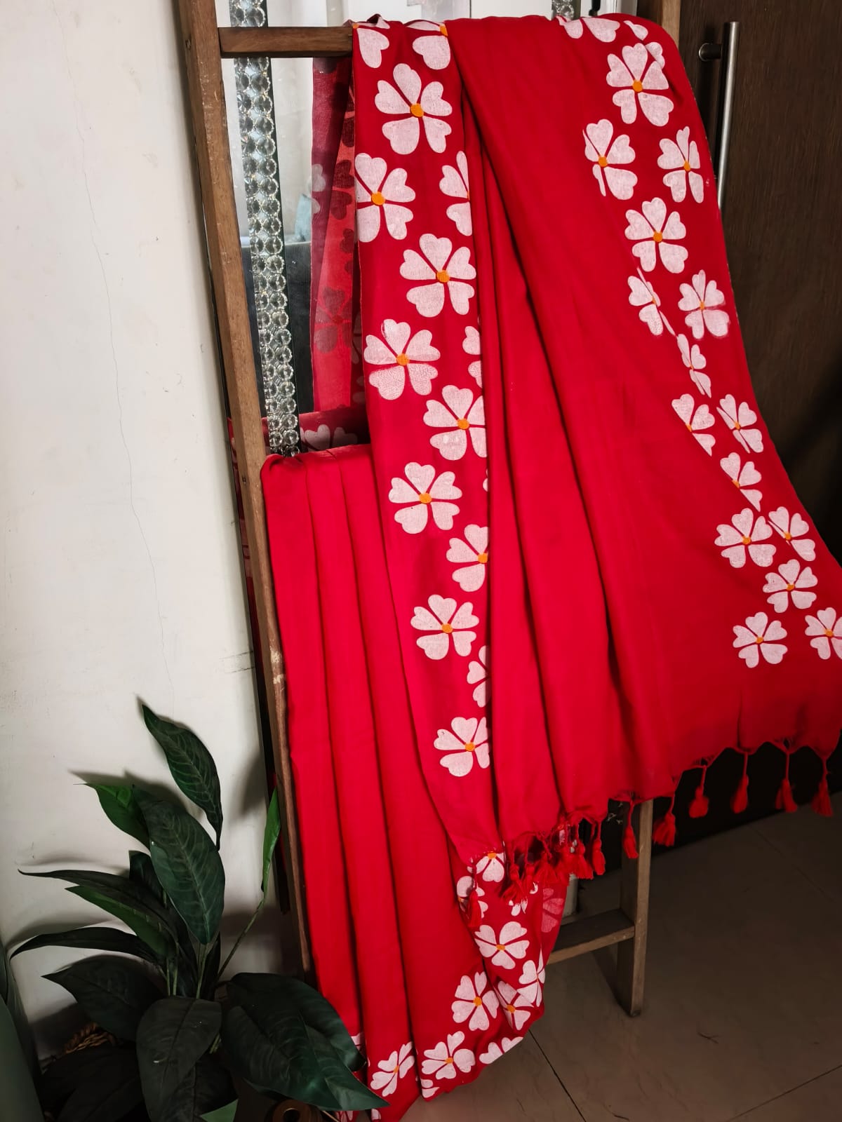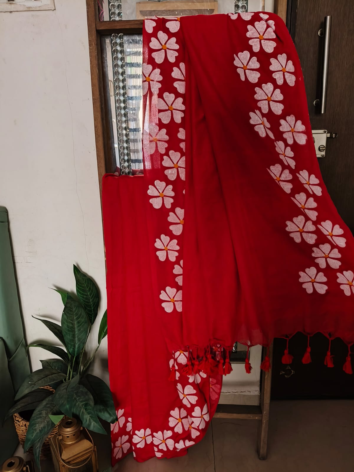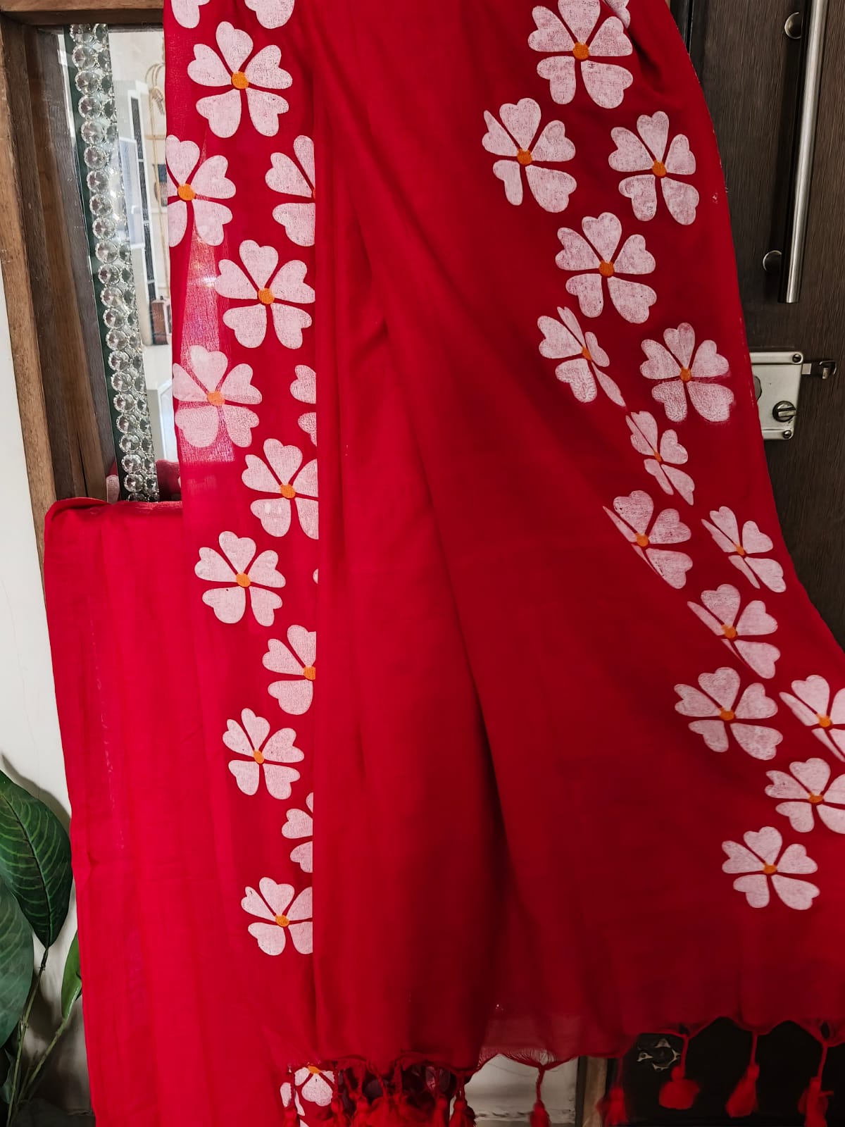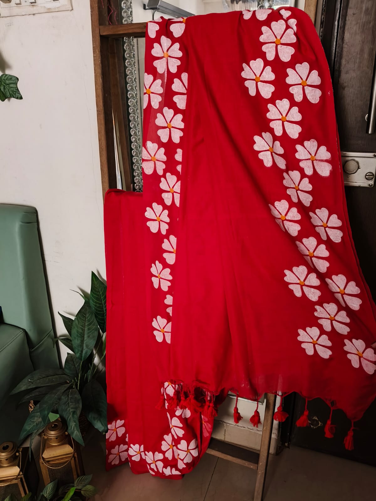 A Red Handpainted Prajakta Mul Cotton Saree. No BLouse.