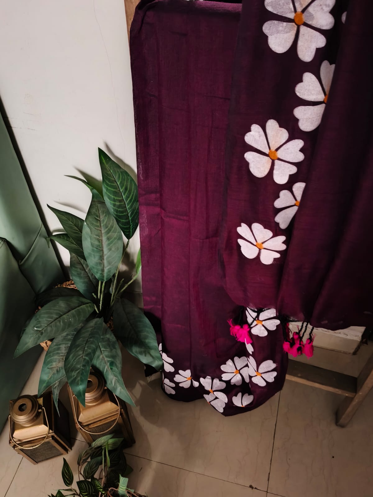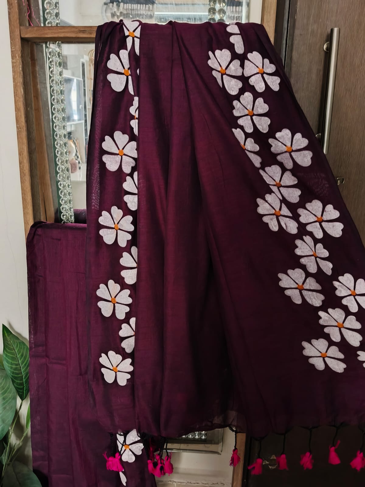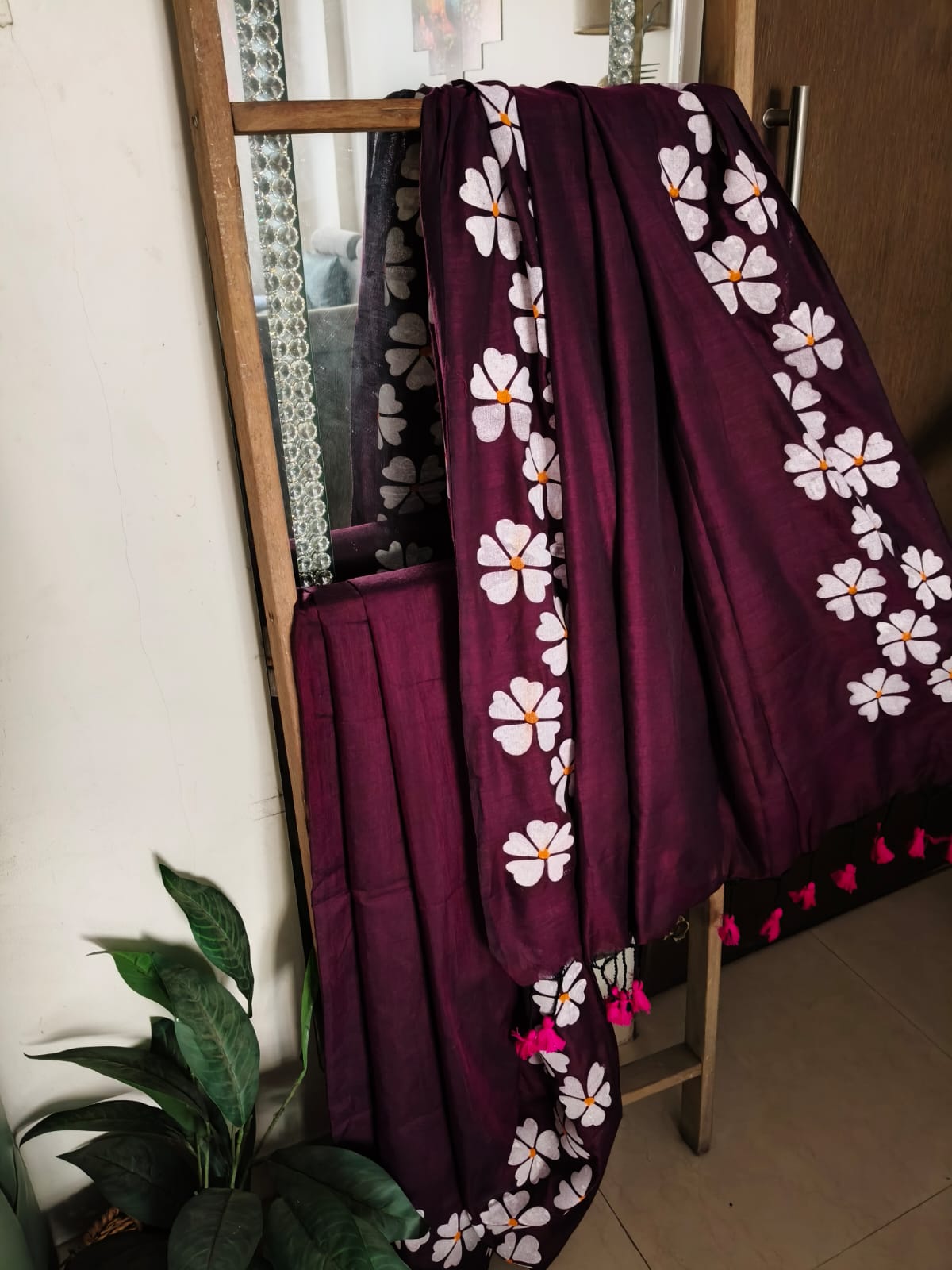 A Burgundy Handpainted Prajakta Mul Cotton Saree. No BLouse.