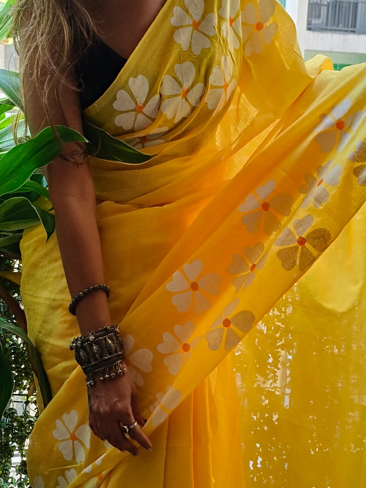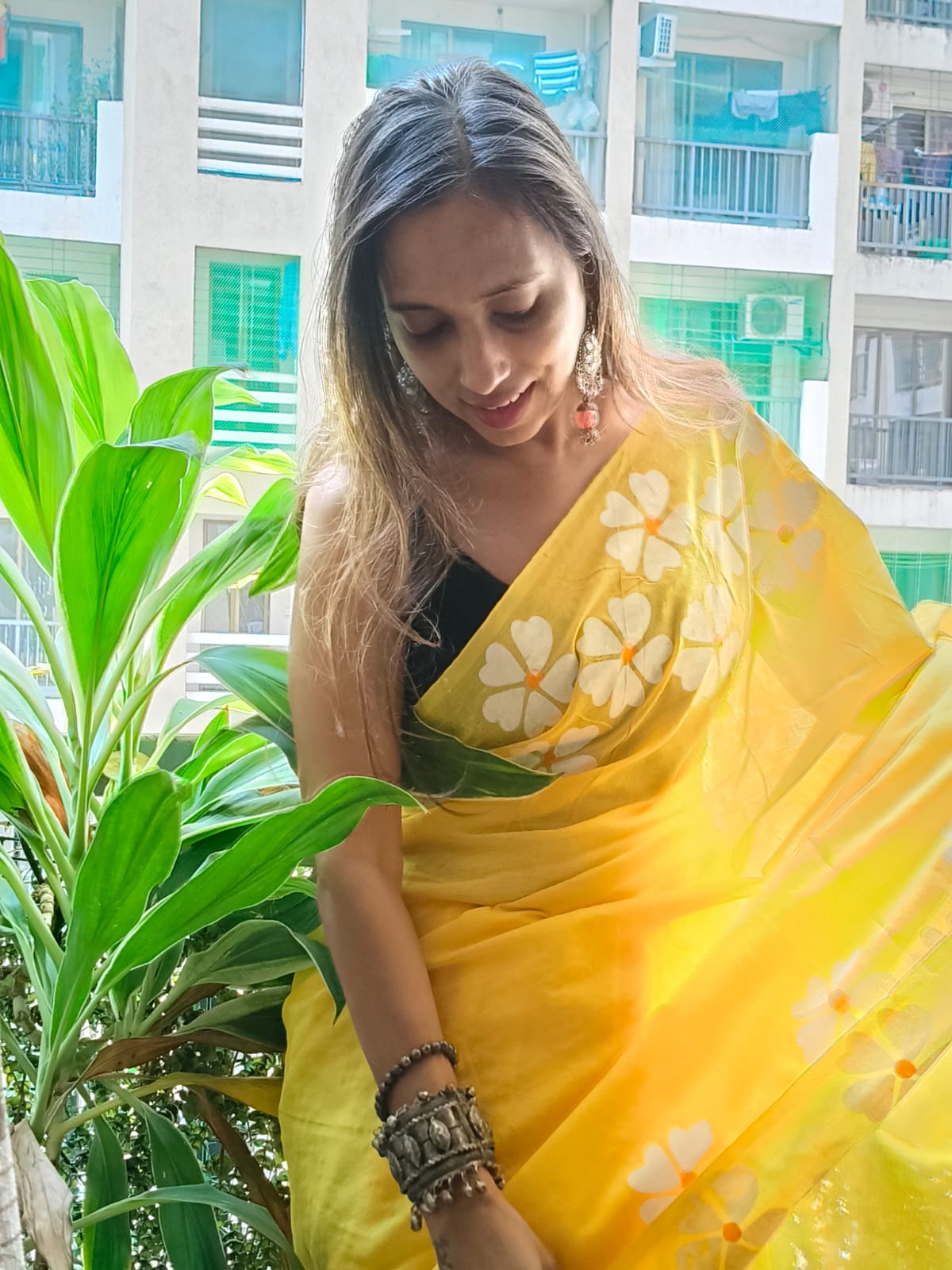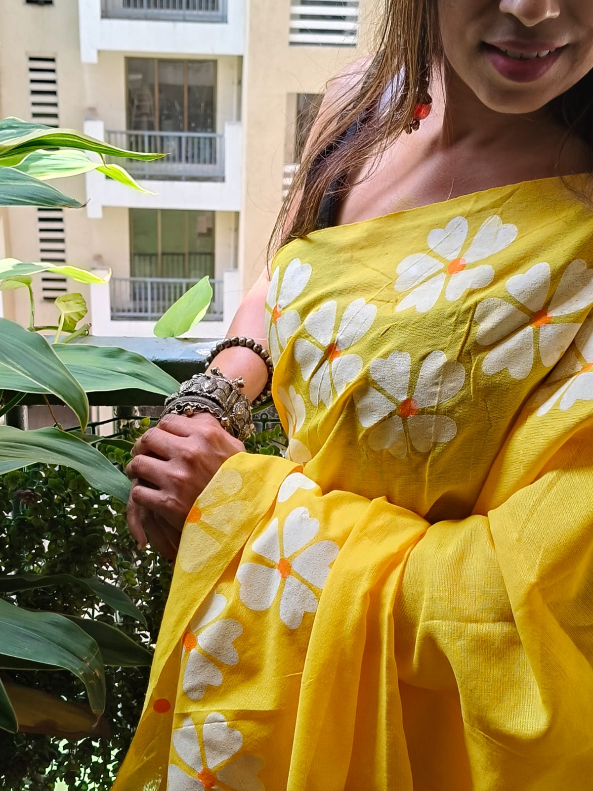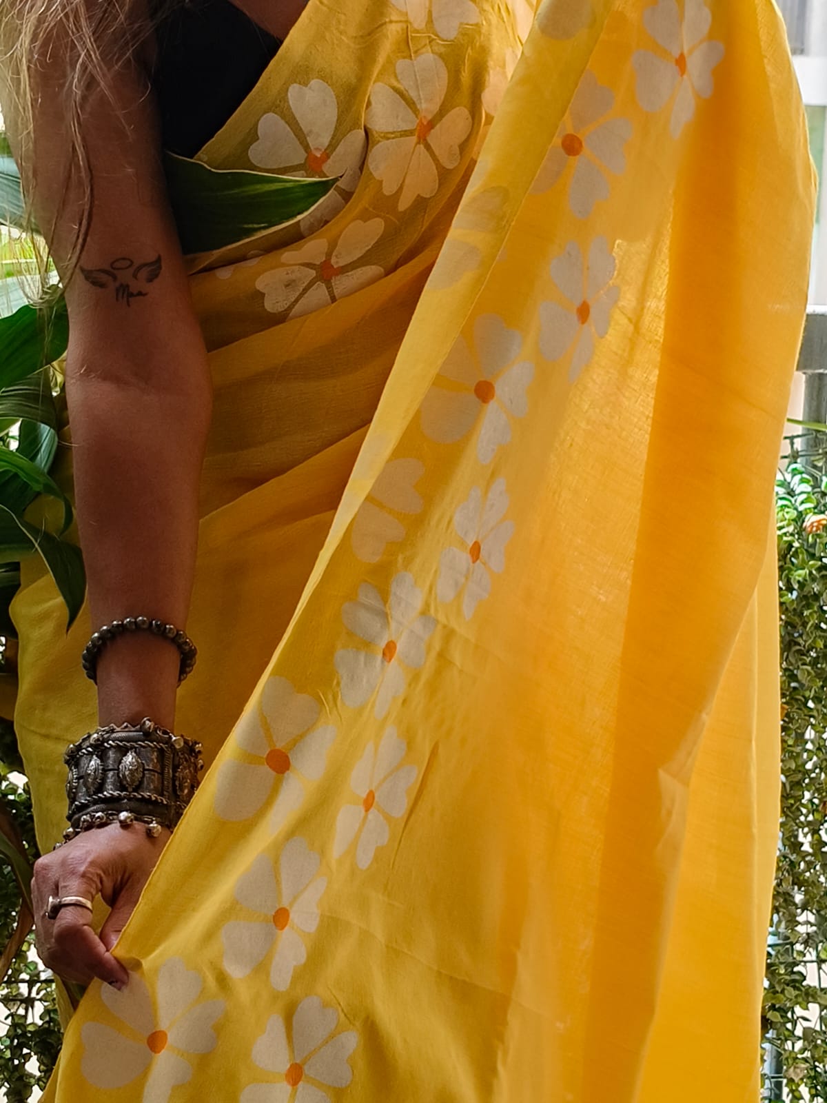 A Yellow Handpainted Prajakta Mul Cotton Saree. No BLouse.