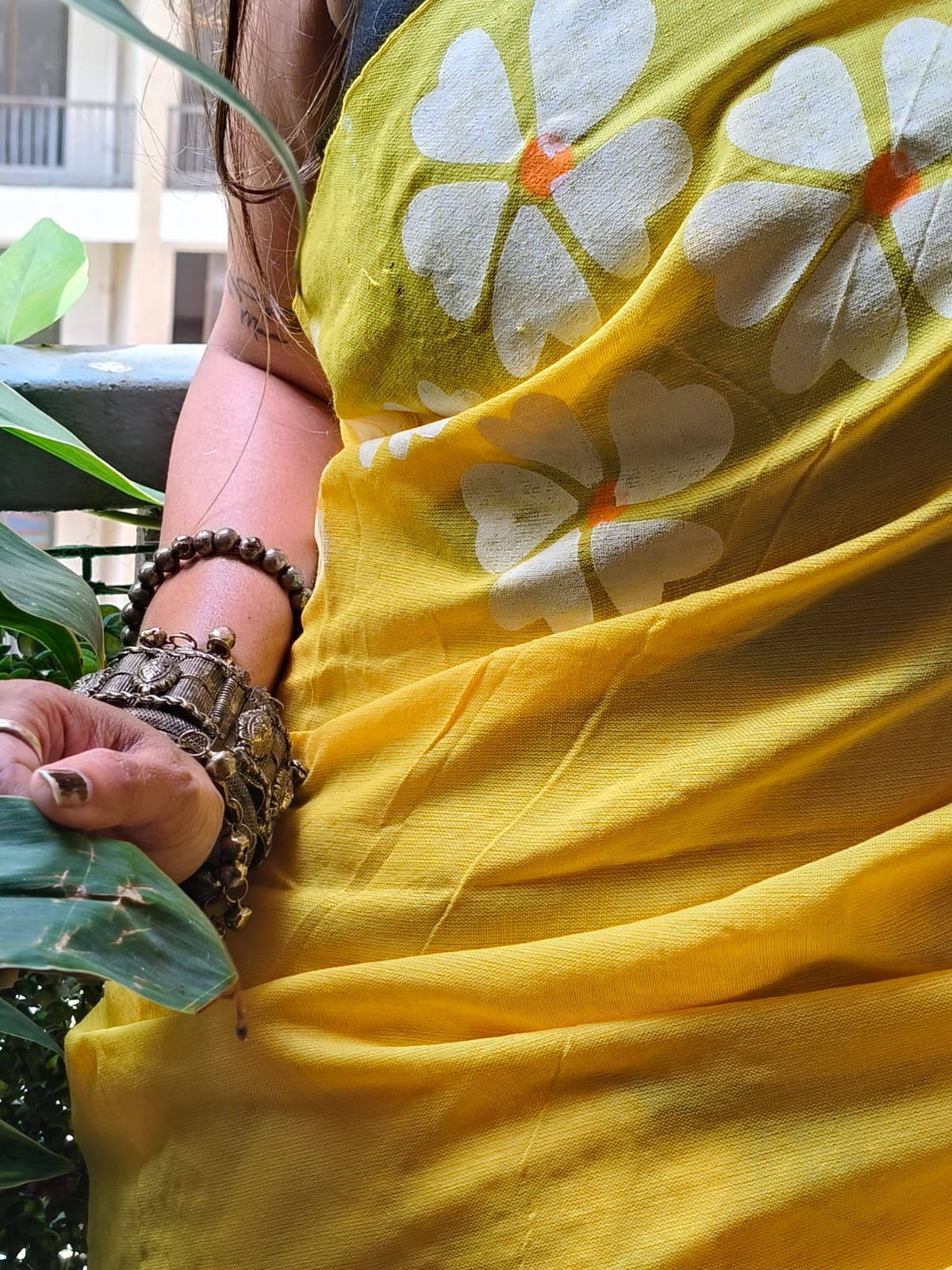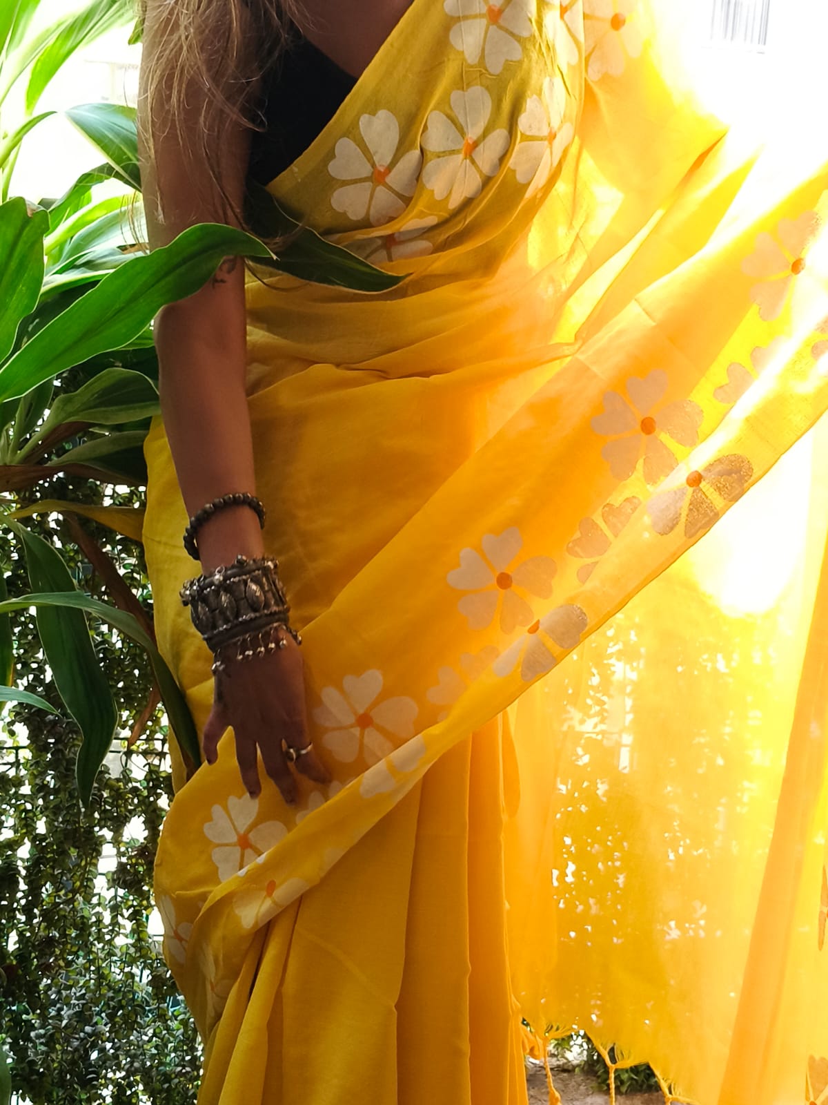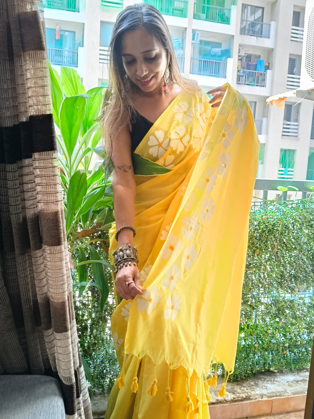 A Yellow Handpainted Prajakta Mul Cotton Saree. No BLouse.