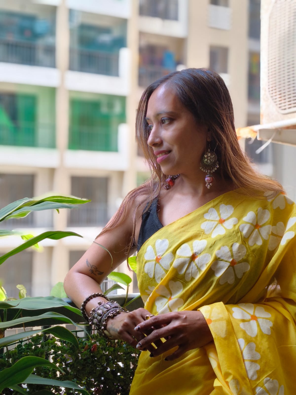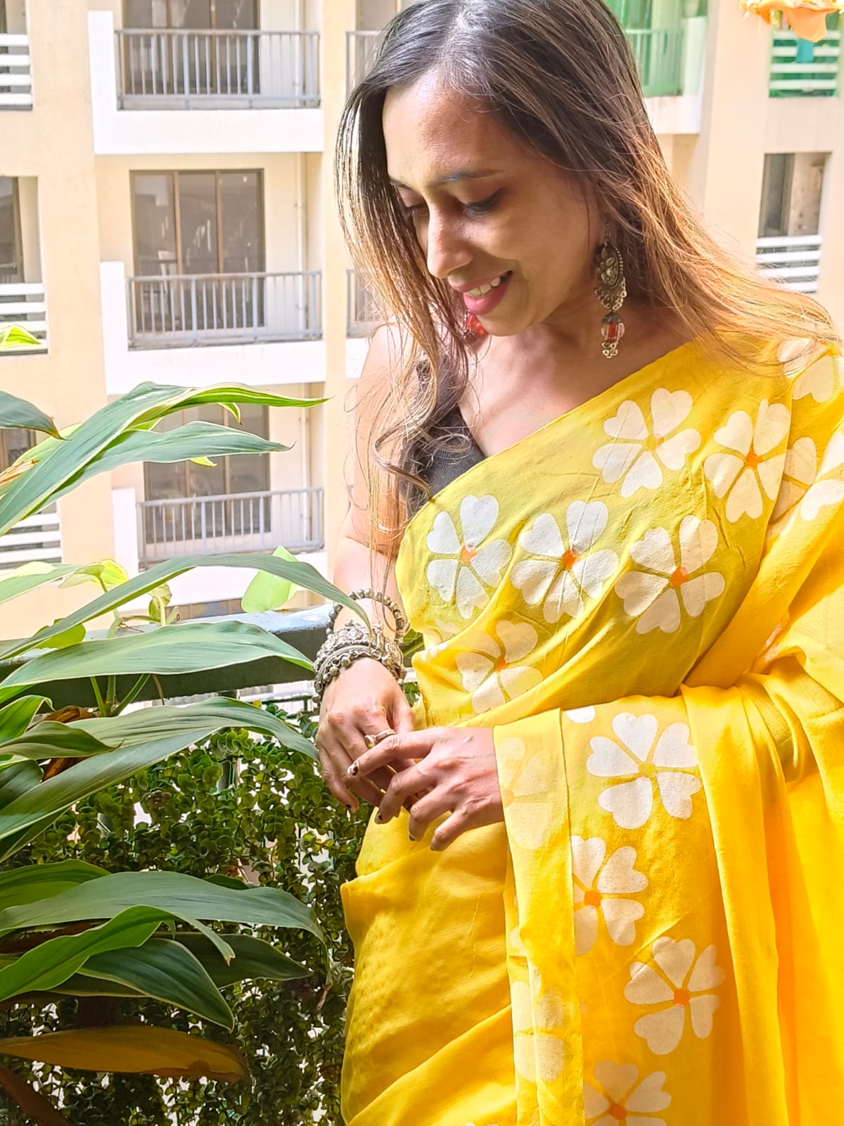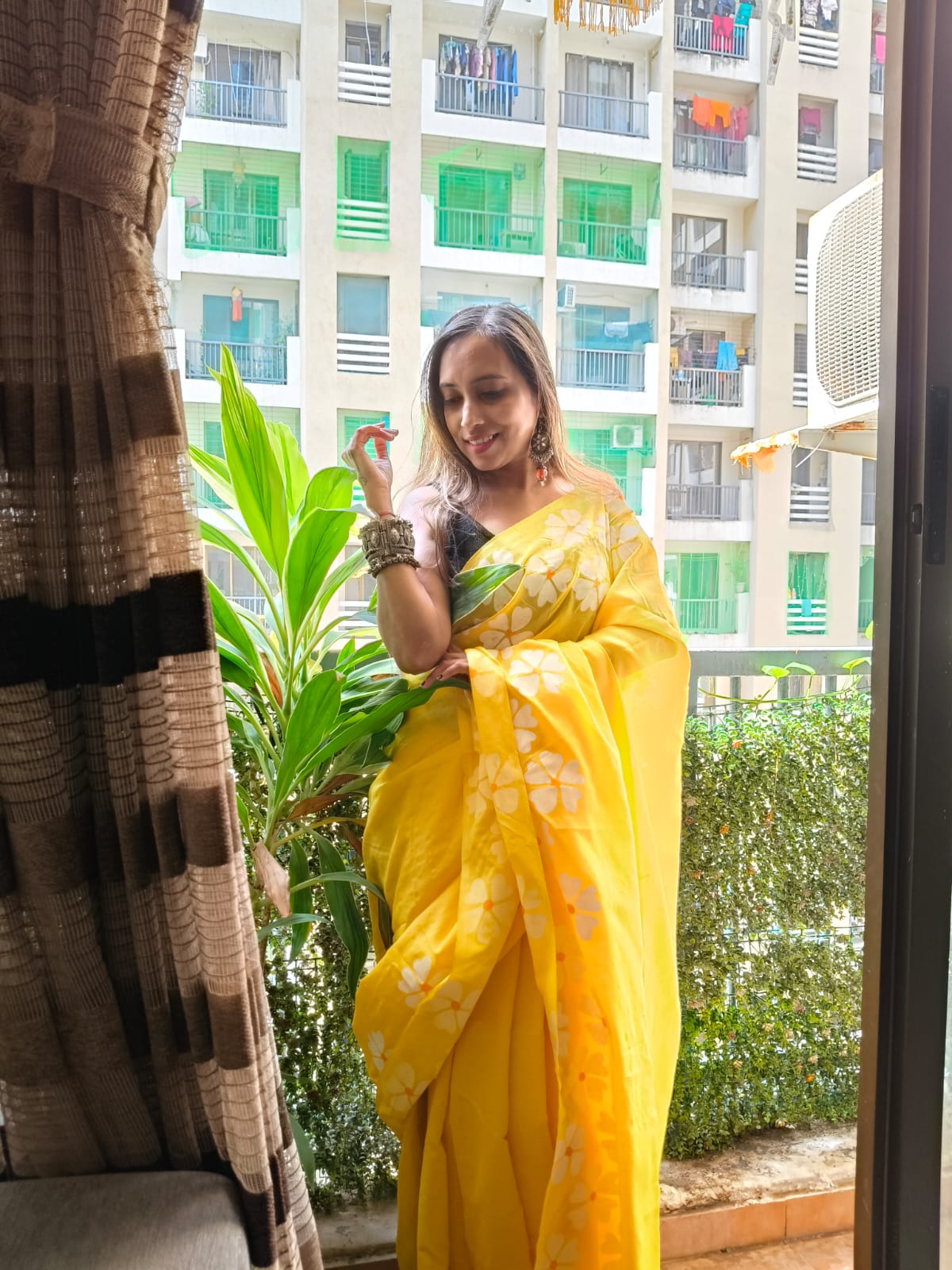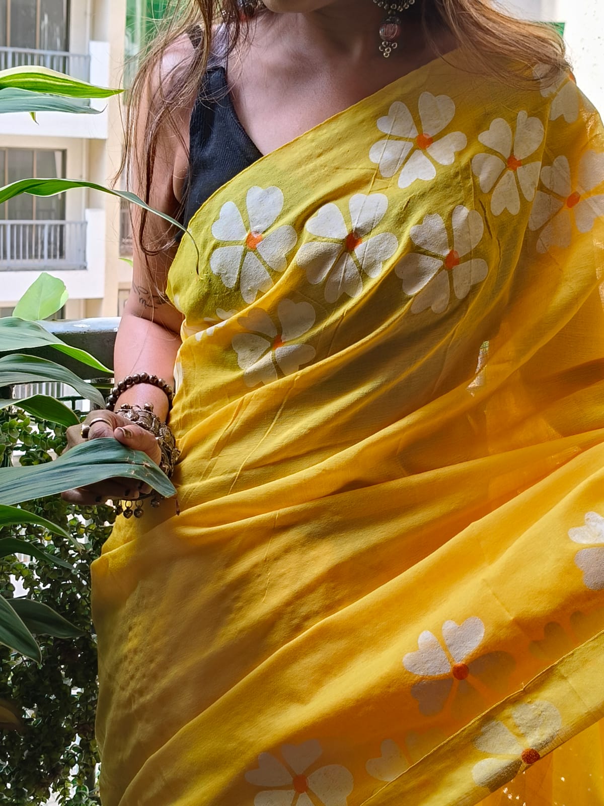A Yellow Handpainted Prajakta Mul Cotton Saree. No BLouse.