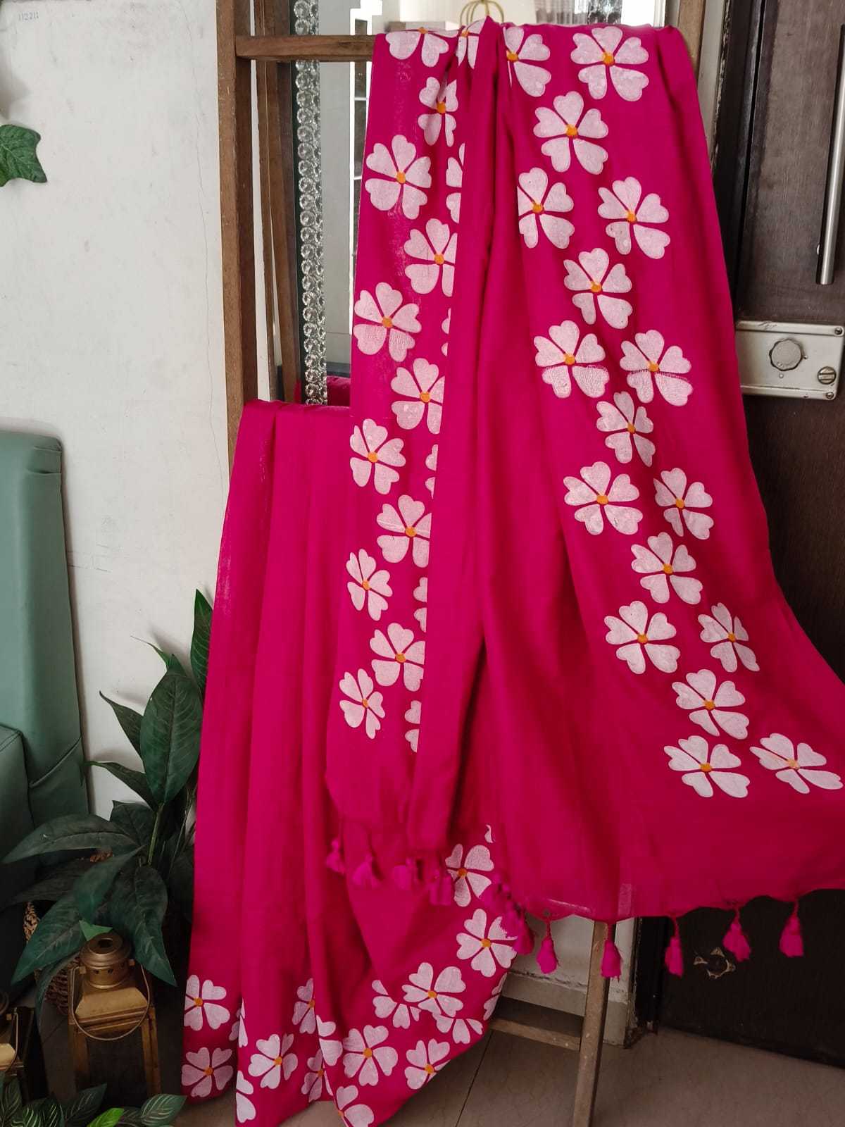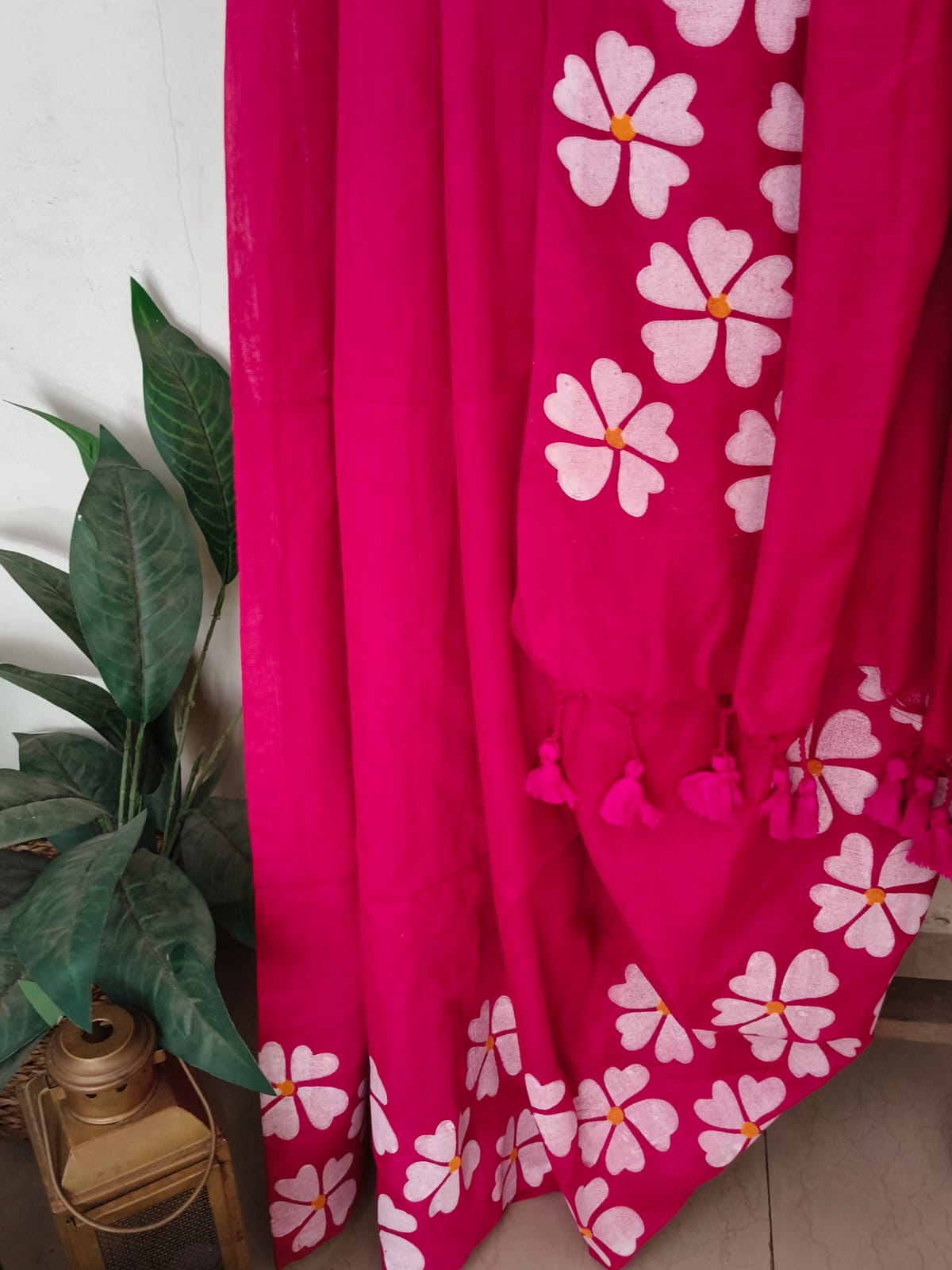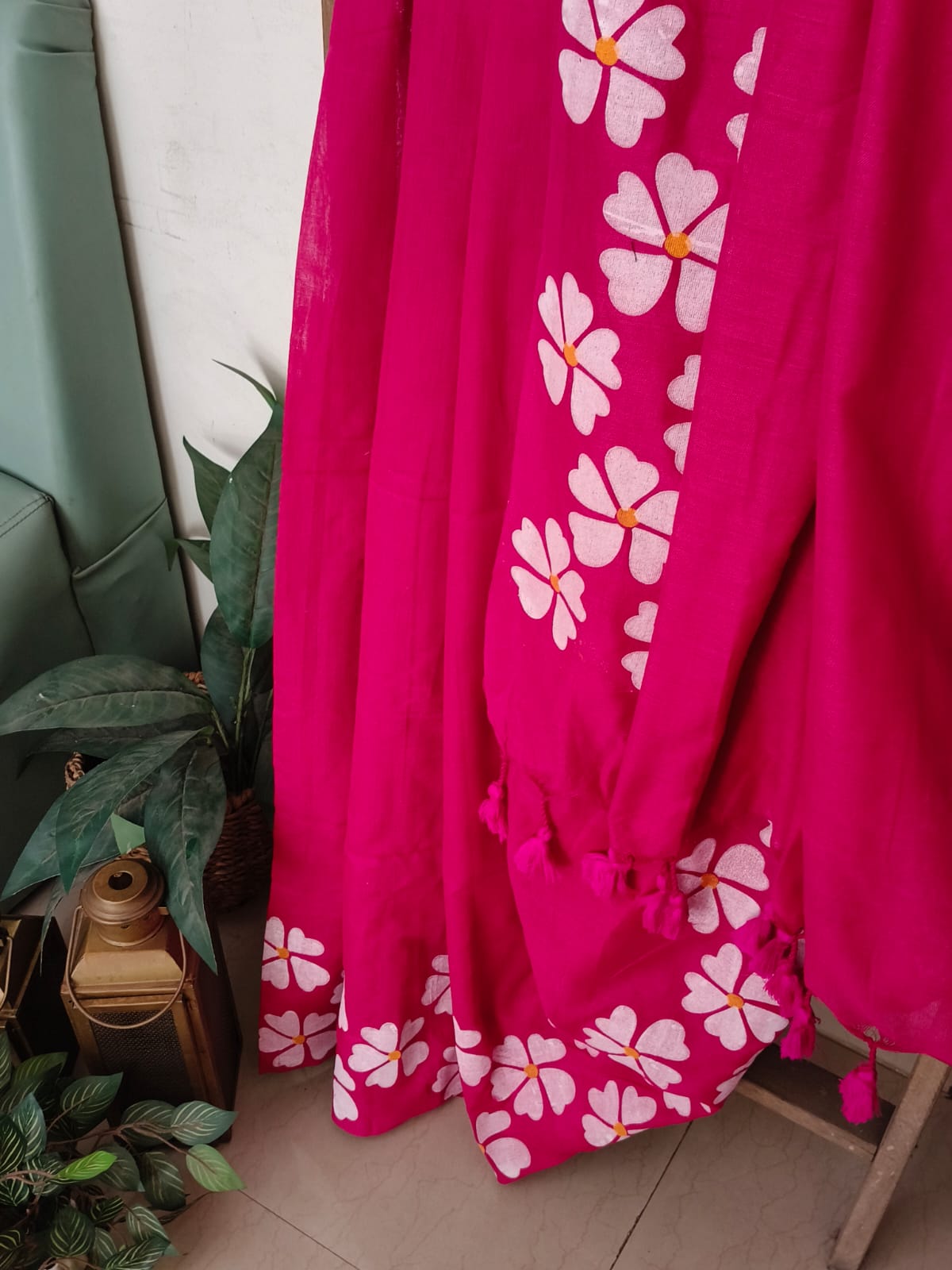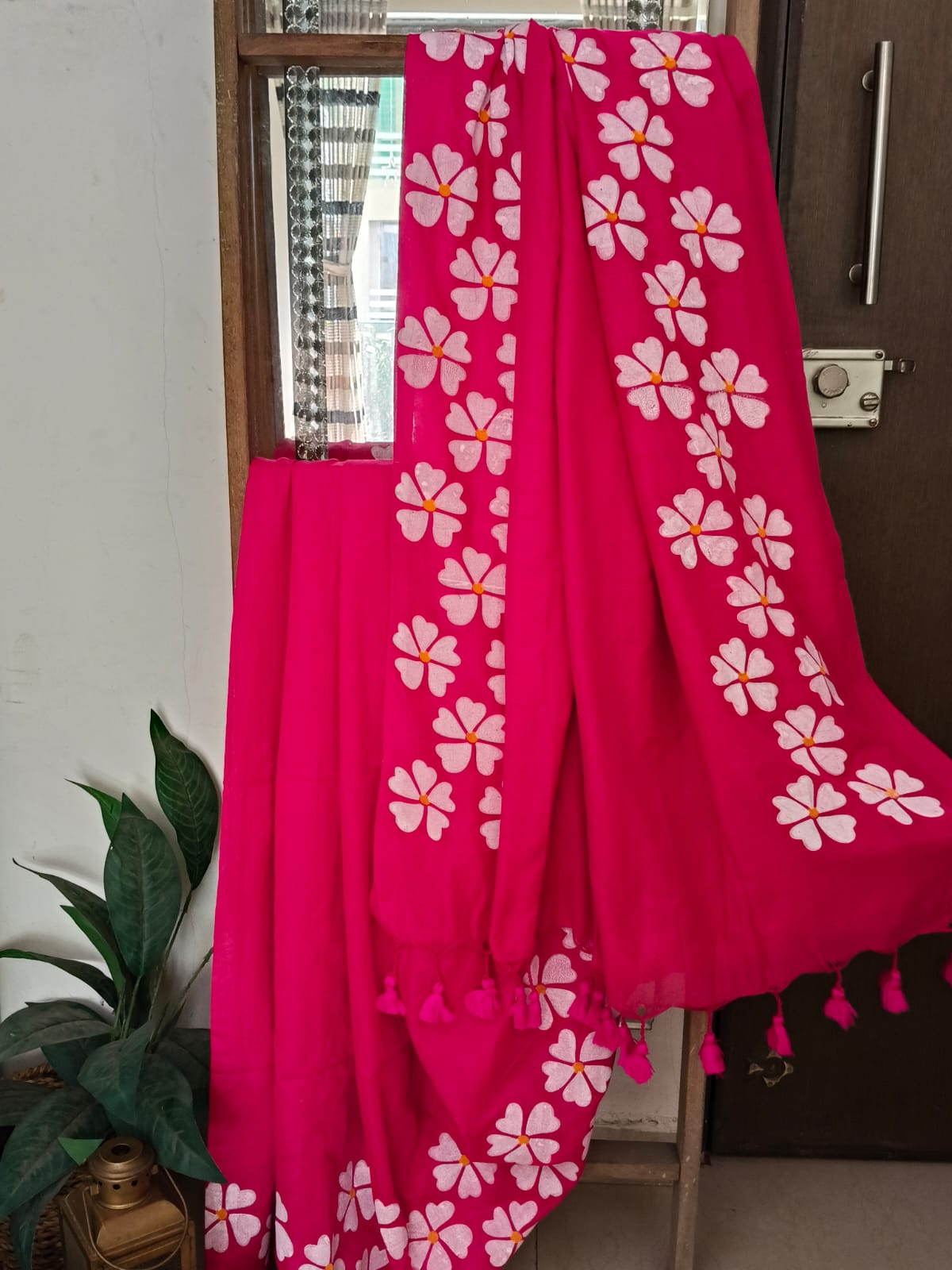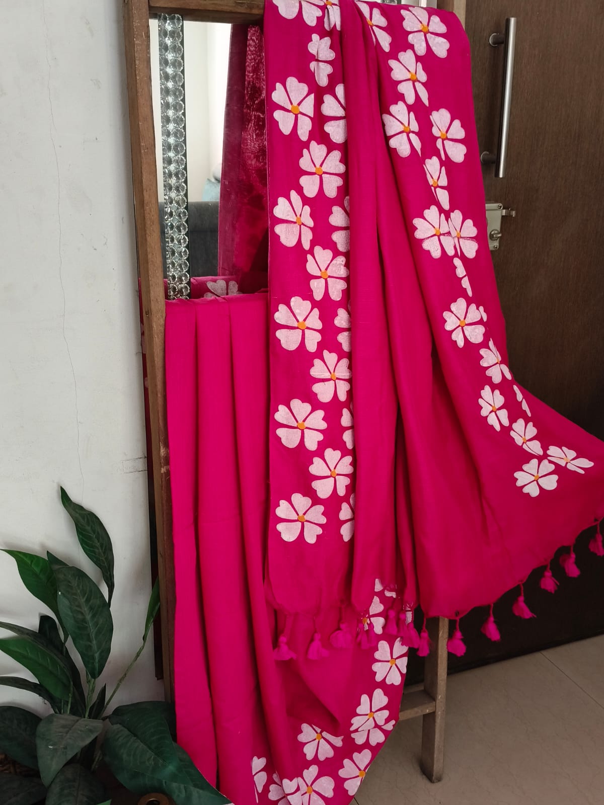 A Hot Pink Handpainted Prajakta Mul Cotton Saree. No BLouse.