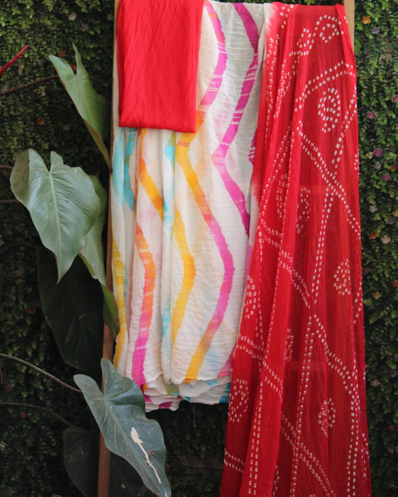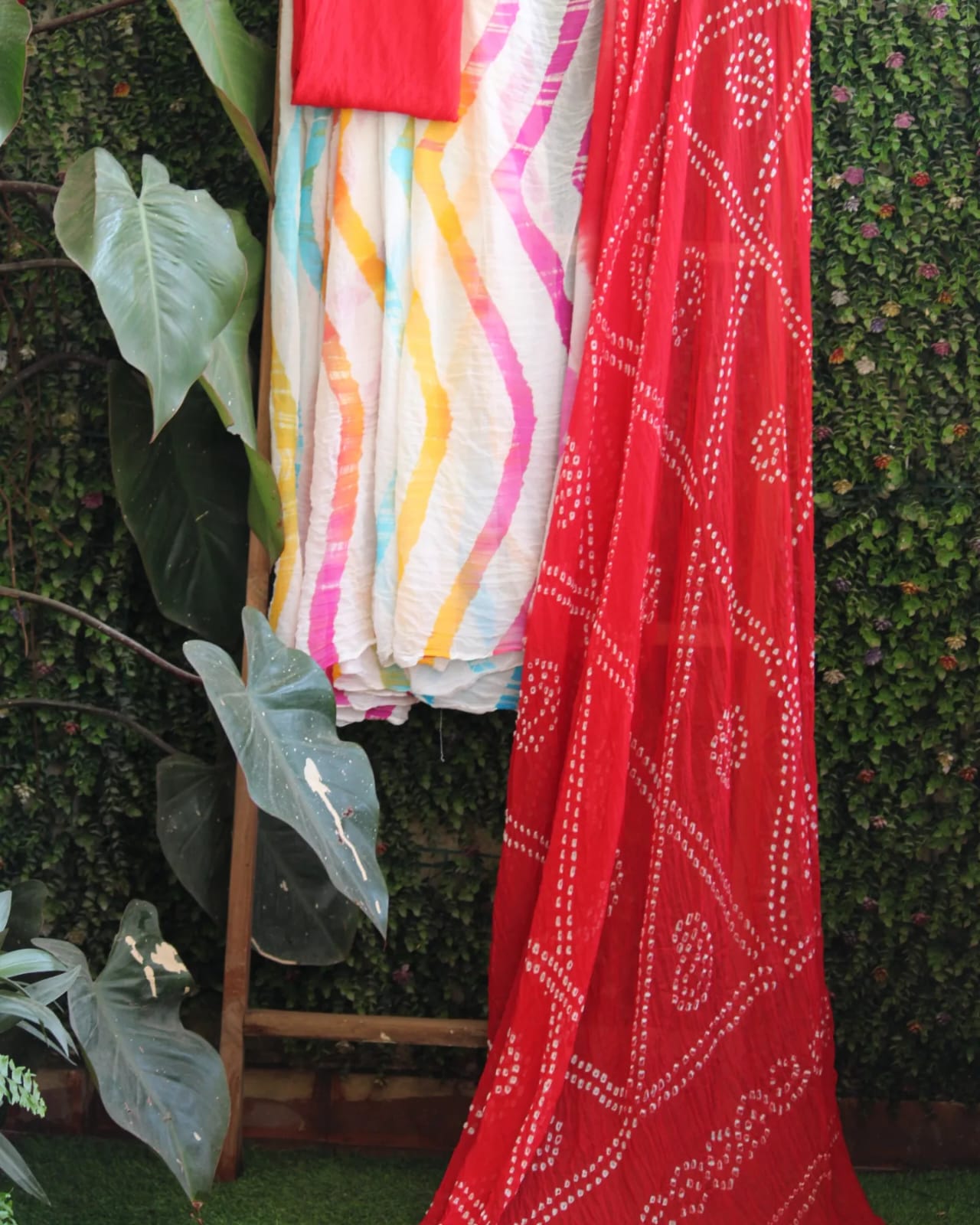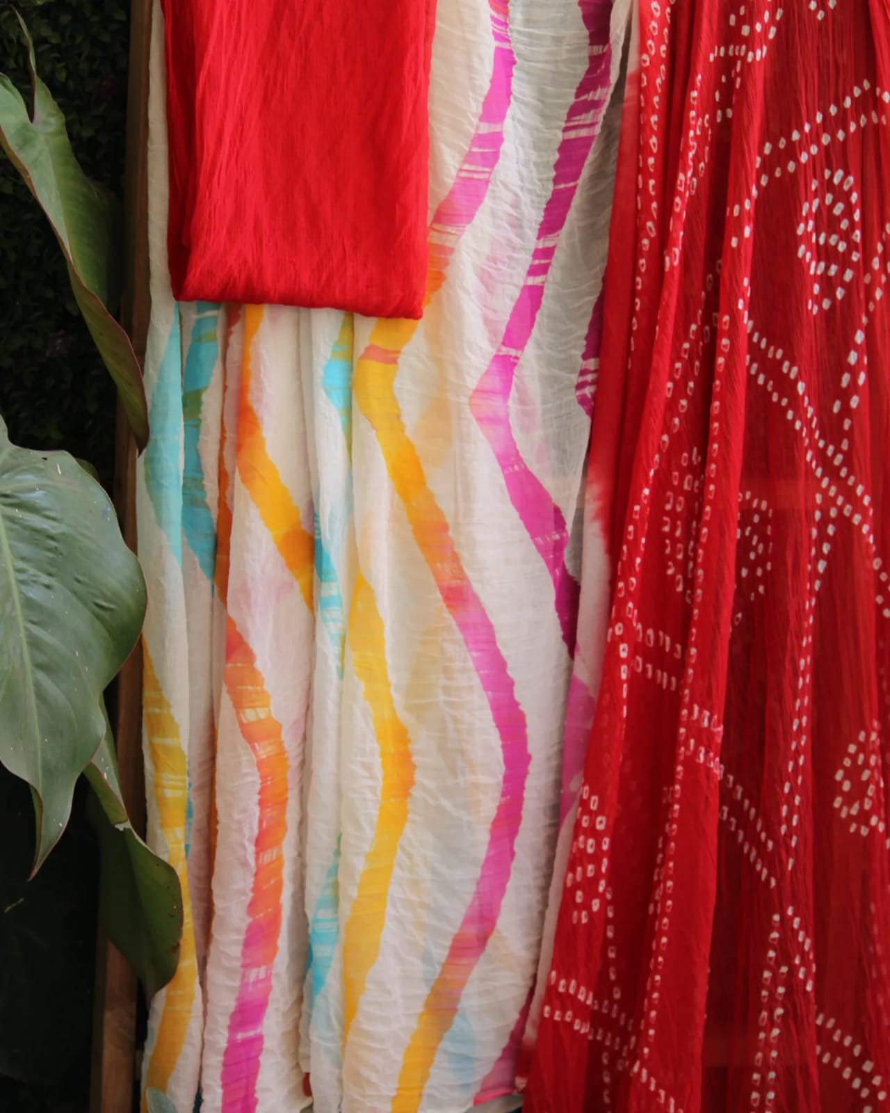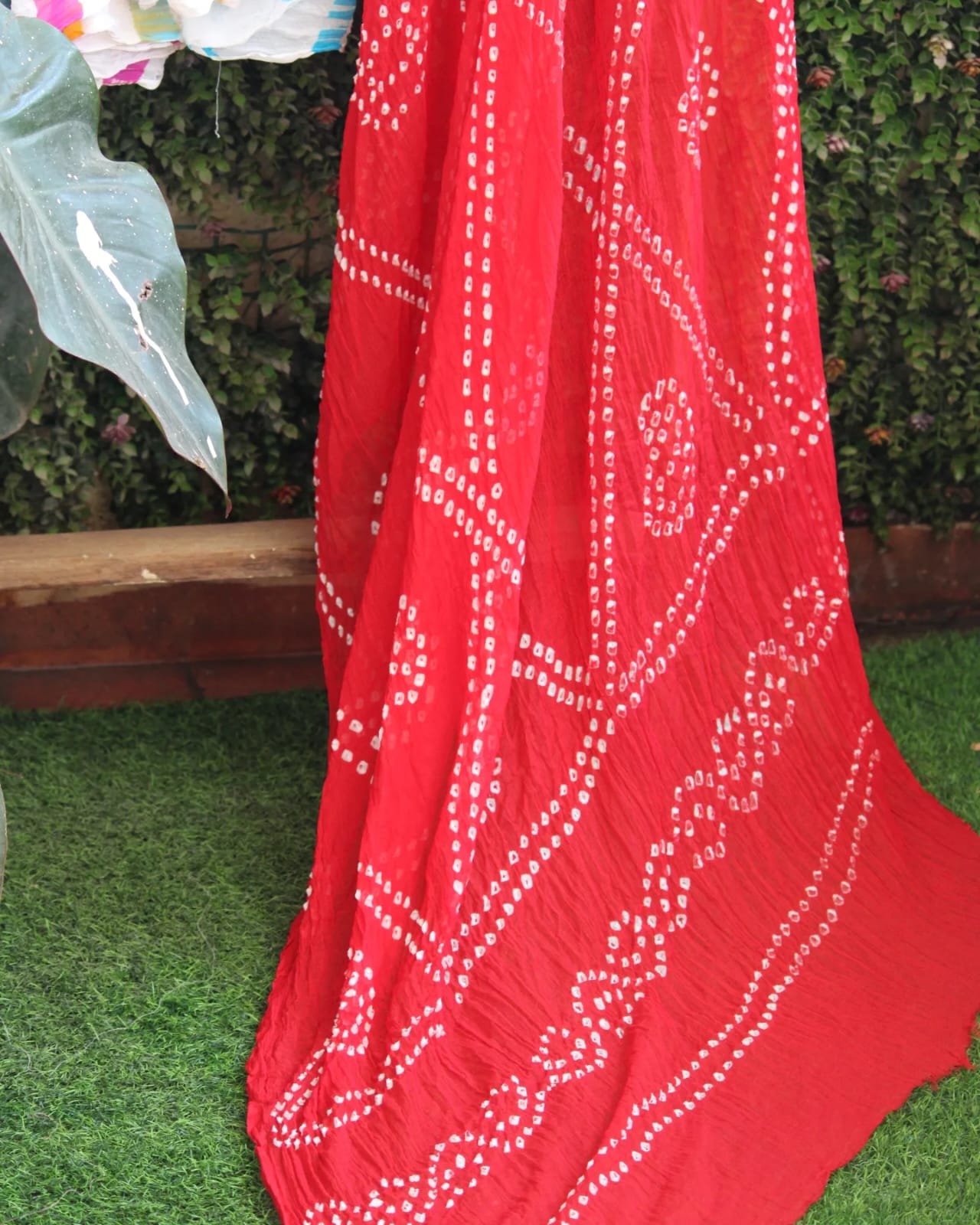 A Red Leheriya Bandhani Chiffon Hand Knotted Saree with blouse piece