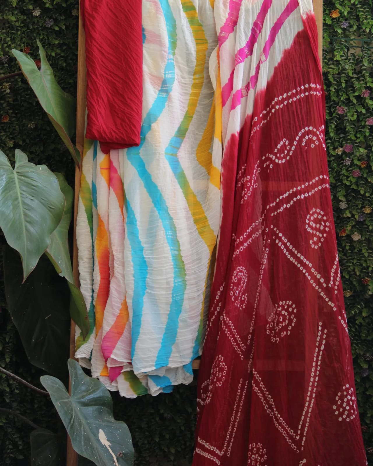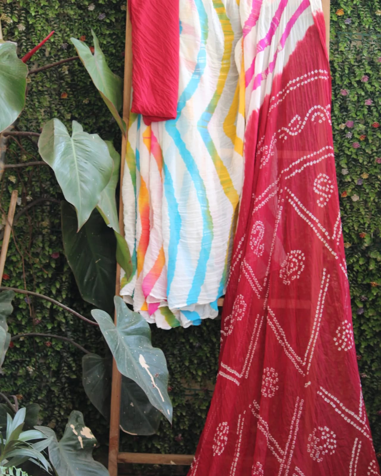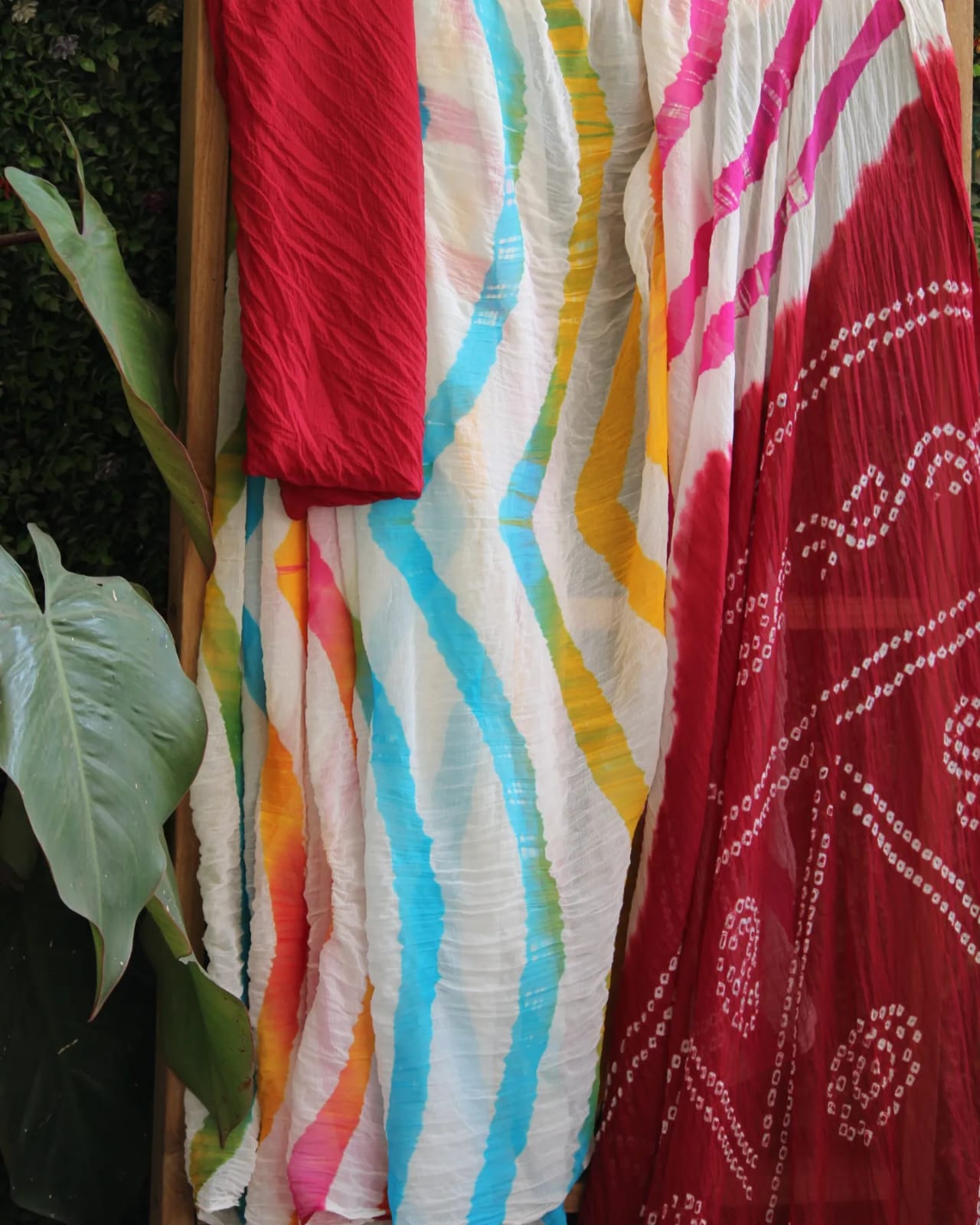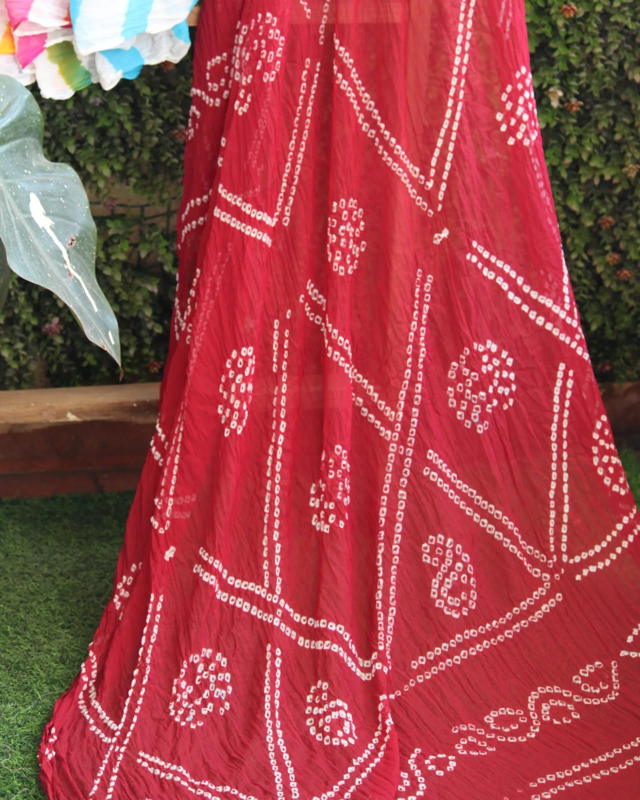 A Red Leheriya Bandhani Chiffon Hand Knotted Saree with blouse piece