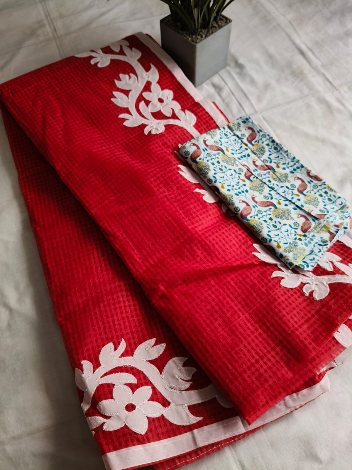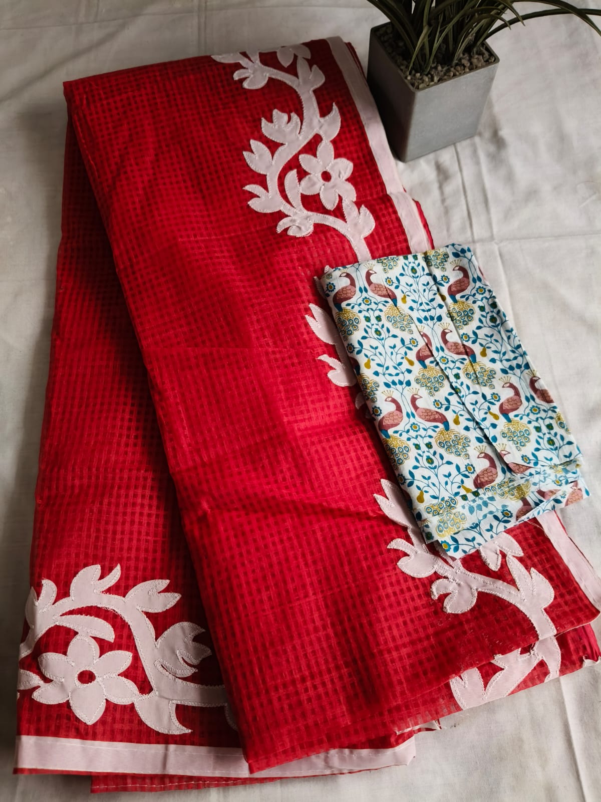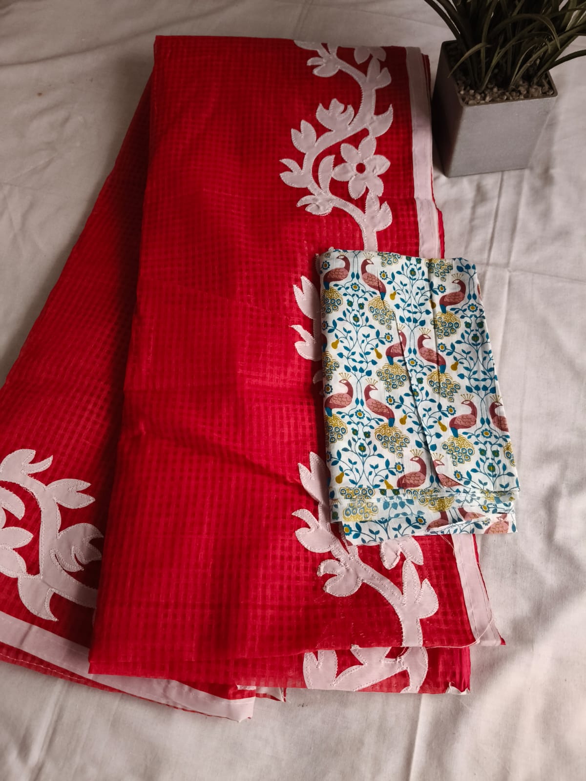 A Red Shade Applique Kota Saree paired With Additional Blouse Fabric.