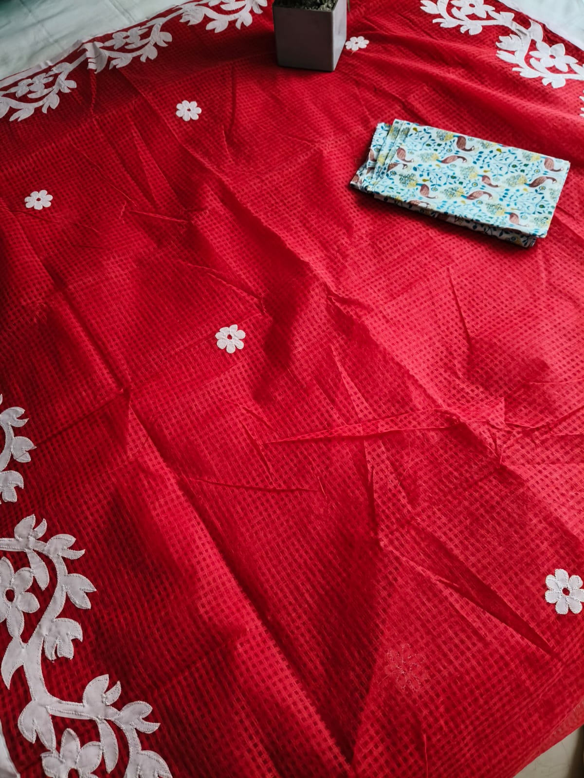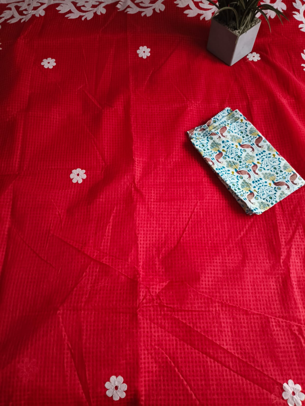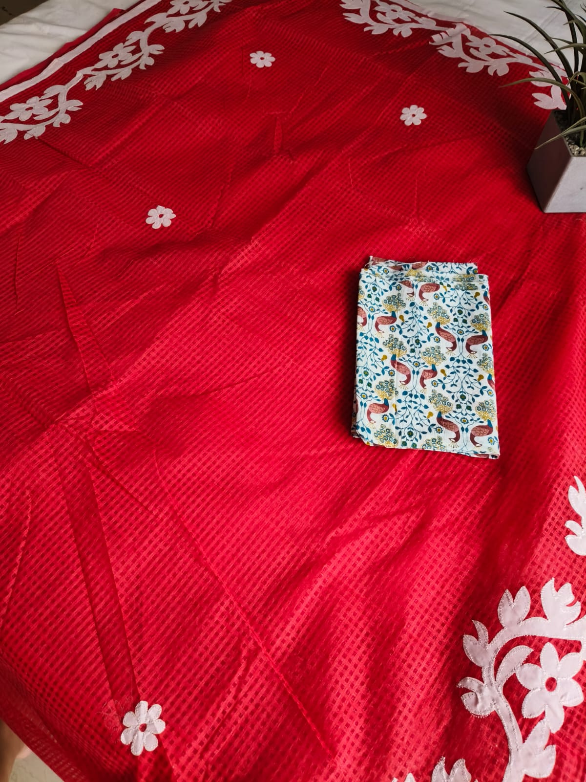 A Red Shade Applique Kota Saree paired With Additional Blouse Fabric.
