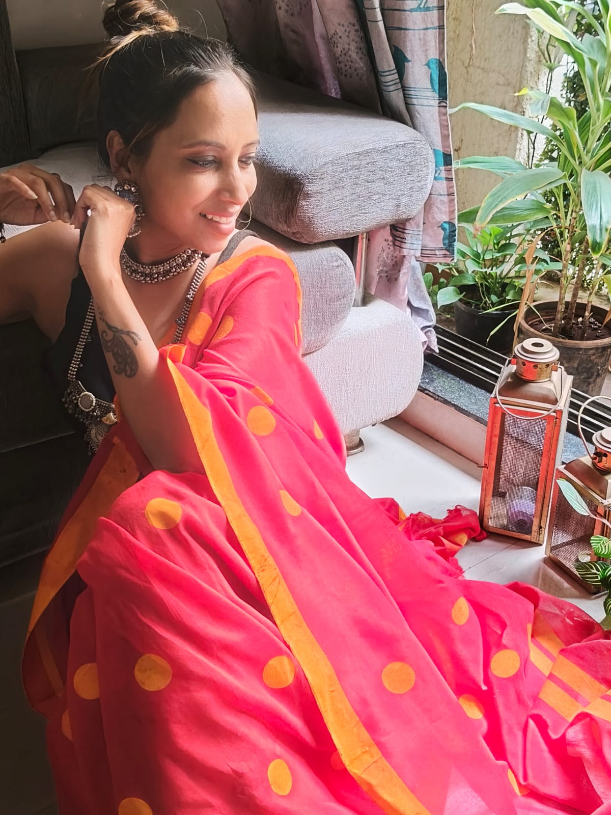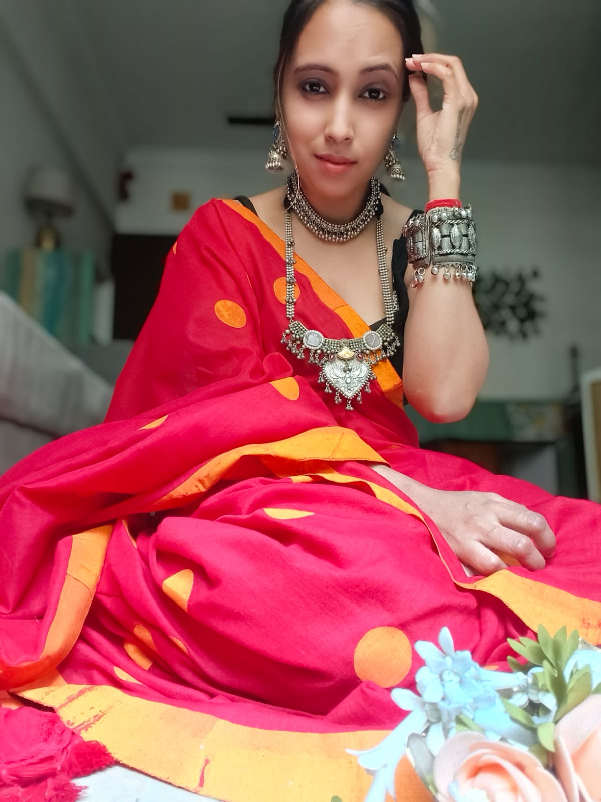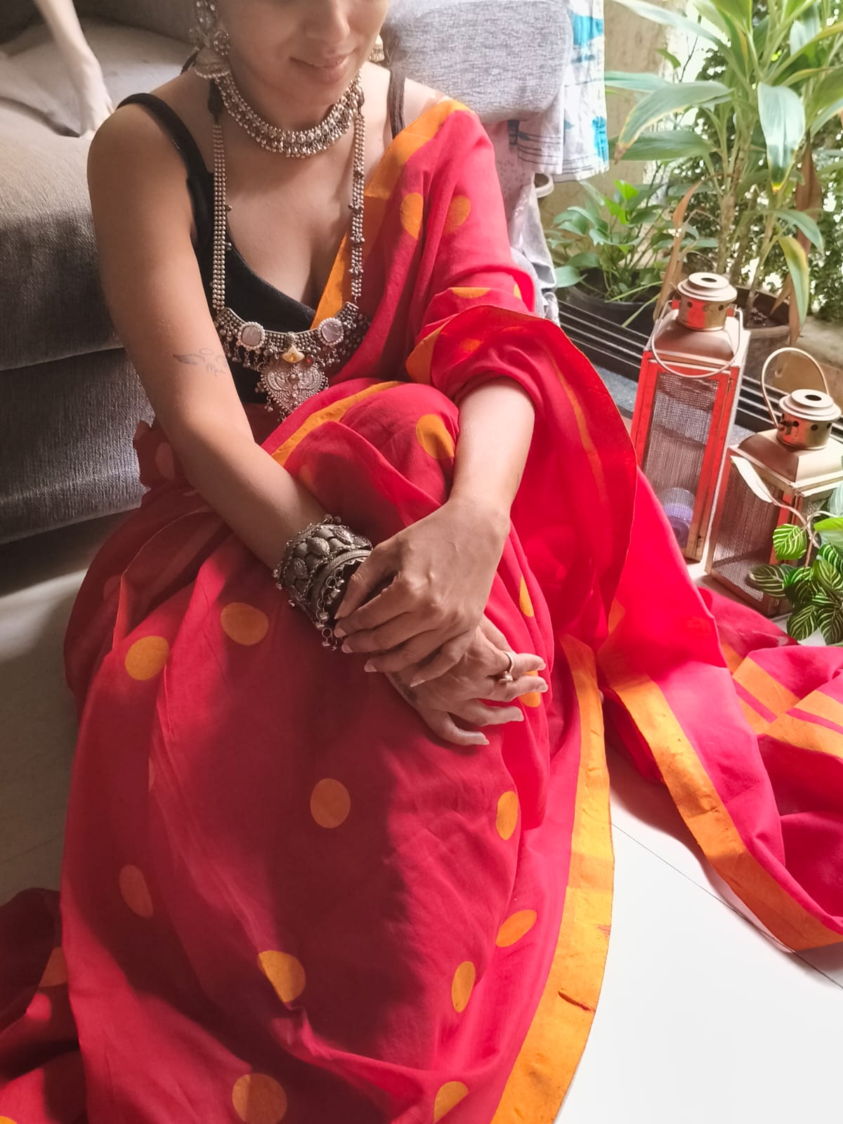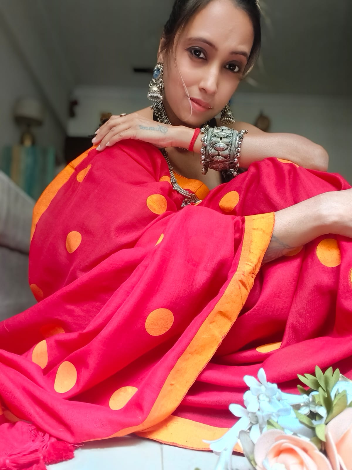 A Red & Yellow Block Printed with Multicoloured Polka Dots Cotton SareeĀ .Comes with Additional Blouse Fabric.