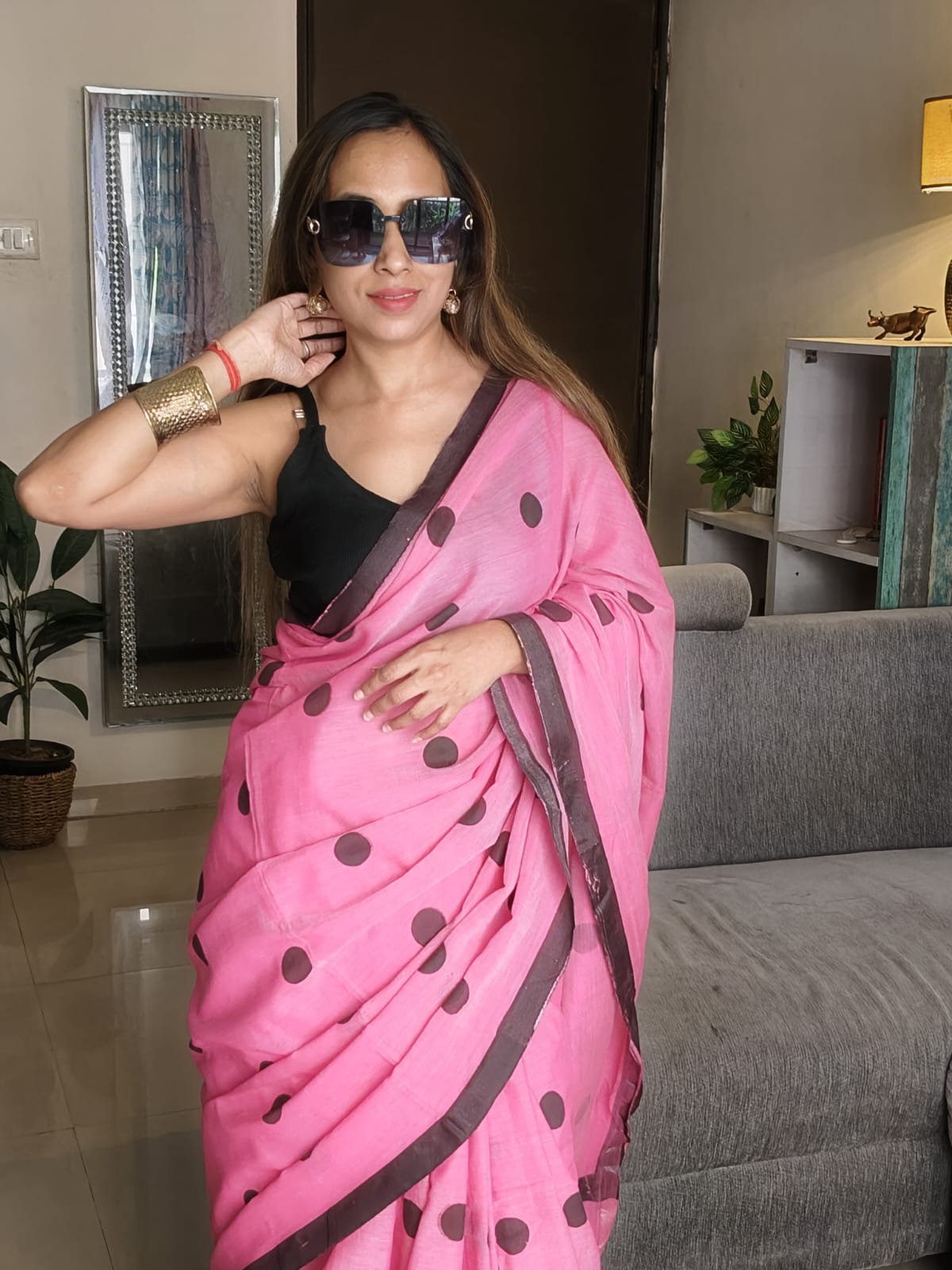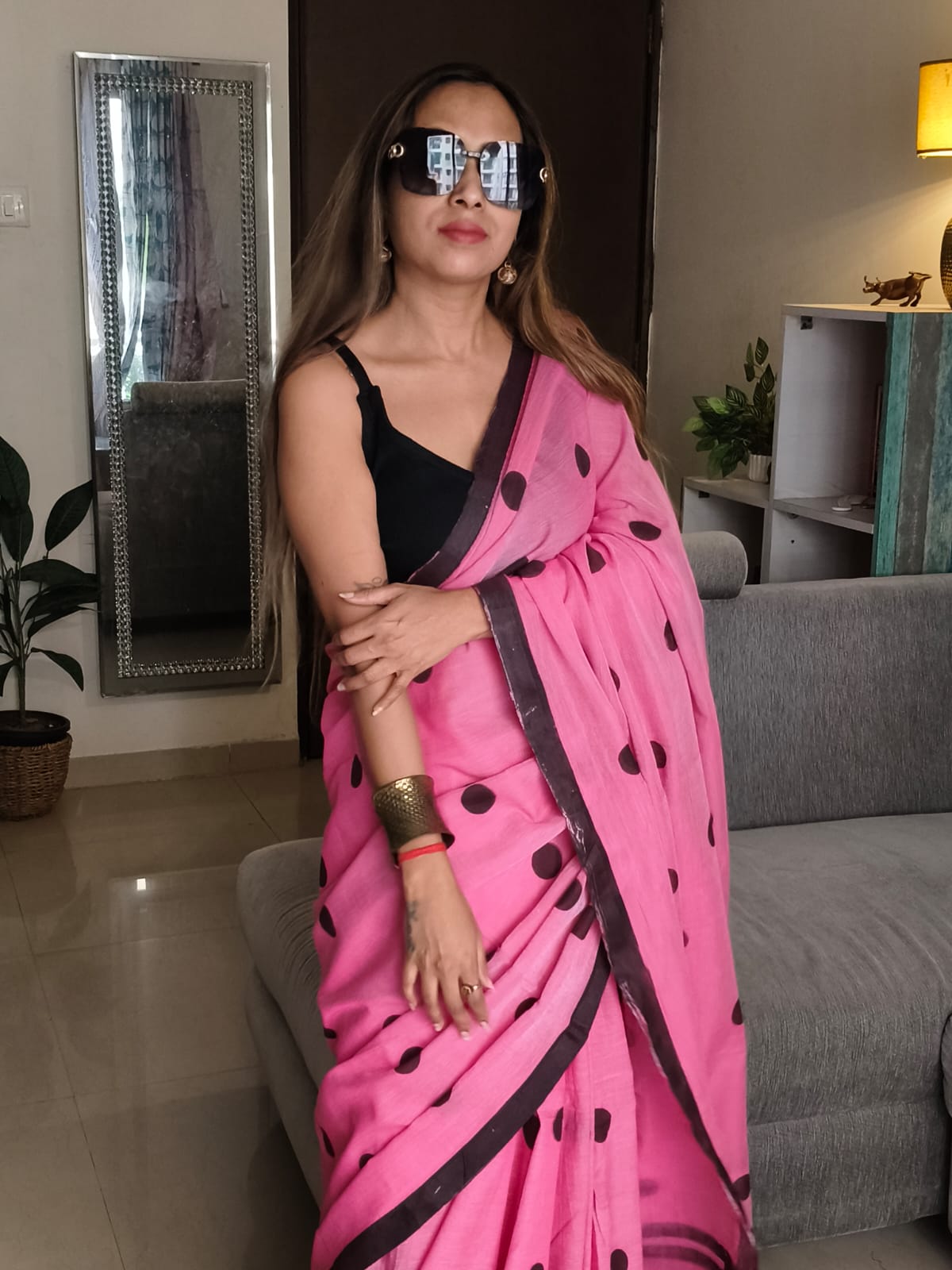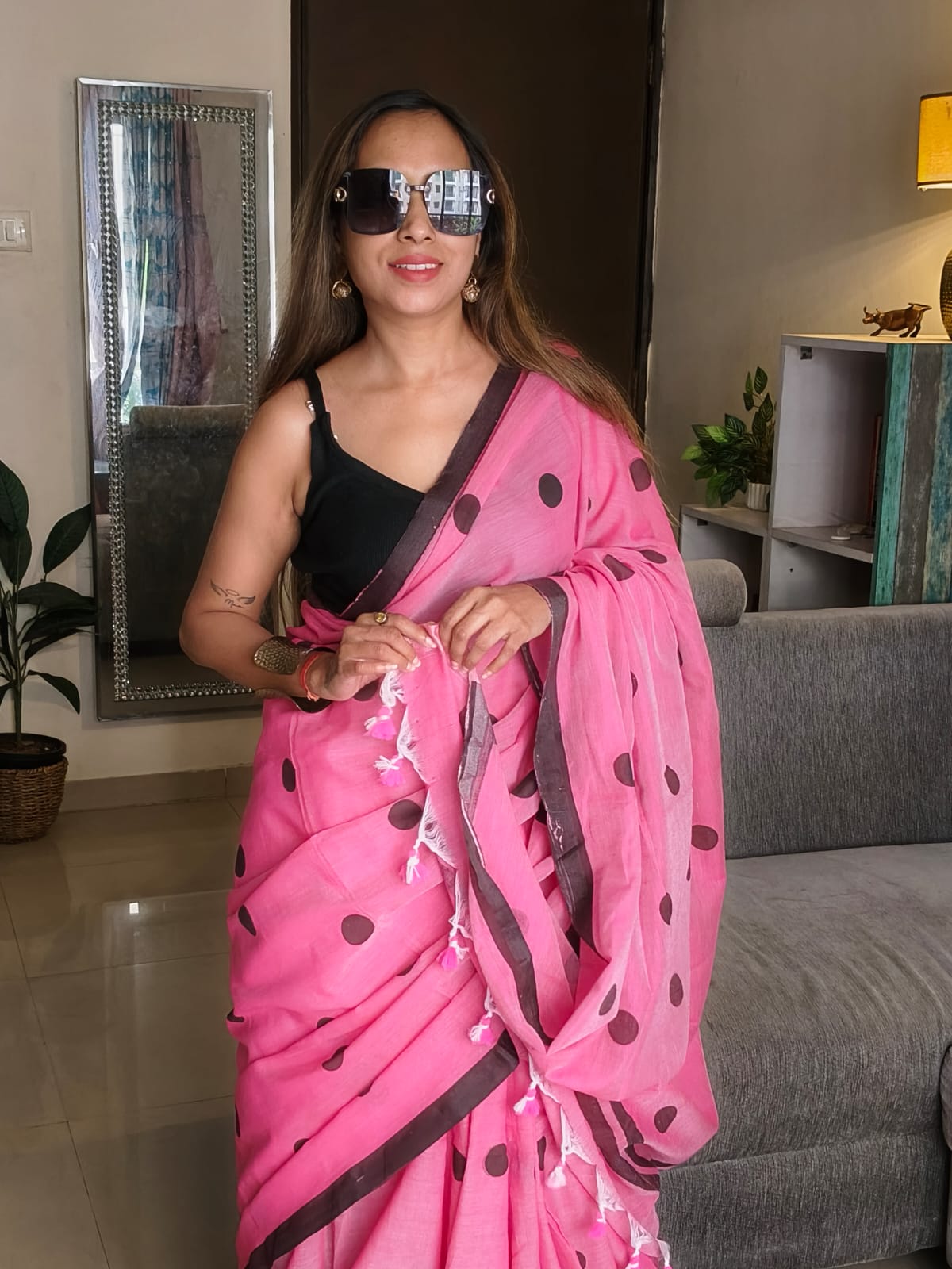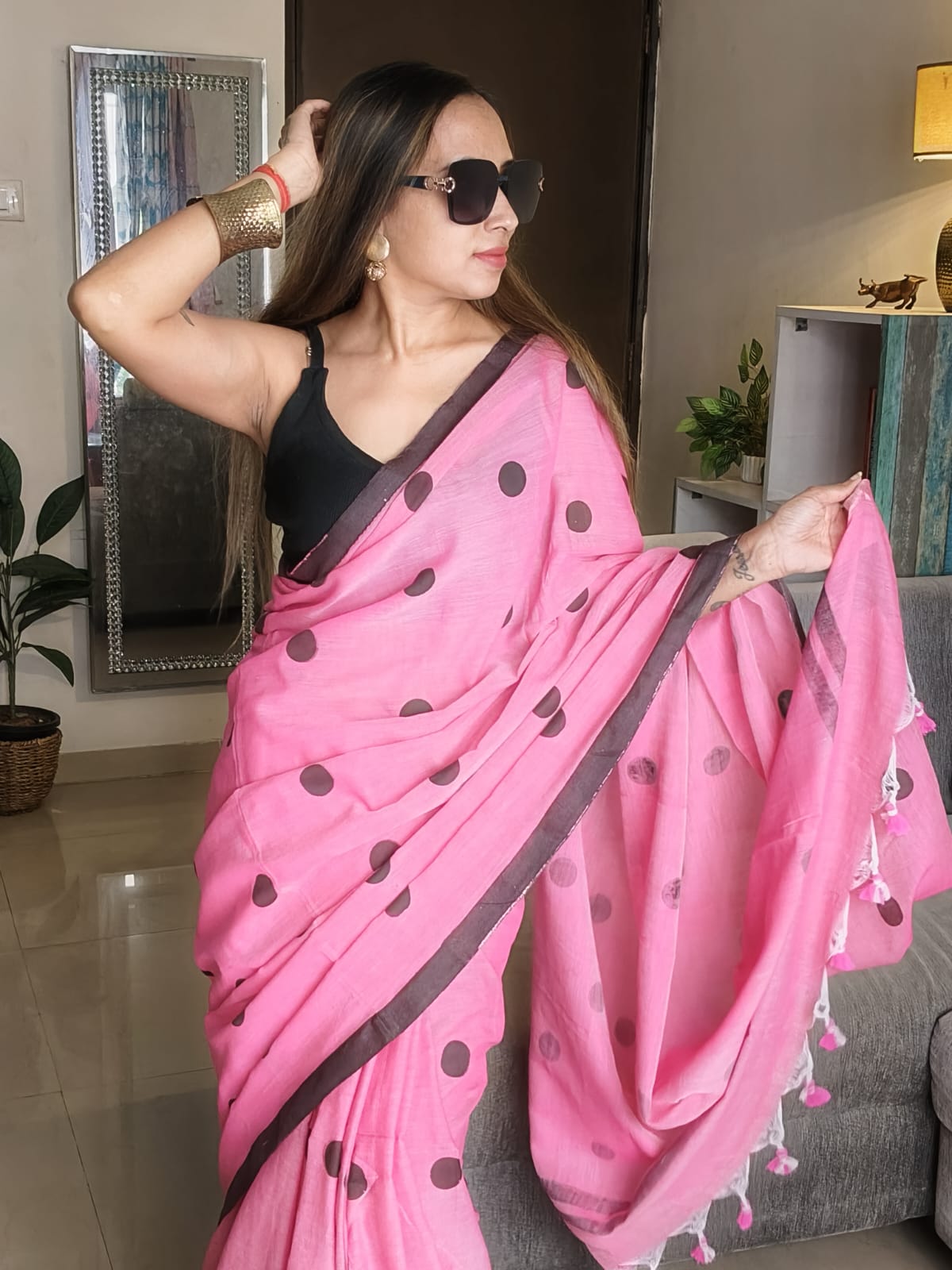 A Mush Pink Block Printed with Multicoloured Polka Dots Cotton SareeĀ .Comes with Additional Blouse Fabric.