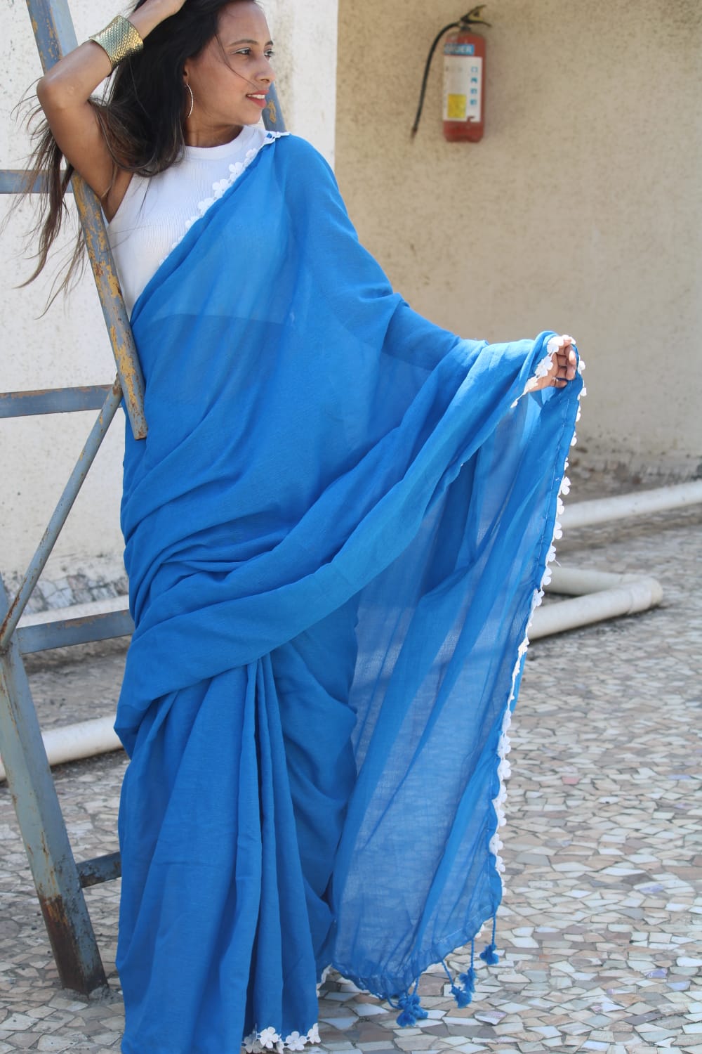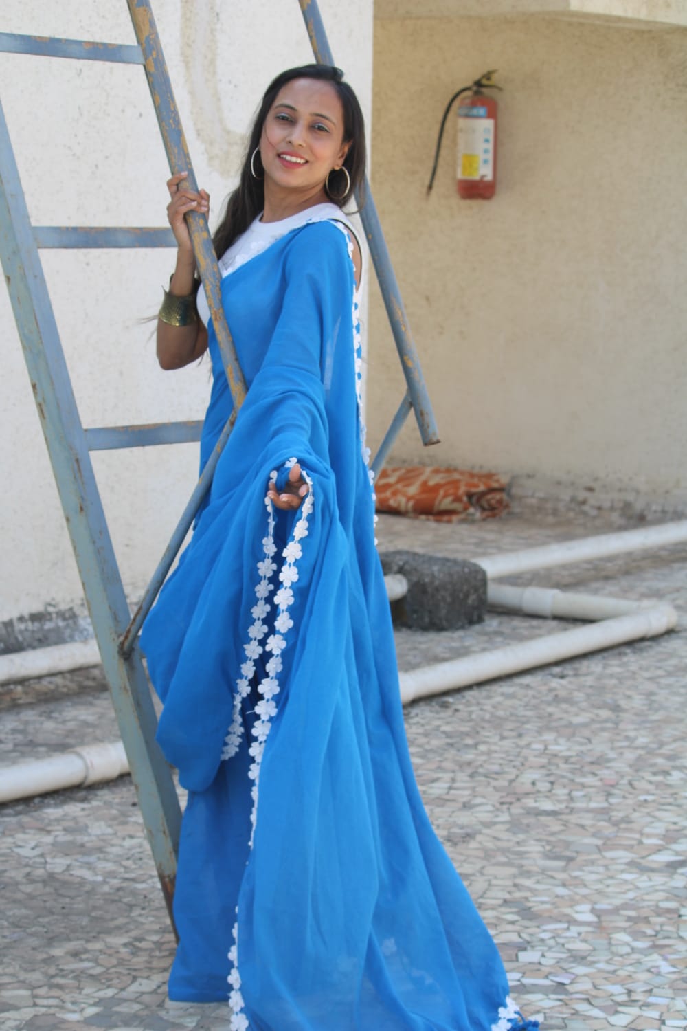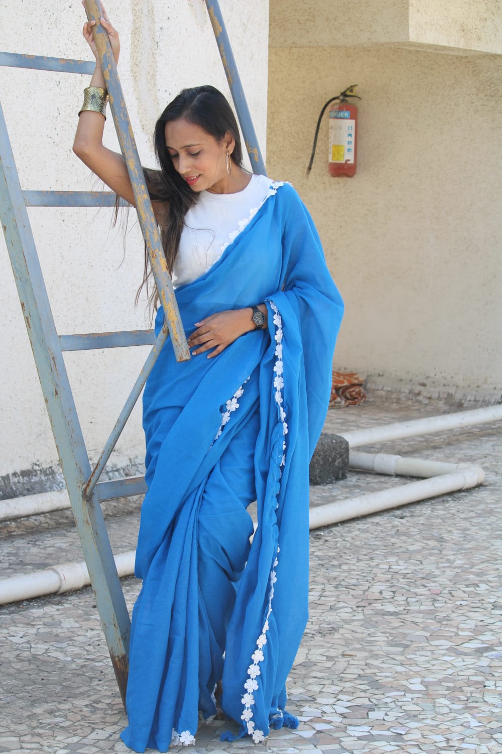An Azure Blue Khadi Cotton Saree Cutwork Lace Border . Comes without Blouse.