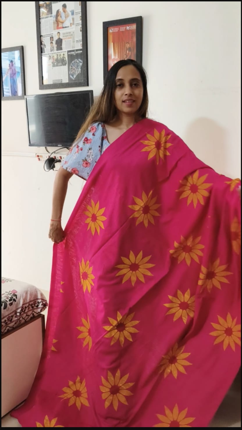 A Hot Pink Shade Handpainted Sunflower Khadi Cotton SareeĀ . Comes with Running Blouse Piece.