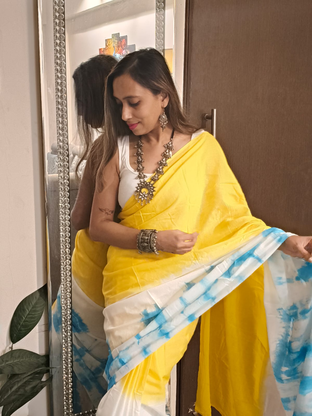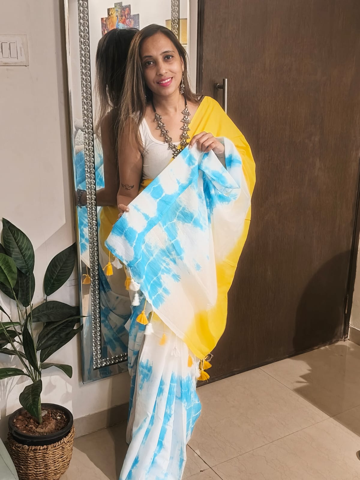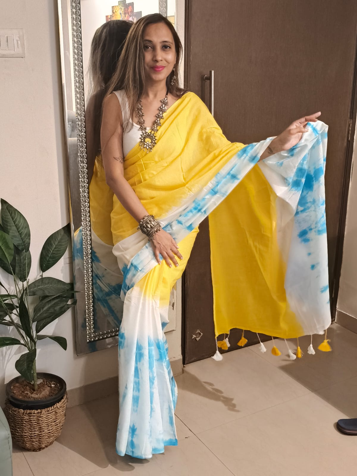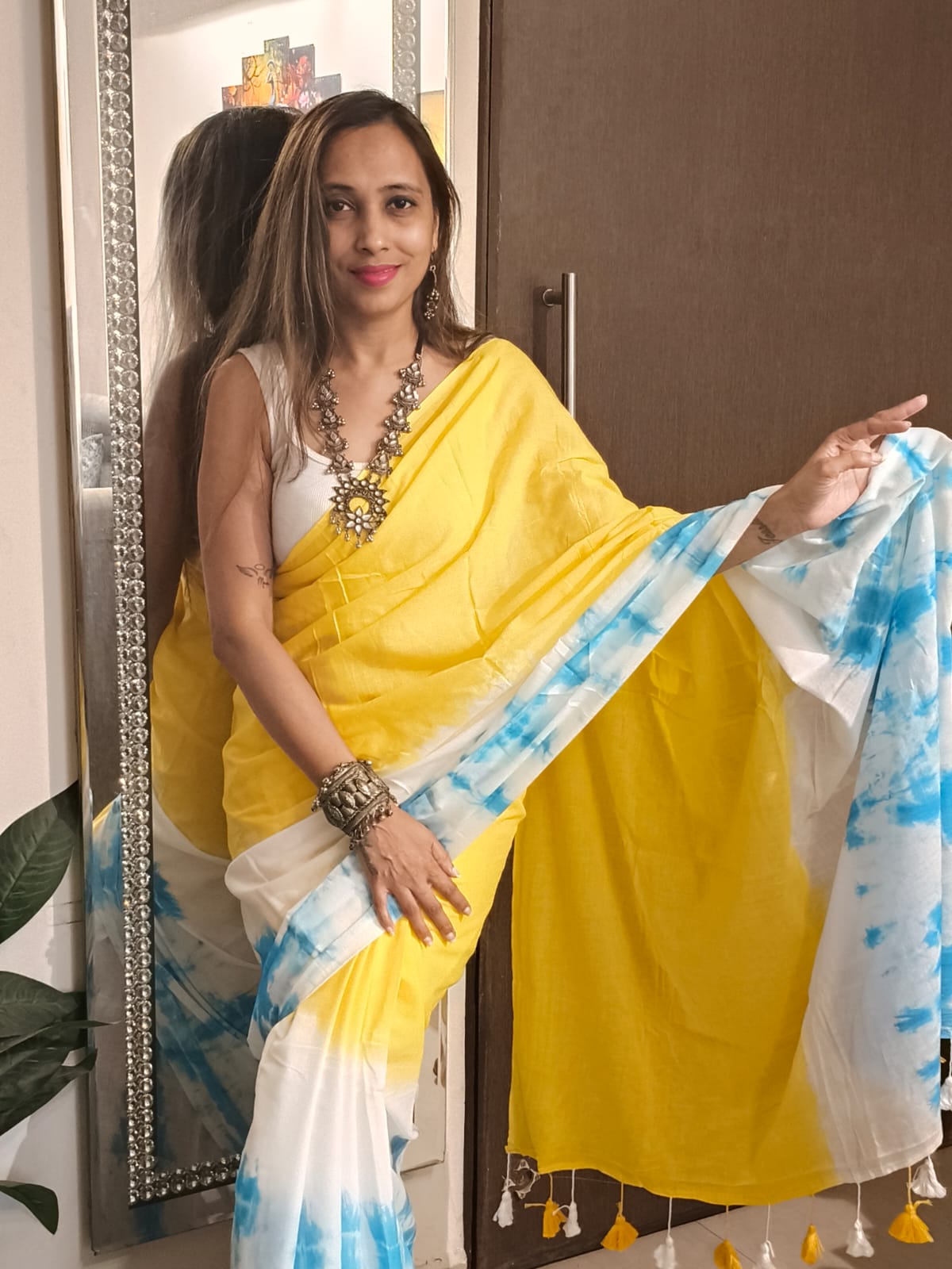 A Yellow With Turquoise Tie and dye Mul Cotton Shibori Saree. Additional Ready To Wear Blouse.