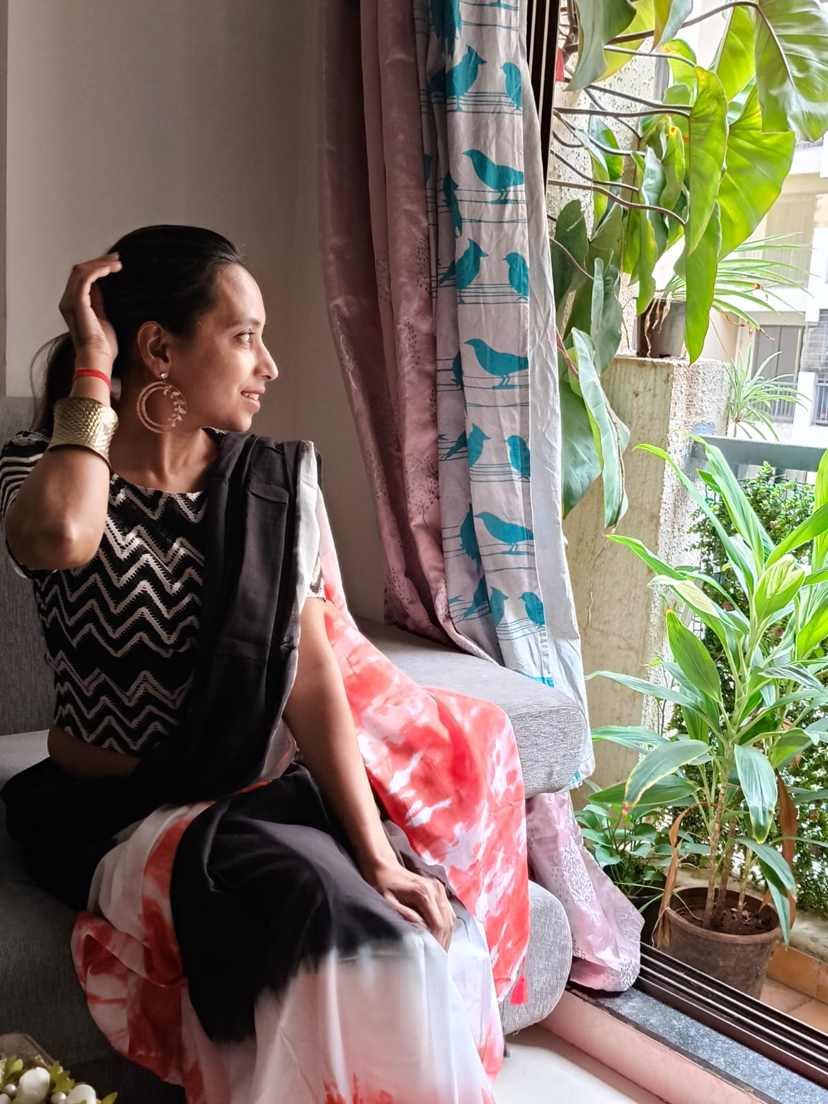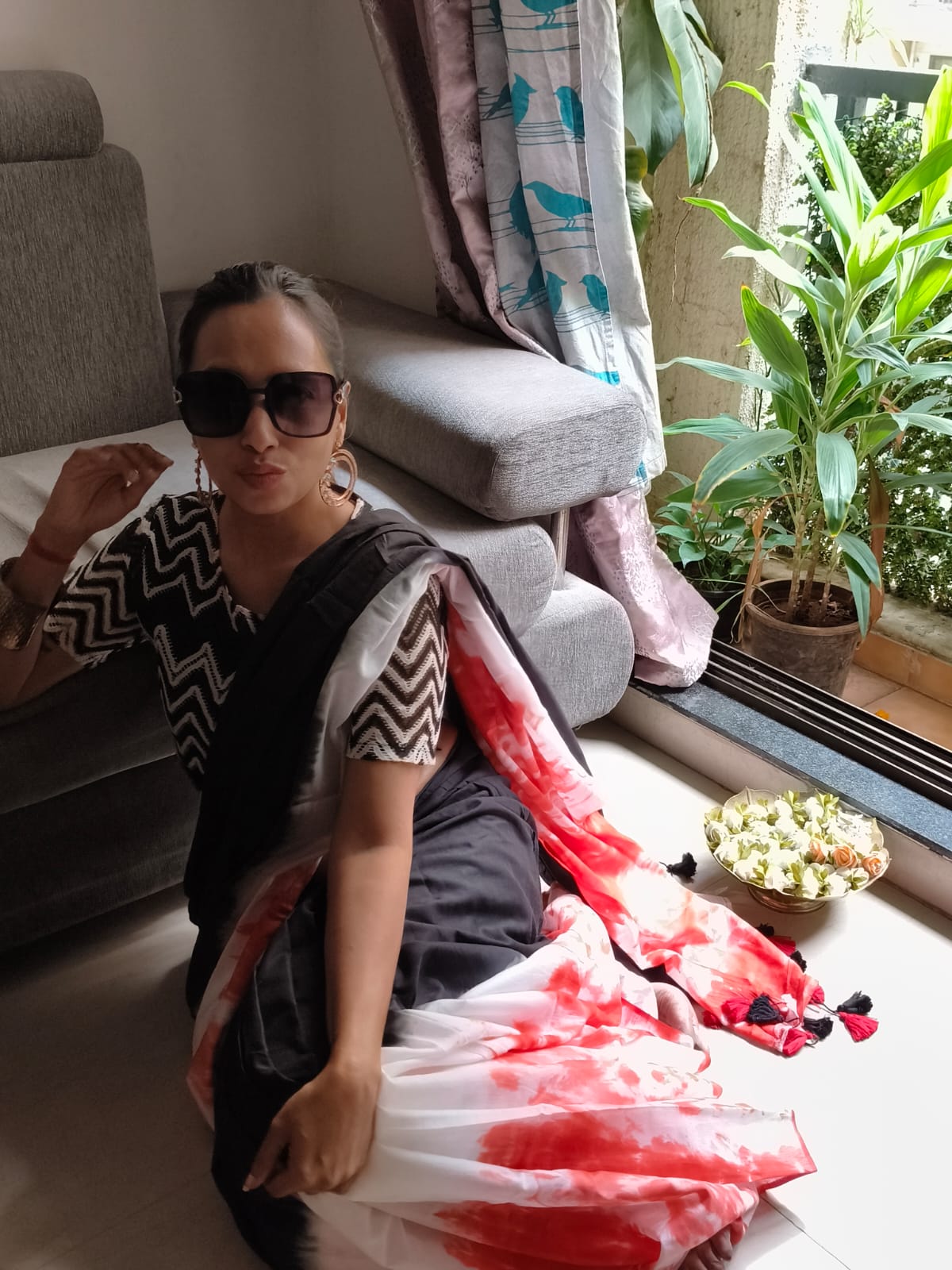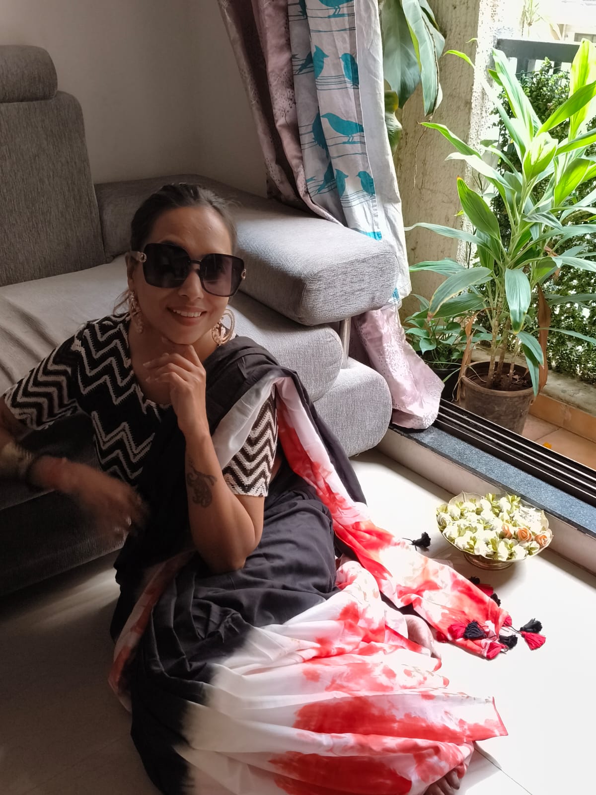 A Black & Orange Shade Tie and dye Mul Cotton Shibori Saree. Additional Ready To Wear Blouse.