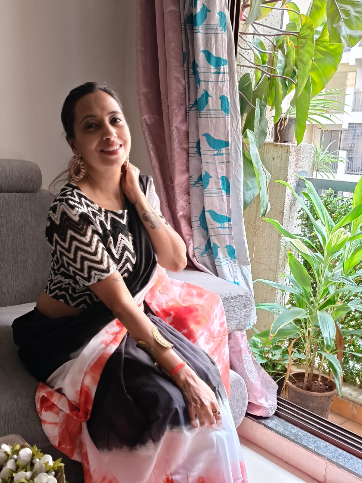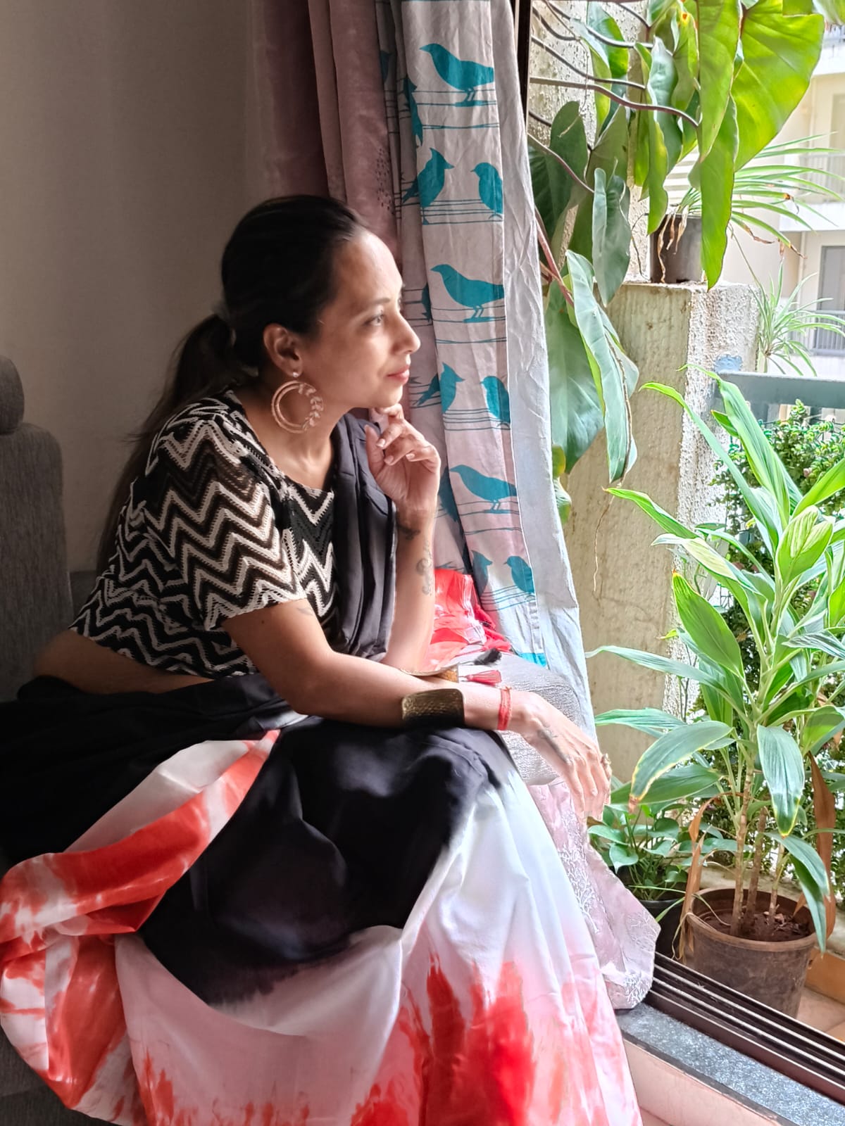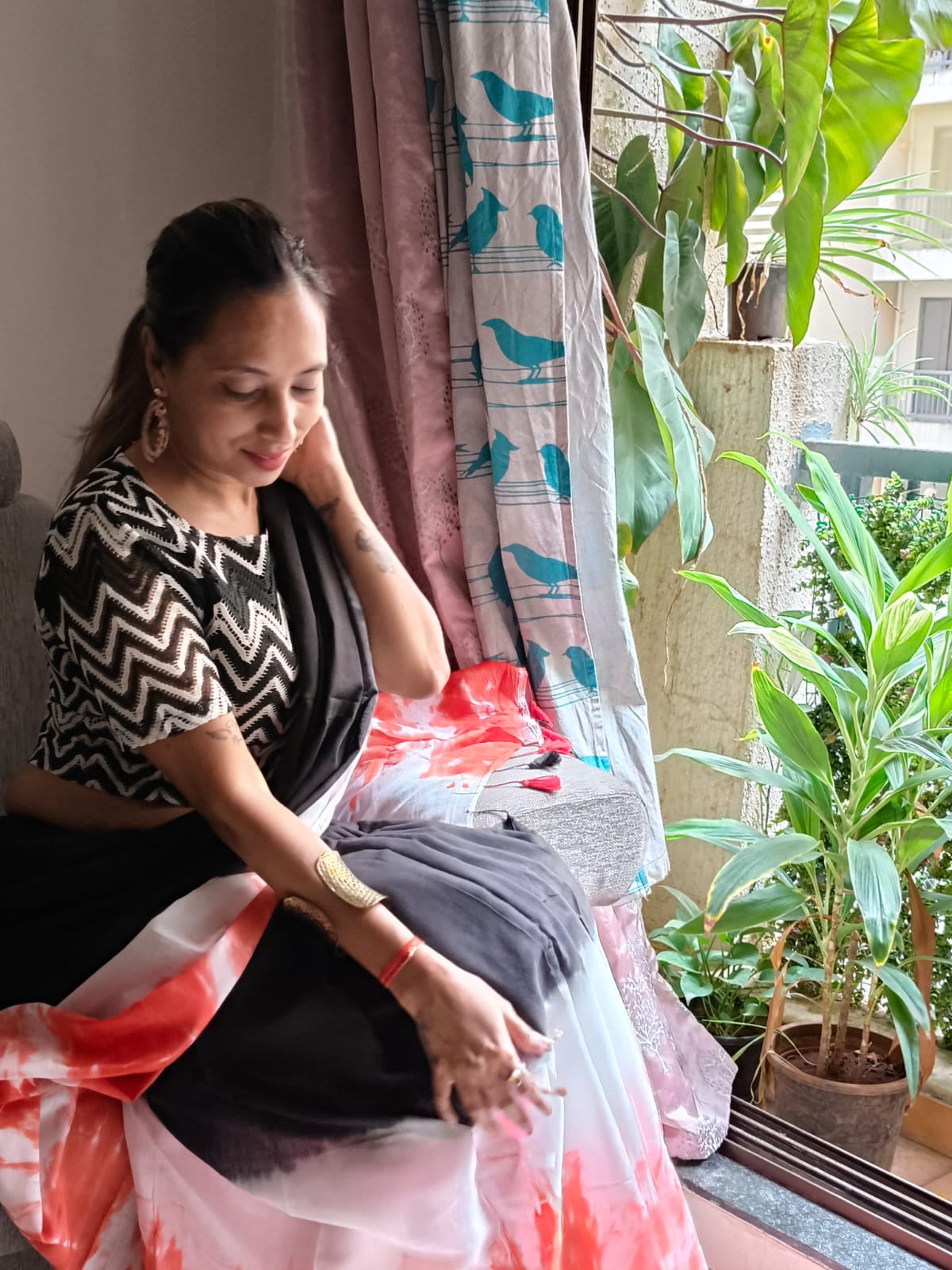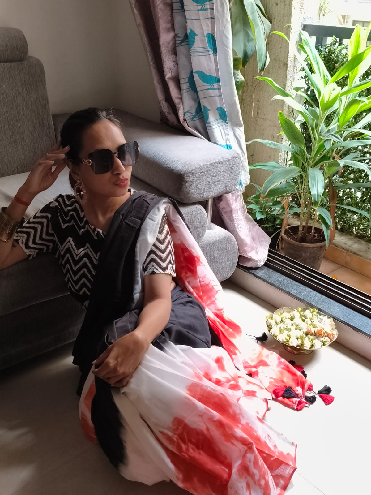 A Black & Orange Shade Tie and dye Mul Cotton Shibori Saree. Additional Ready To Wear Blouse.