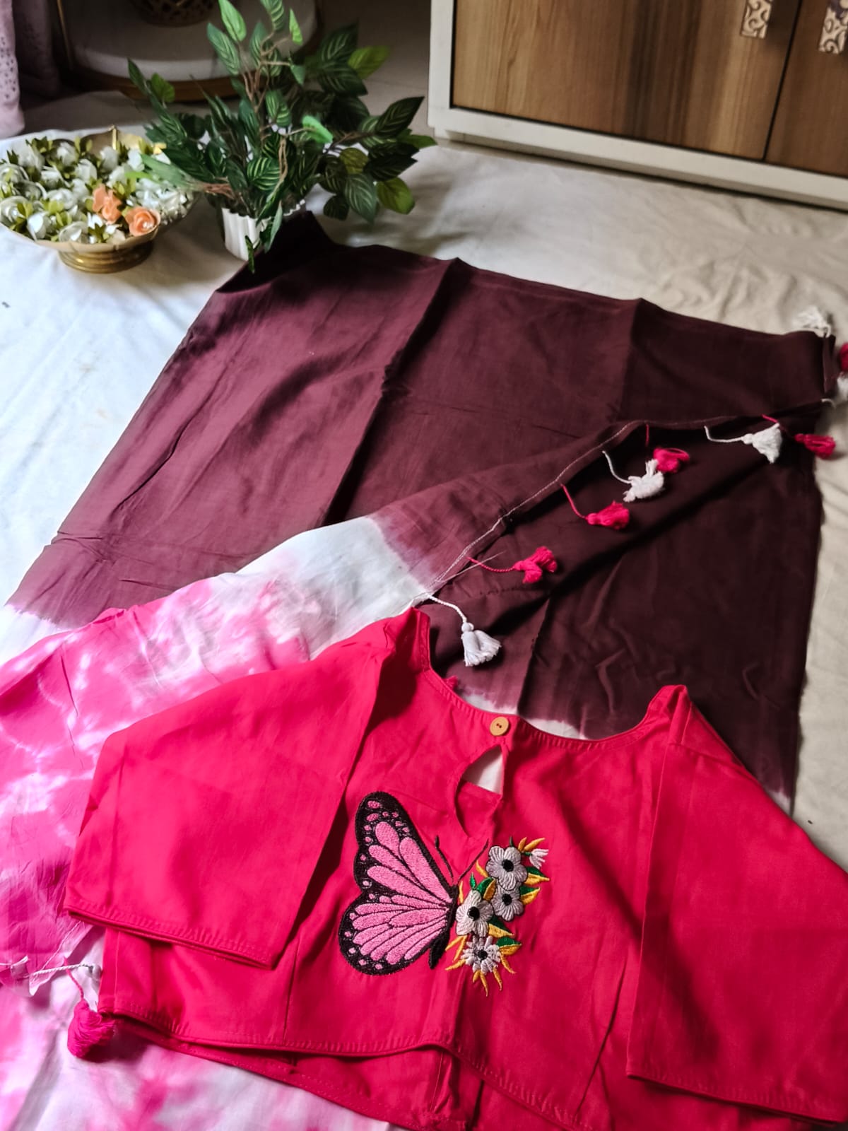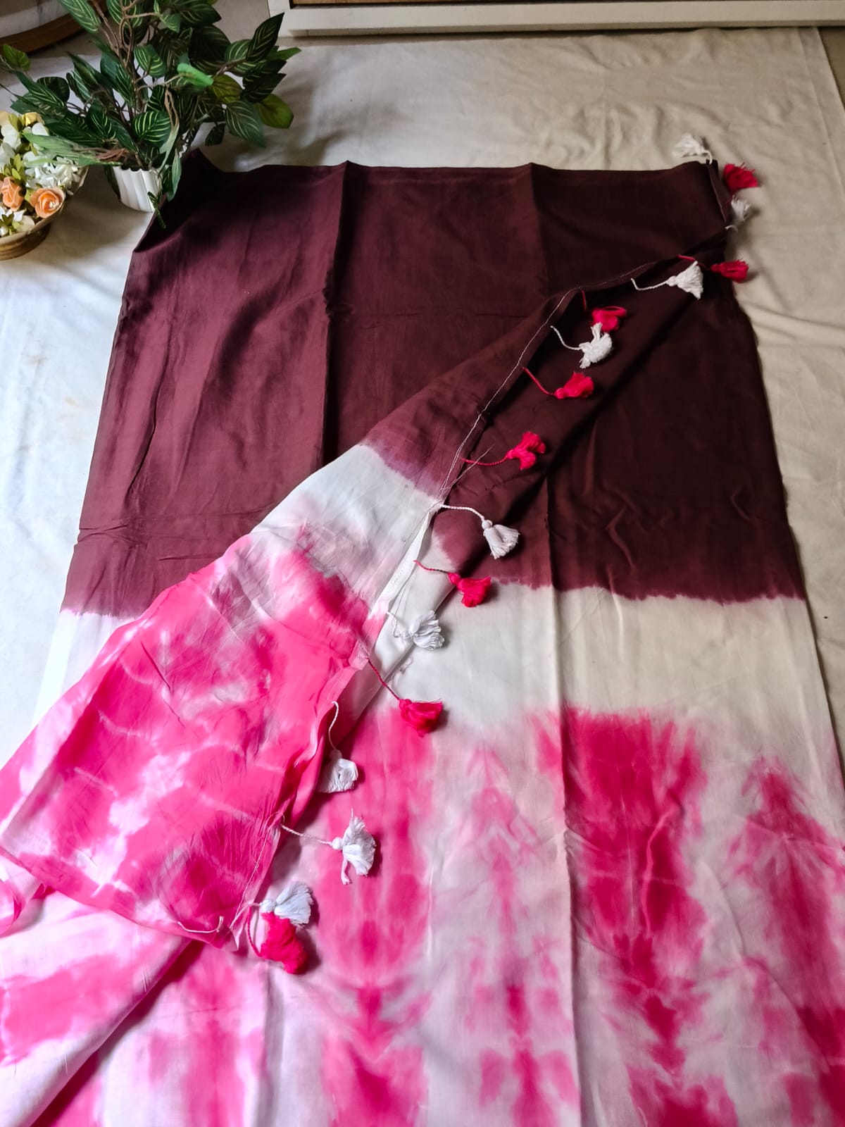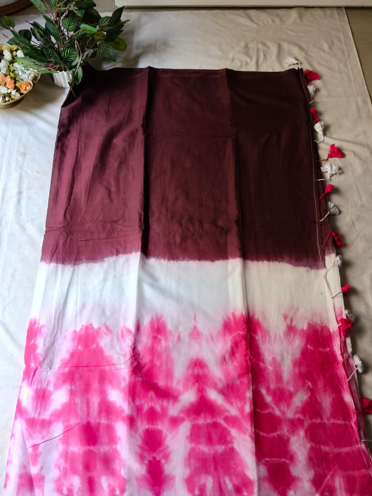 A Wine & Pink Shade Tie and dye Mul Cotton Shibori Saree. Additional Ready To Wear Blouse.