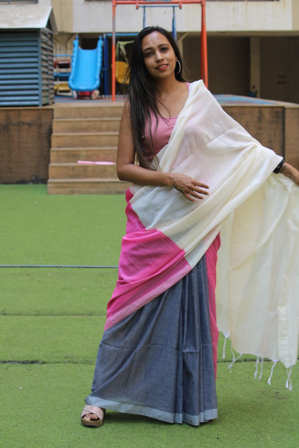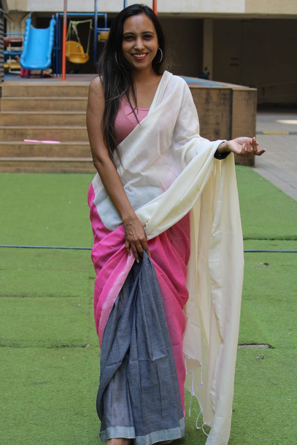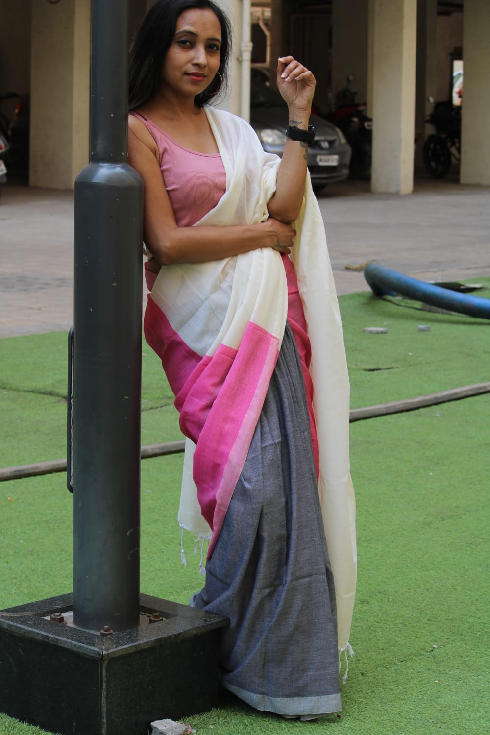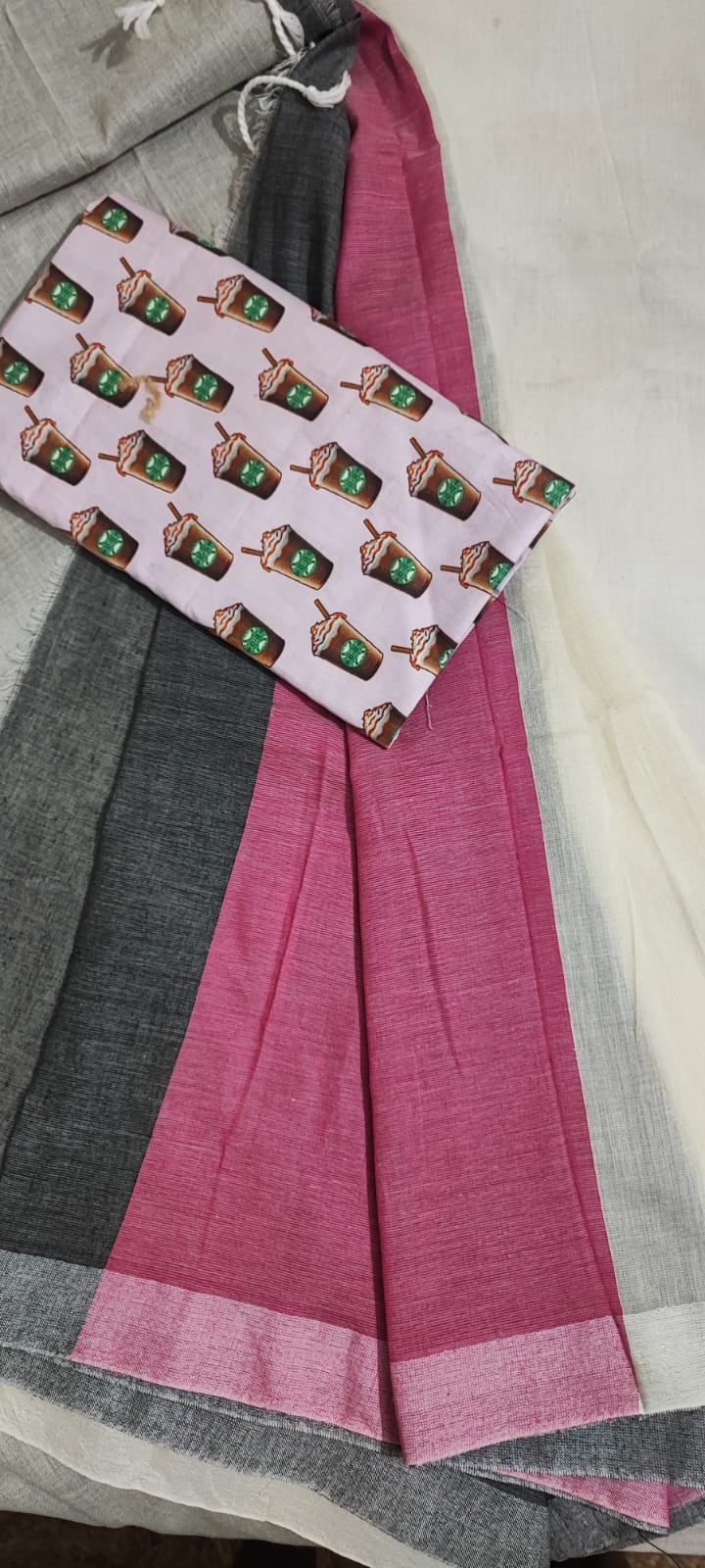 A White, Pink, Grey Cotton Handloom Saree which comes with Additional Blouse Fabric